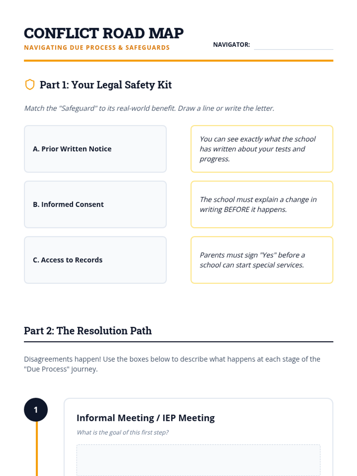 Students learn about the procedural safeguards that protect family and student rights. They map out the process for resolving disagreements through the lens of Due Process.