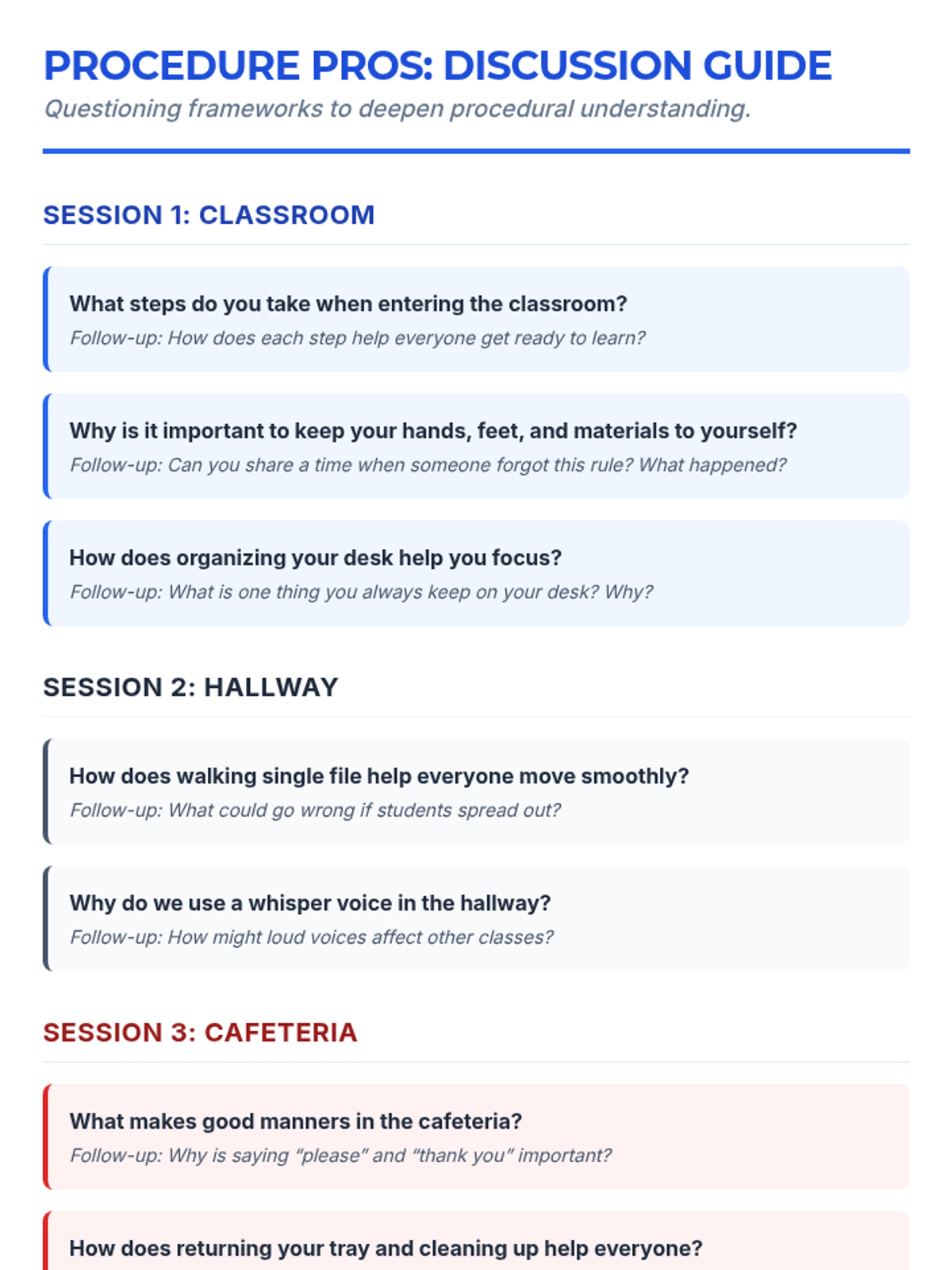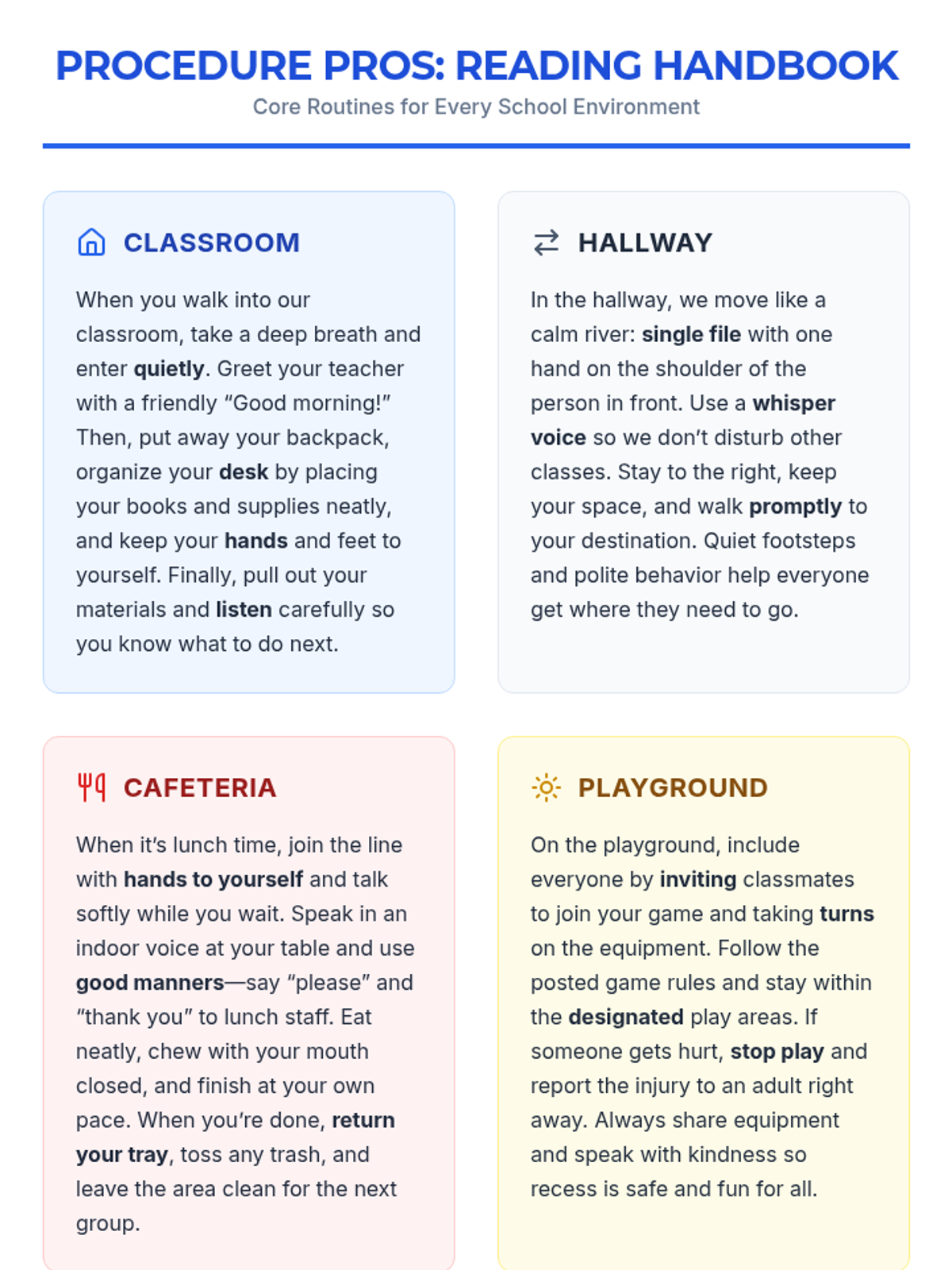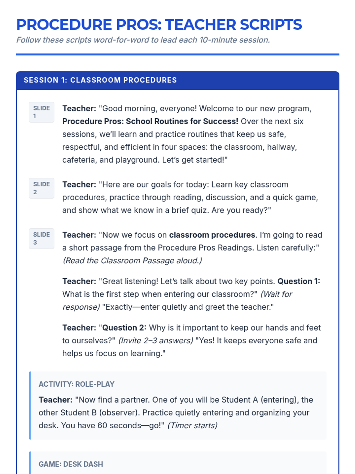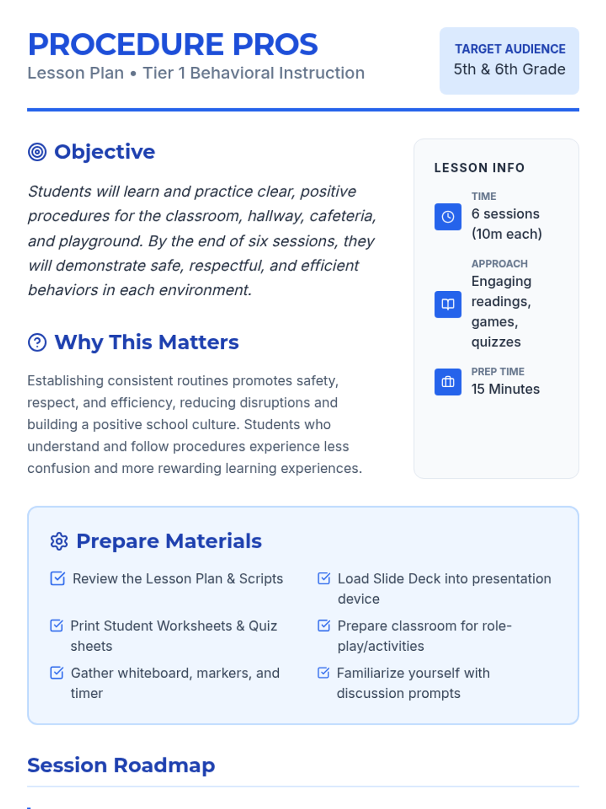 This lesson covers essential routines for the classroom, hallway, cafeteria, and playground to ensure a safe and efficient school environment across six 10-minute sessions.