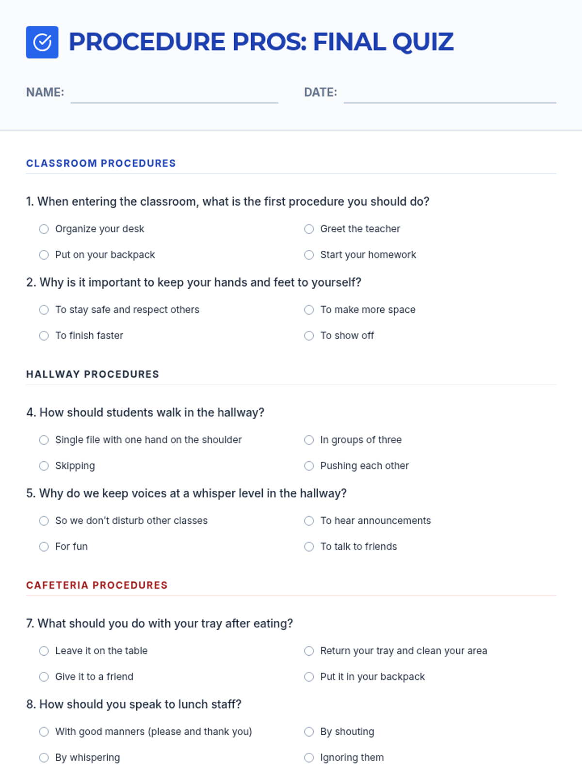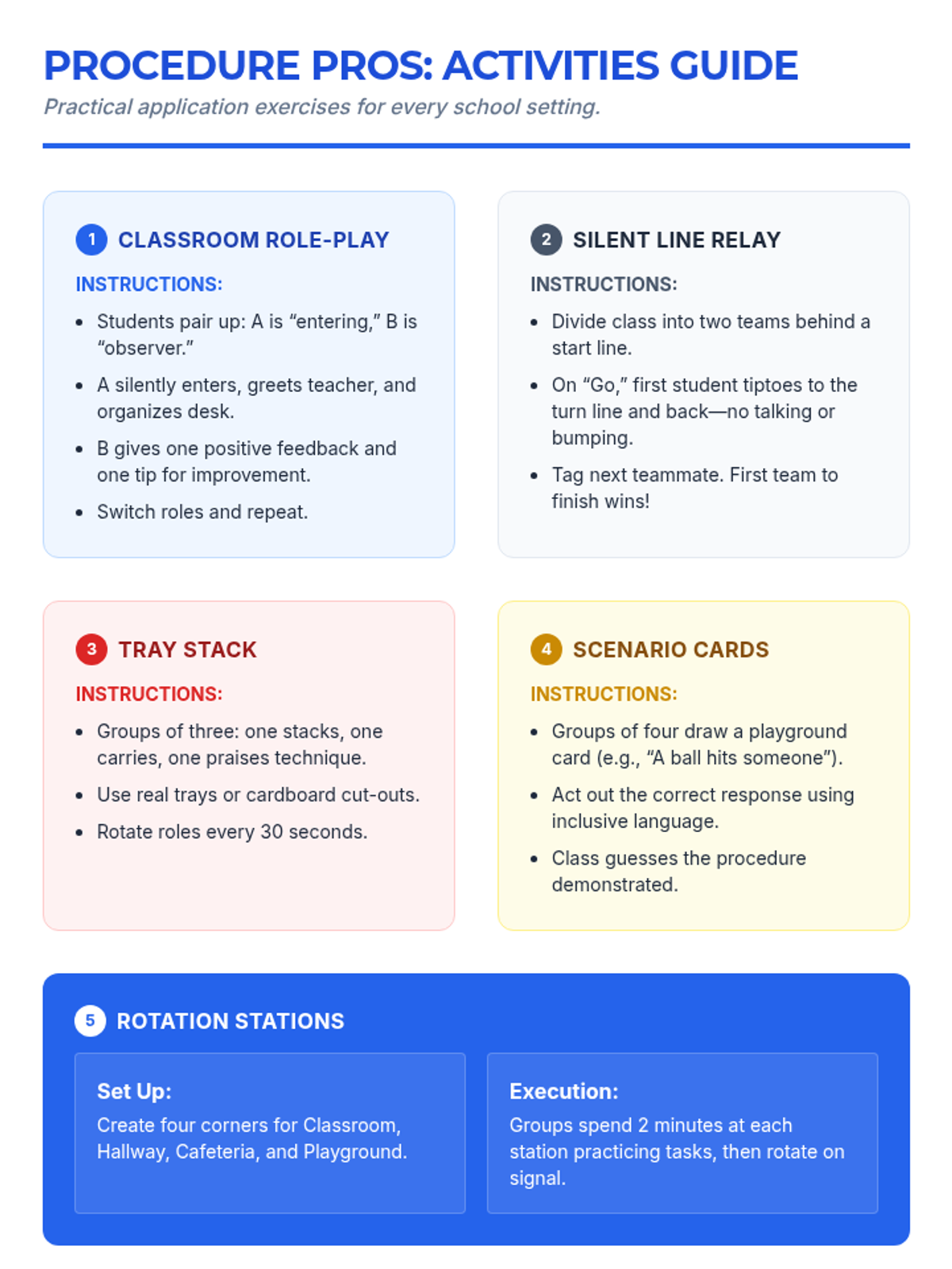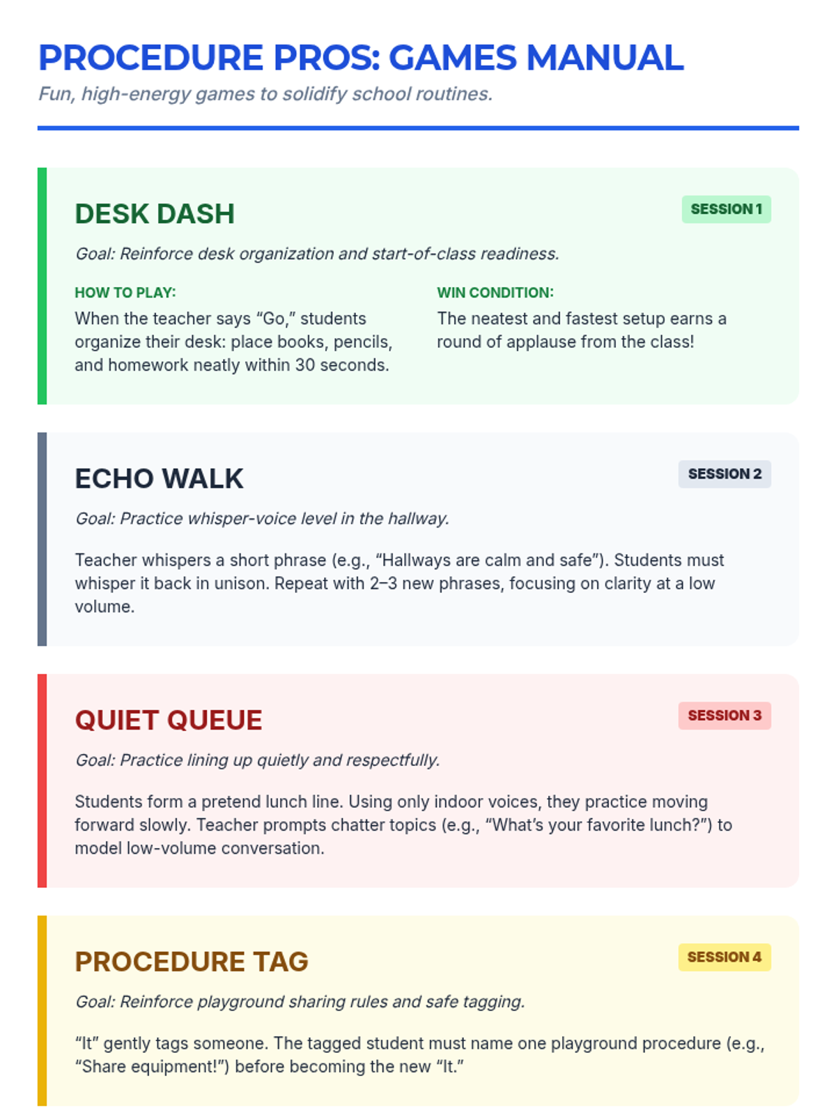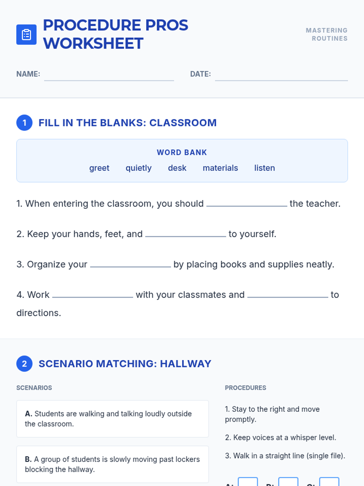 This lesson covers essential routines for the classroom, hallway, cafeteria, and playground to ensure a safe and efficient school environment across six 10-minute sessions.