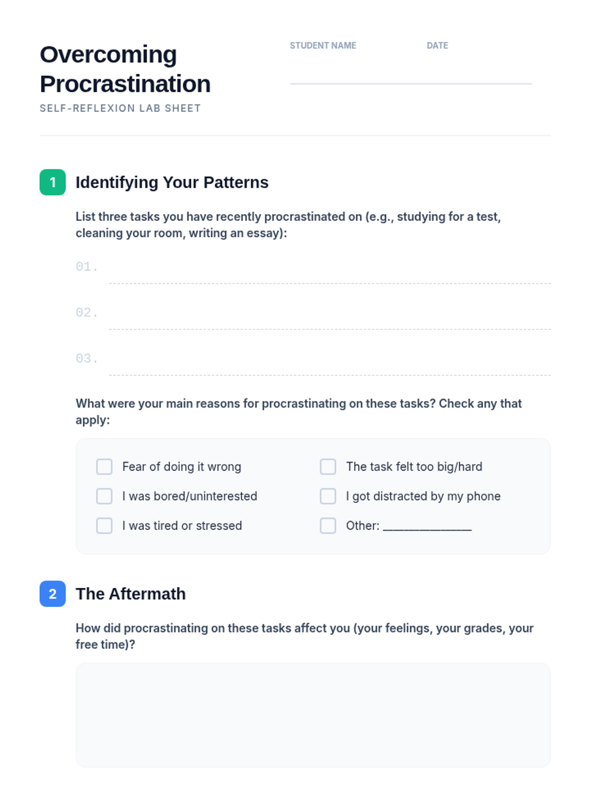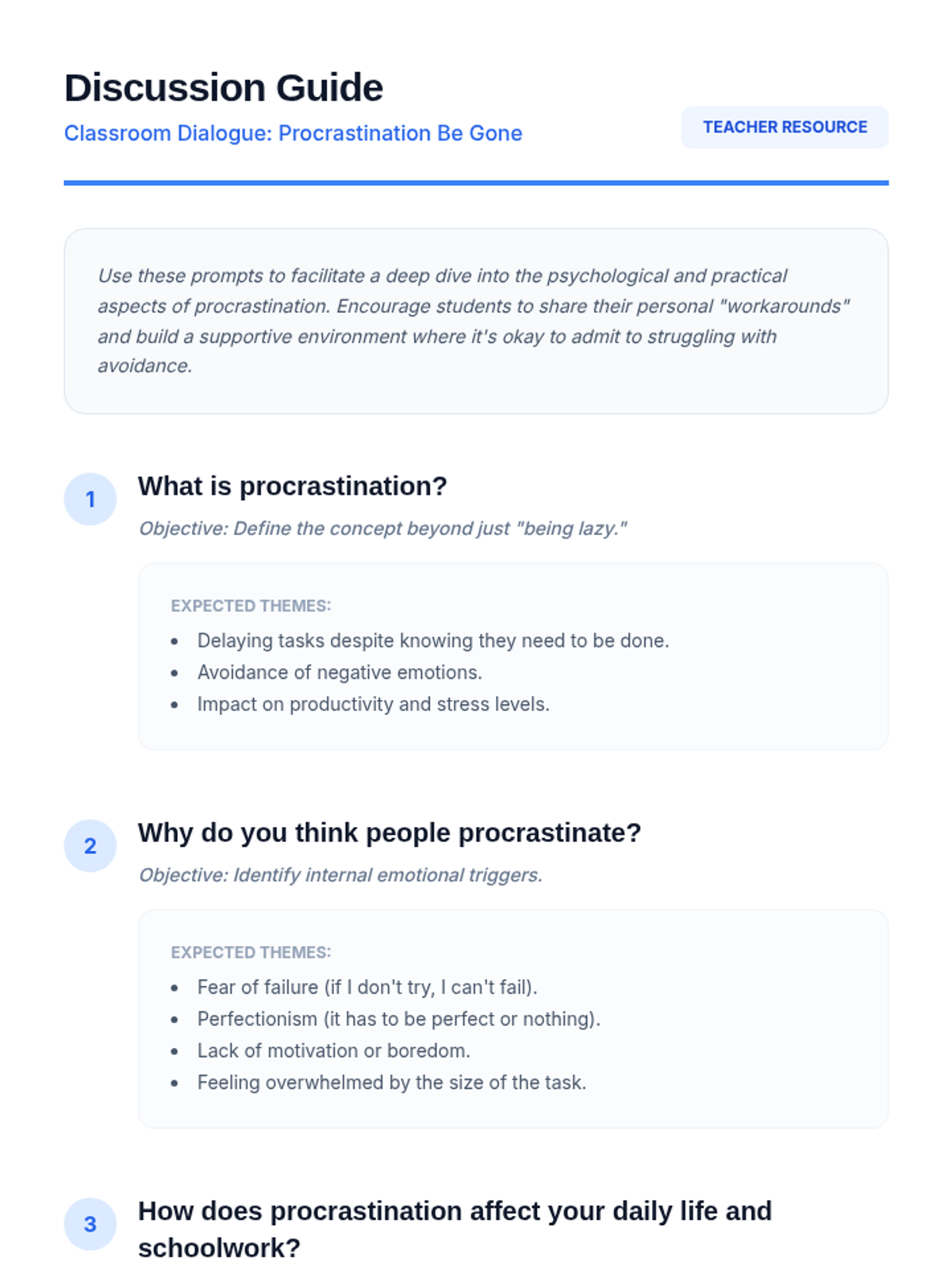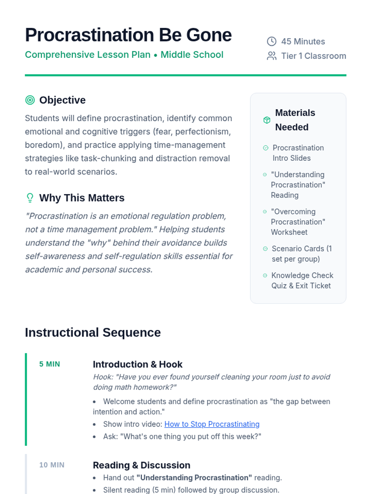 This lesson helps middle school students identify why they procrastinate and provides them with practical, science-backed strategies to manage their time and emotions effectively. Students will analyze scenarios, reflect on their habits, and create a personal action plan for productivity.