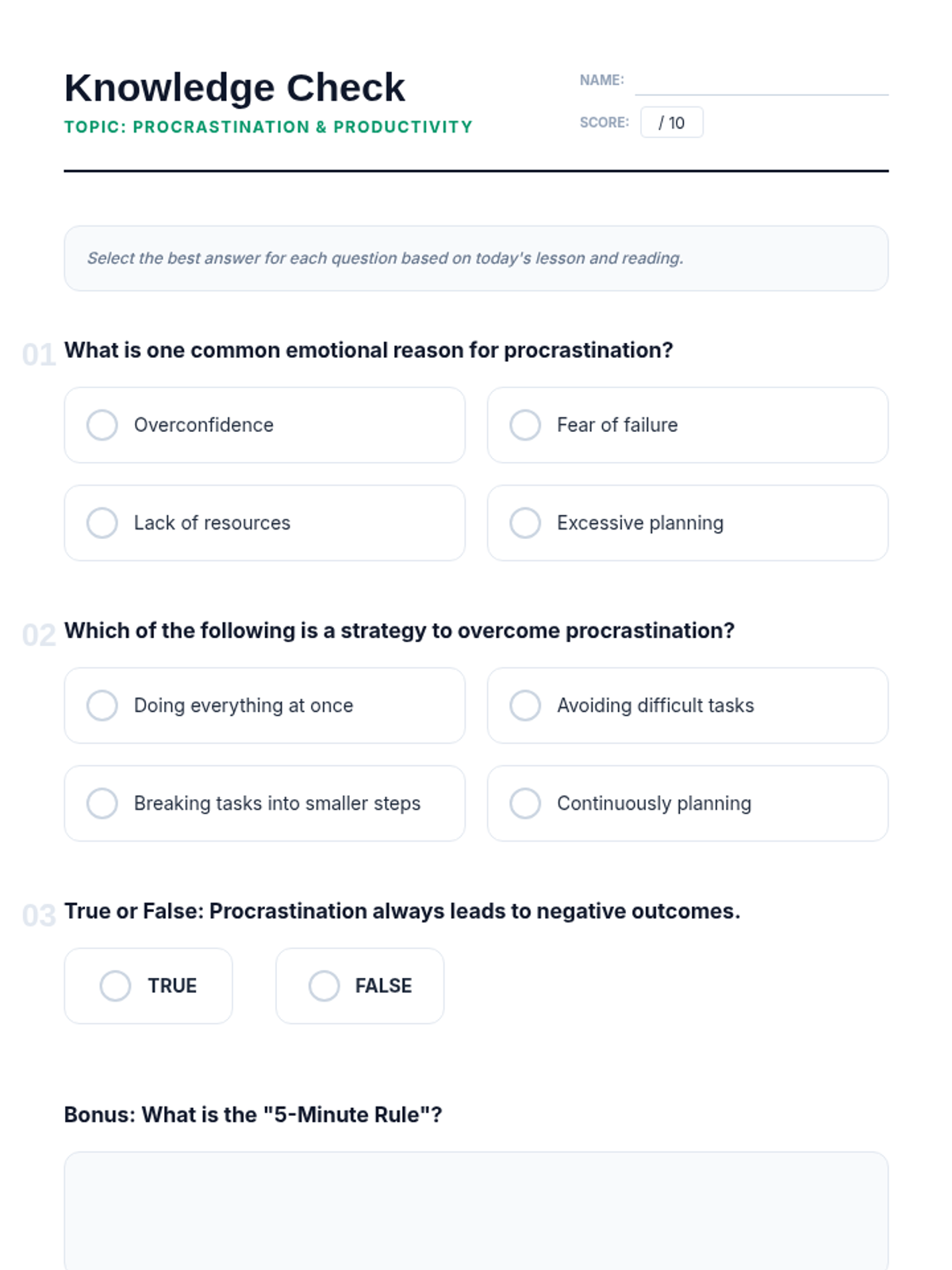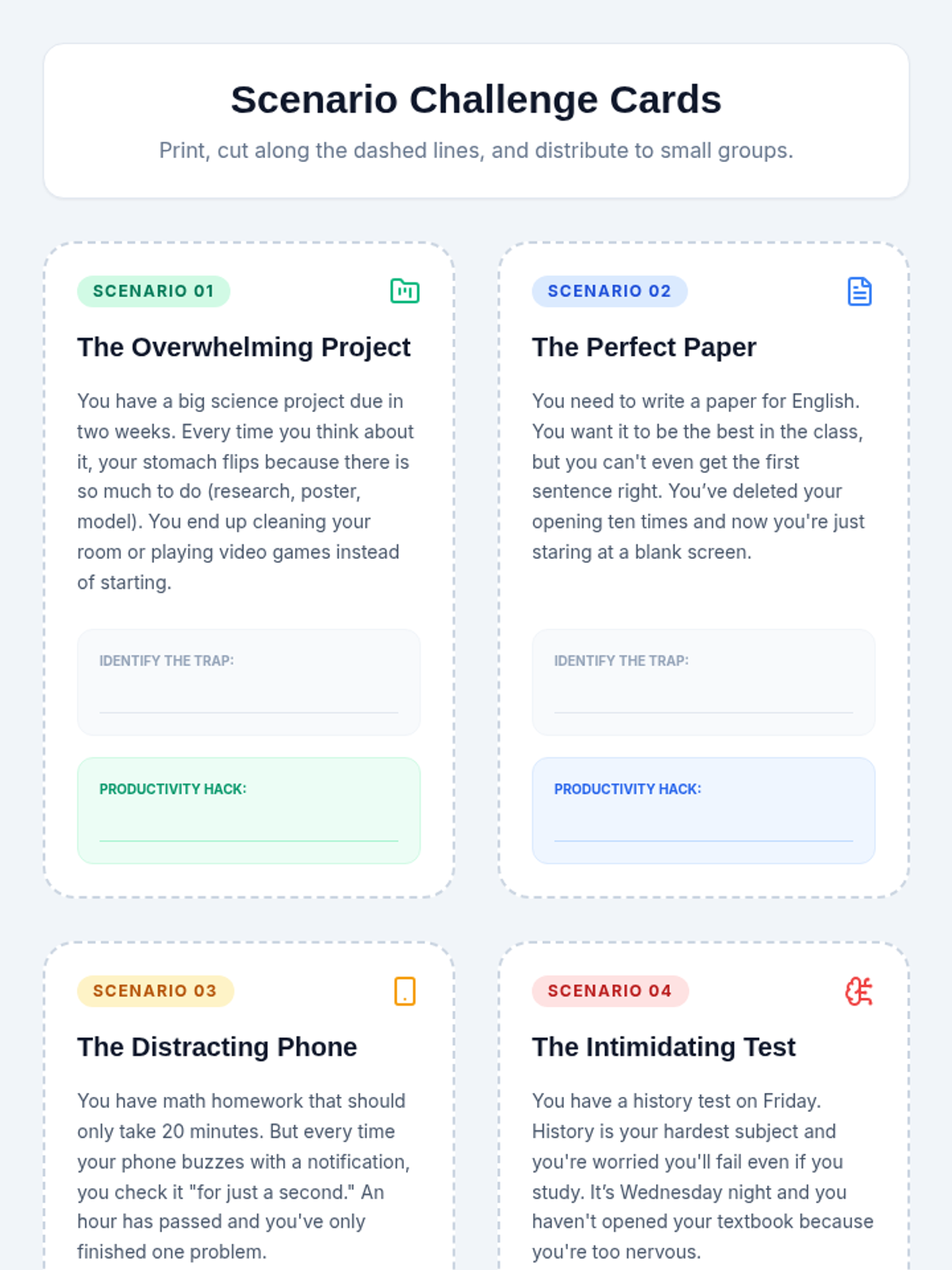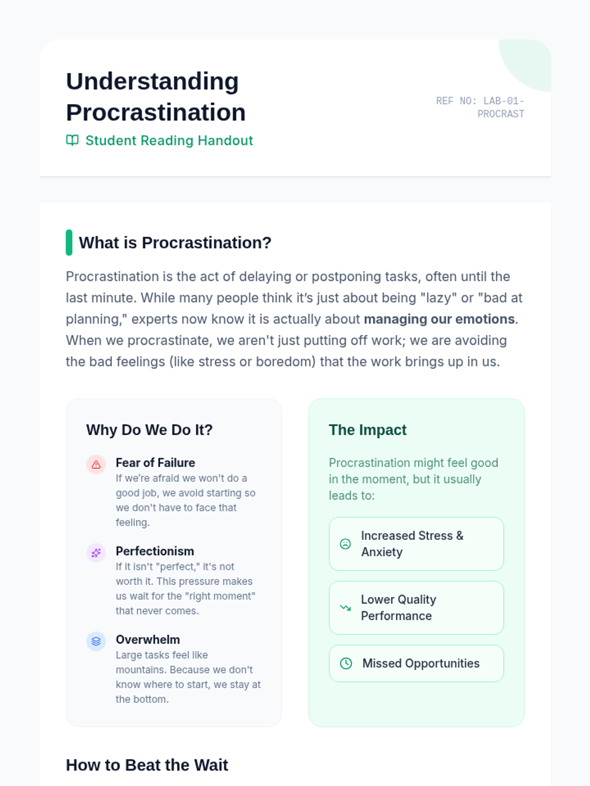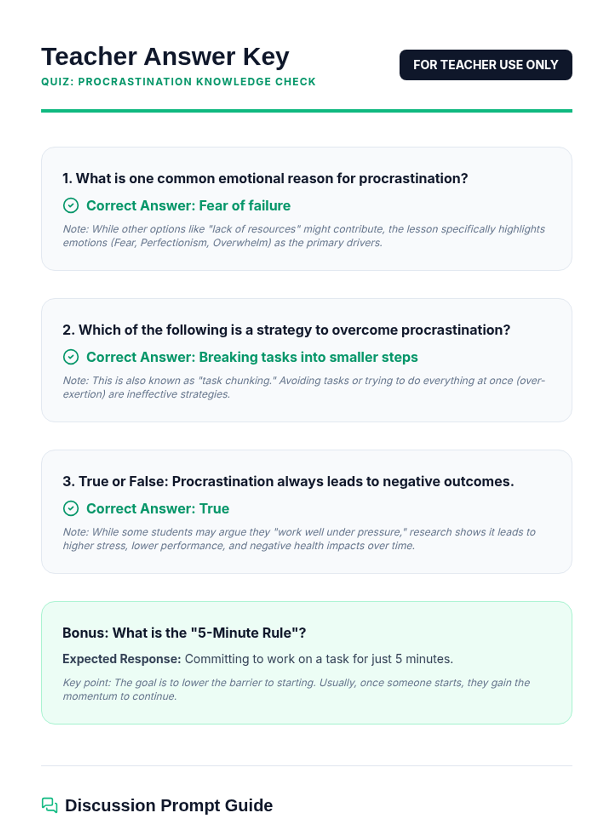 This lesson helps middle school students identify why they procrastinate and provides them with practical, science-backed strategies to manage their time and emotions effectively. Students will analyze scenarios, reflect on their habits, and create a personal action plan for productivity.