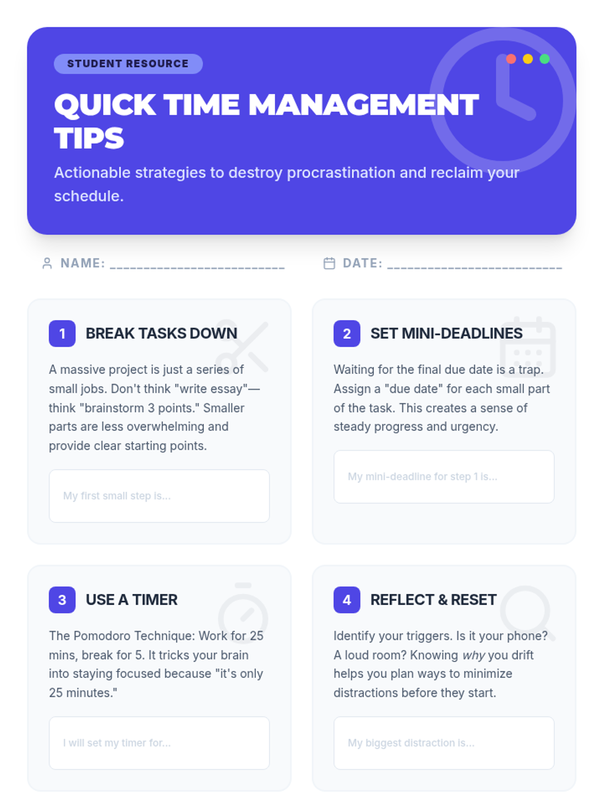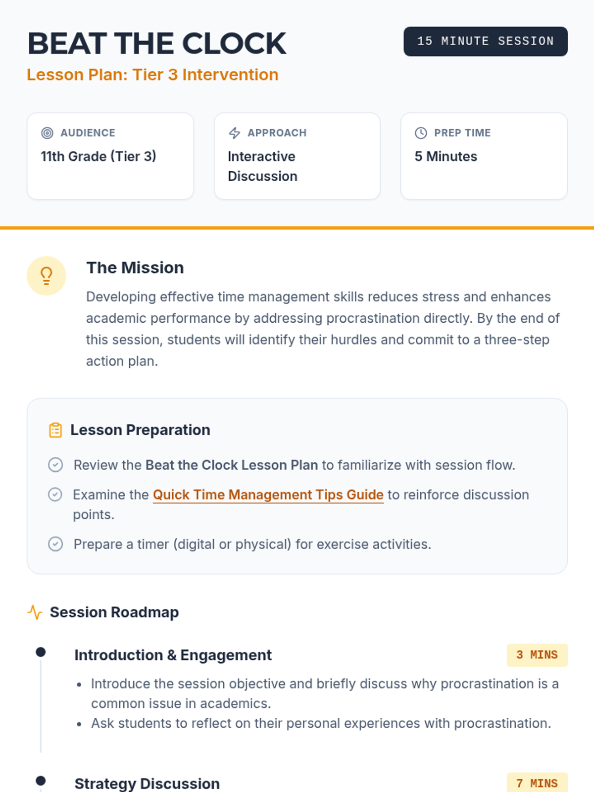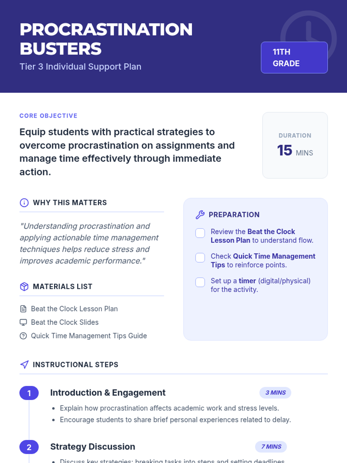 A high-impact 15-minute Tier 3 intervention for 11th graders designed to dismantle procrastination habits. Students learn to decode their delay triggers and apply immediate, actionable time-management strategies to real assignments.