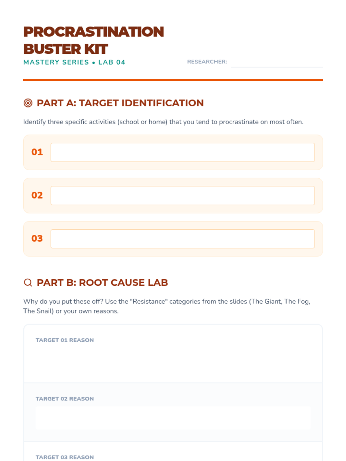Students identify their personal procrastination triggers and develop customized "buster" strategies.