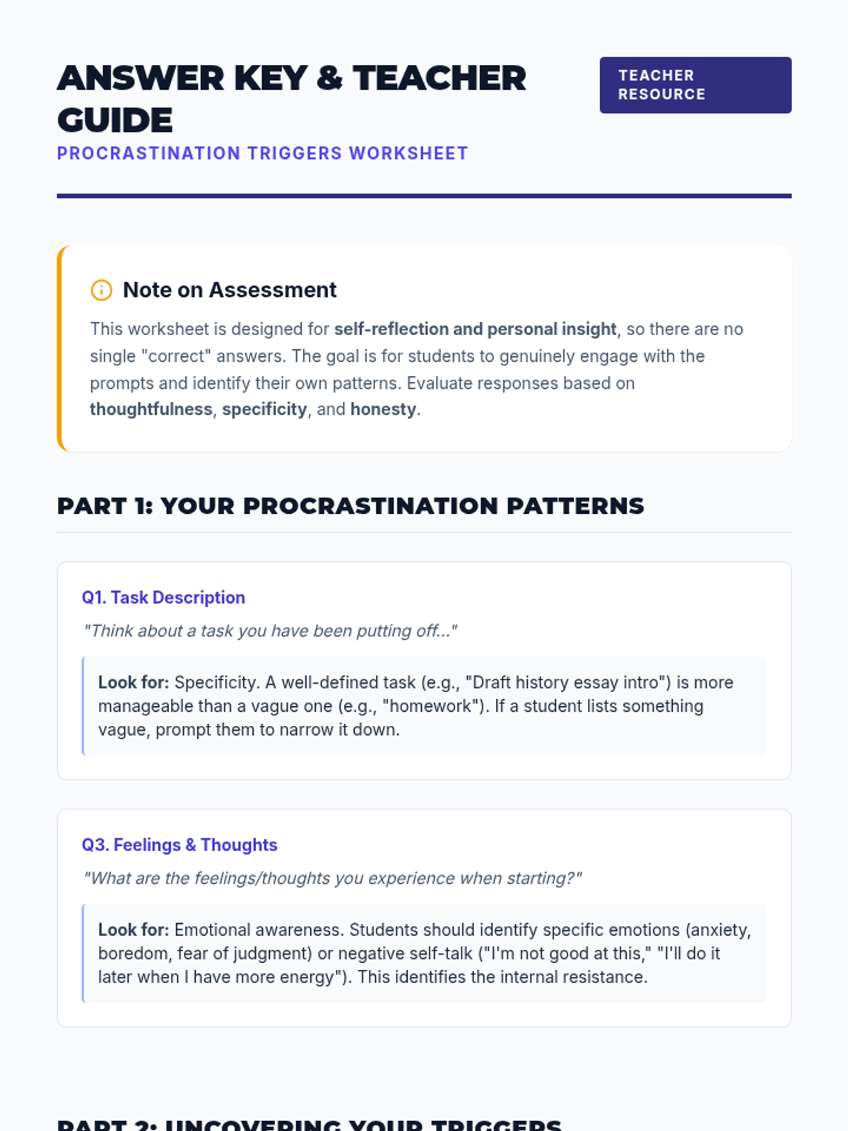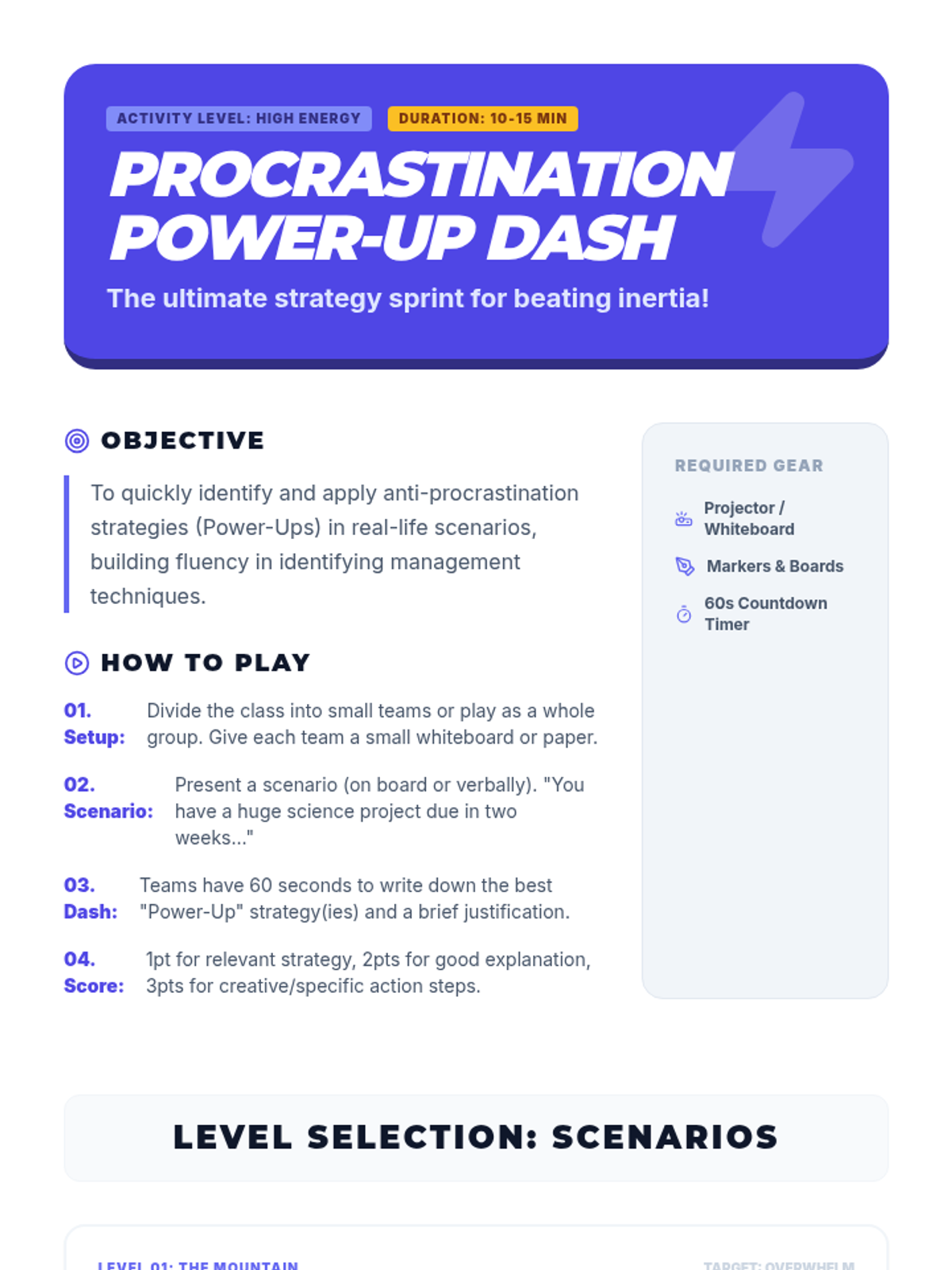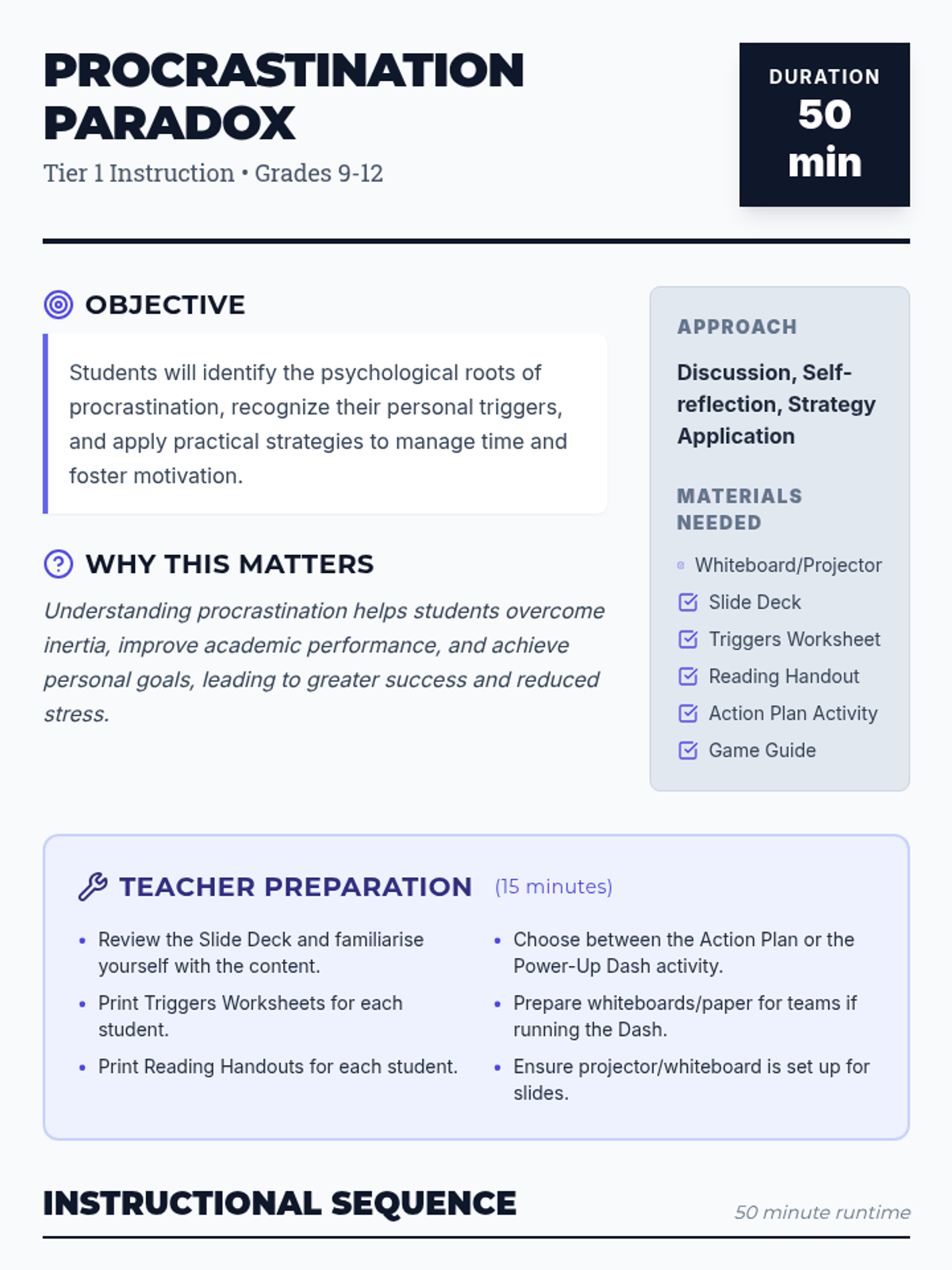 This high school lesson explores the psychological roots of procrastination, helping students identify personal triggers and apply evidence-based strategies to cultivate momentum and intrinsic motivation.