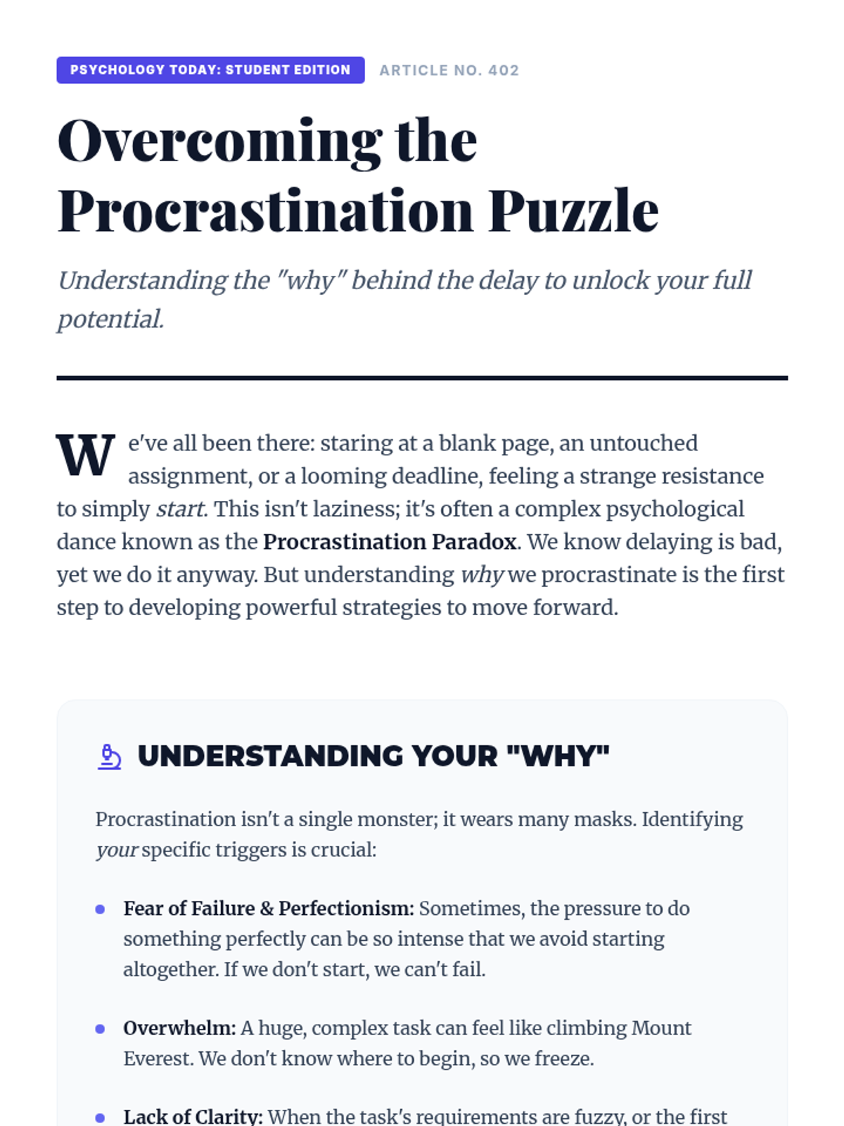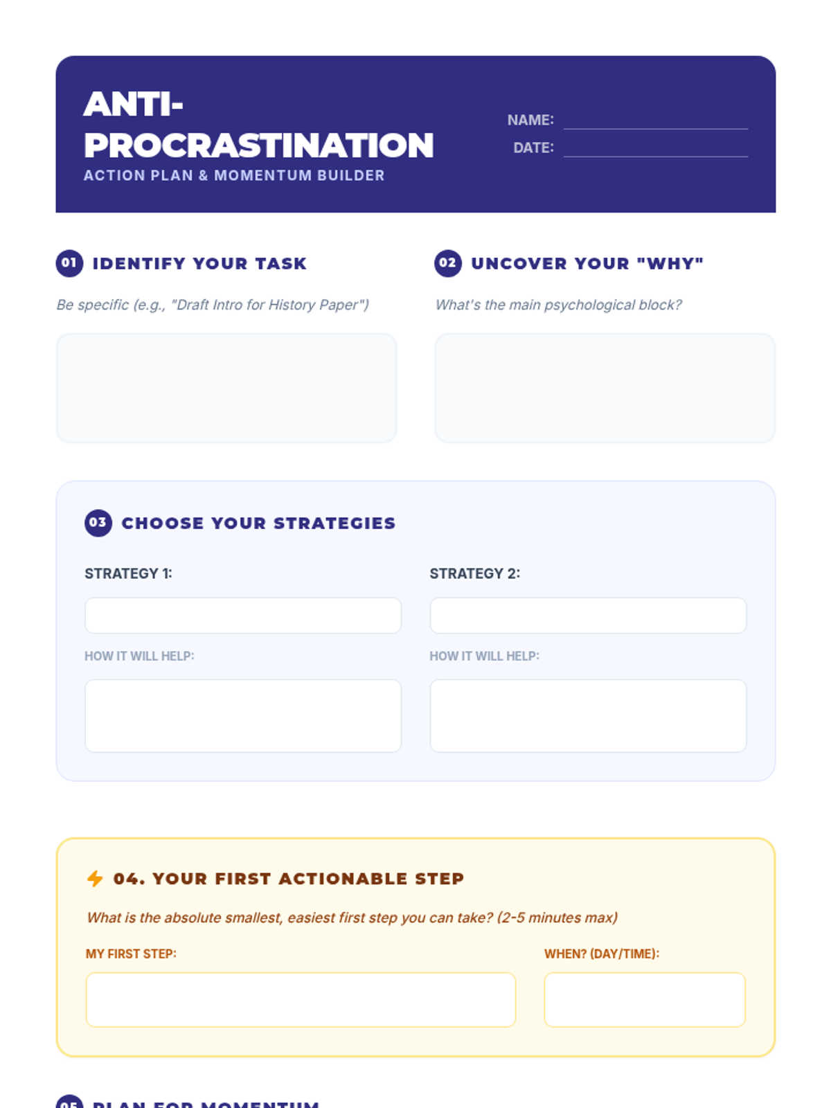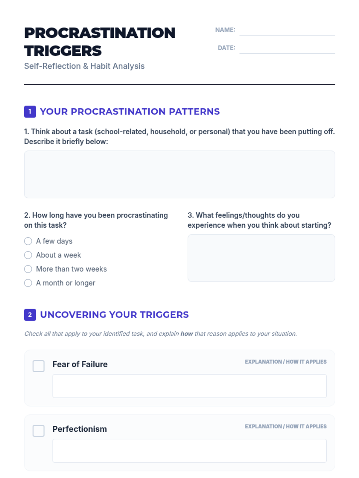 This high school lesson explores the psychological roots of procrastination, helping students identify personal triggers and apply evidence-based strategies to cultivate momentum and intrinsic motivation.