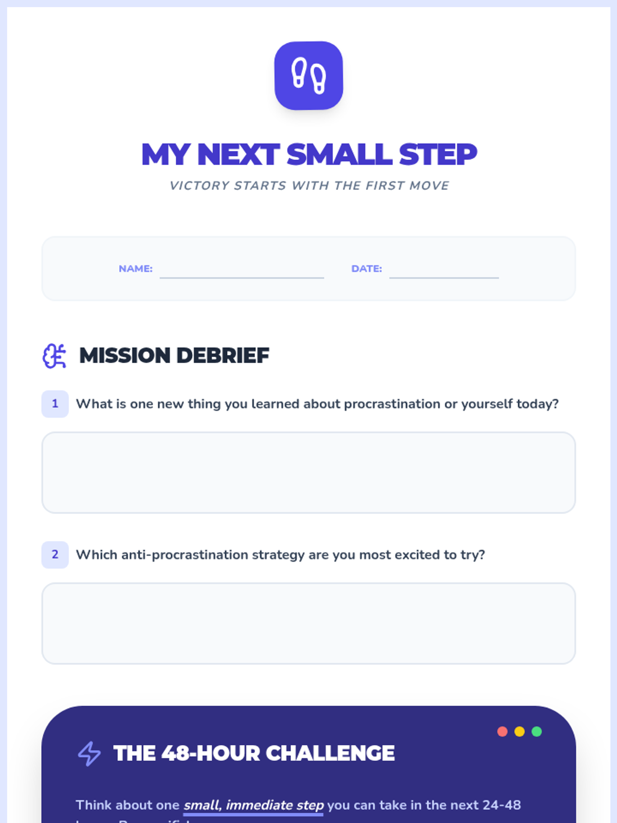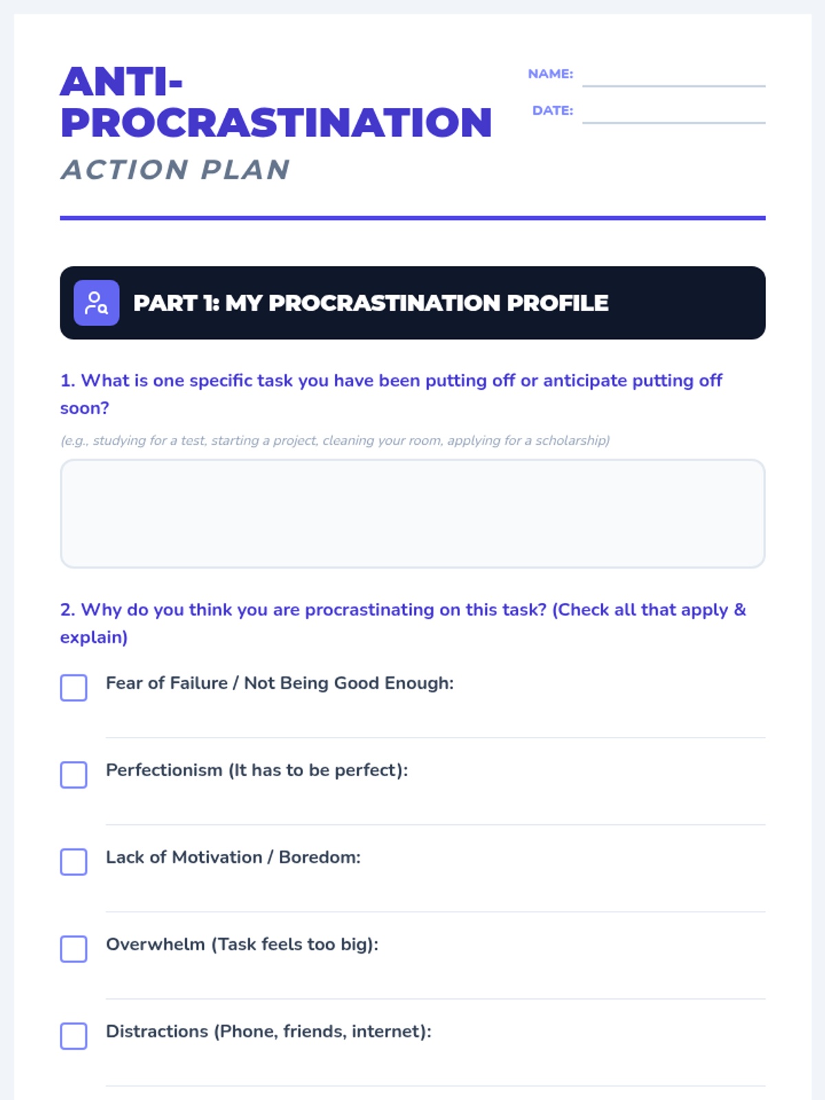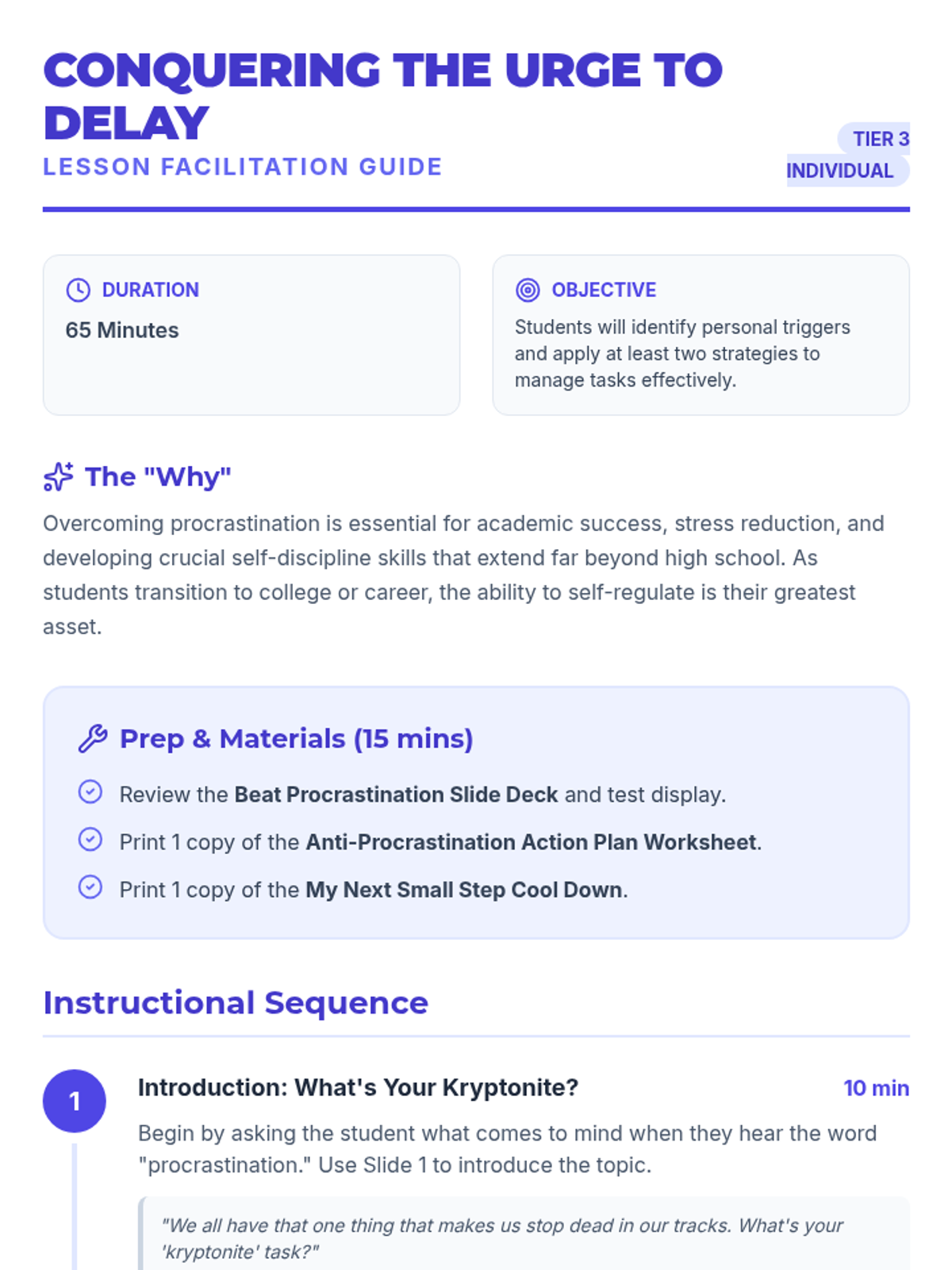 A 65-minute individual Tier 3 lesson for 12th graders to identify procrastination triggers and implement actionable strategies like the Pomodoro Technique and time blocking.