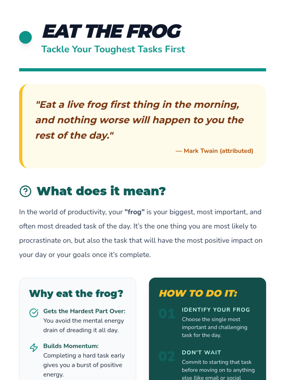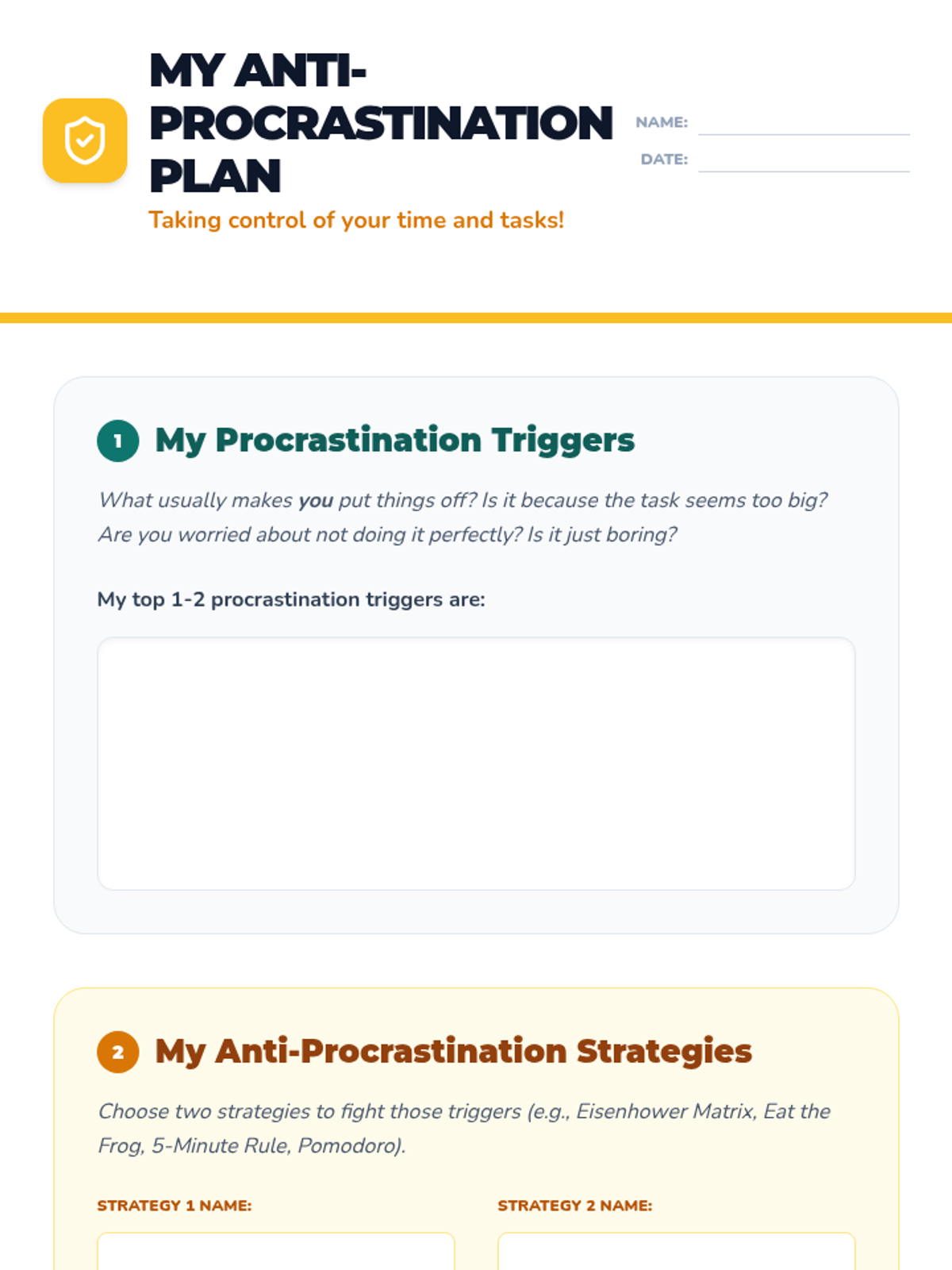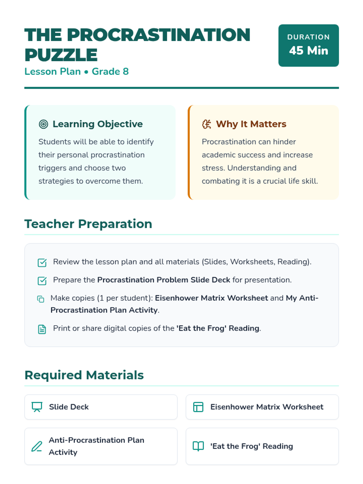 An interactive lesson for 8th graders to understand procrastination triggers and master time-management tools like the Eisenhower Matrix and 'Eat the Frog' technique.