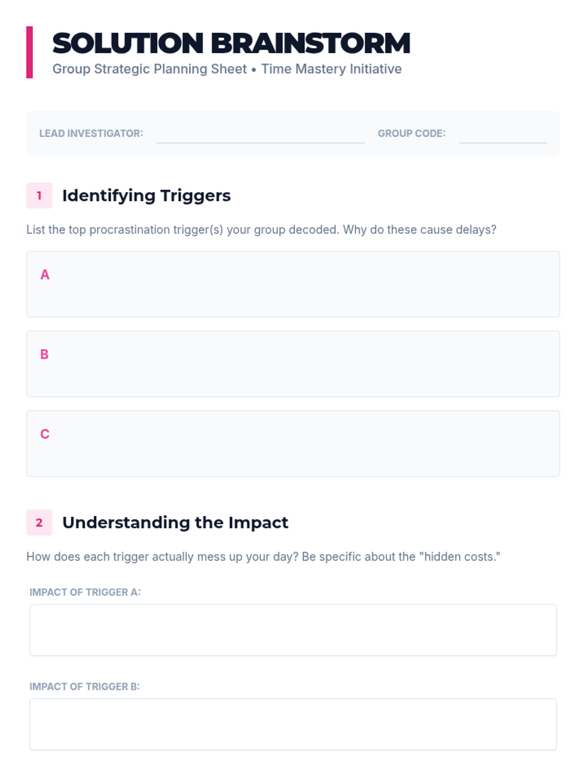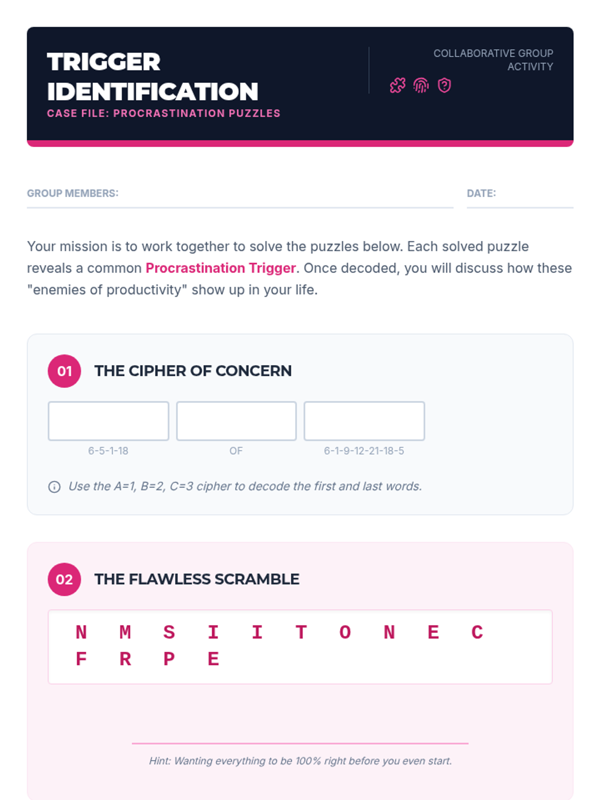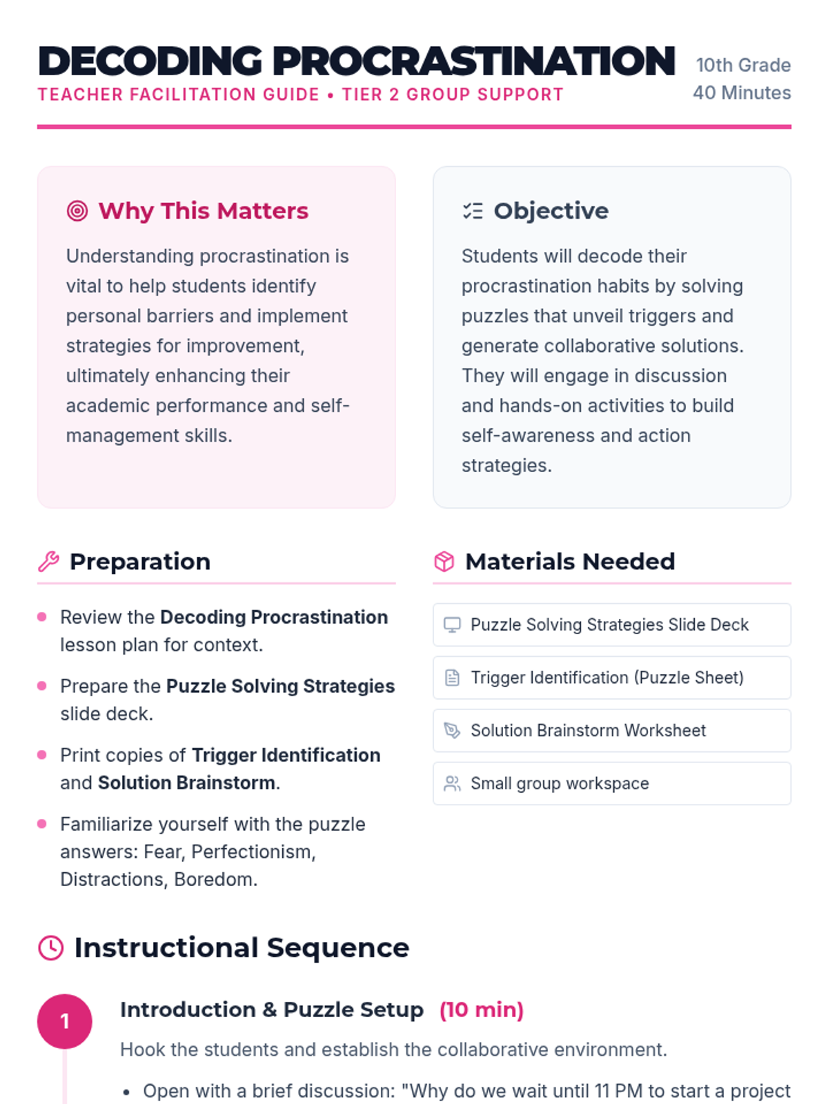 A 40-minute Tier 2 group session for 10th graders that uses interactive puzzles to uncover procrastination triggers and develop collaborative solutions. Students engage in a "decoding" activity to build self-awareness and action-oriented strategies.