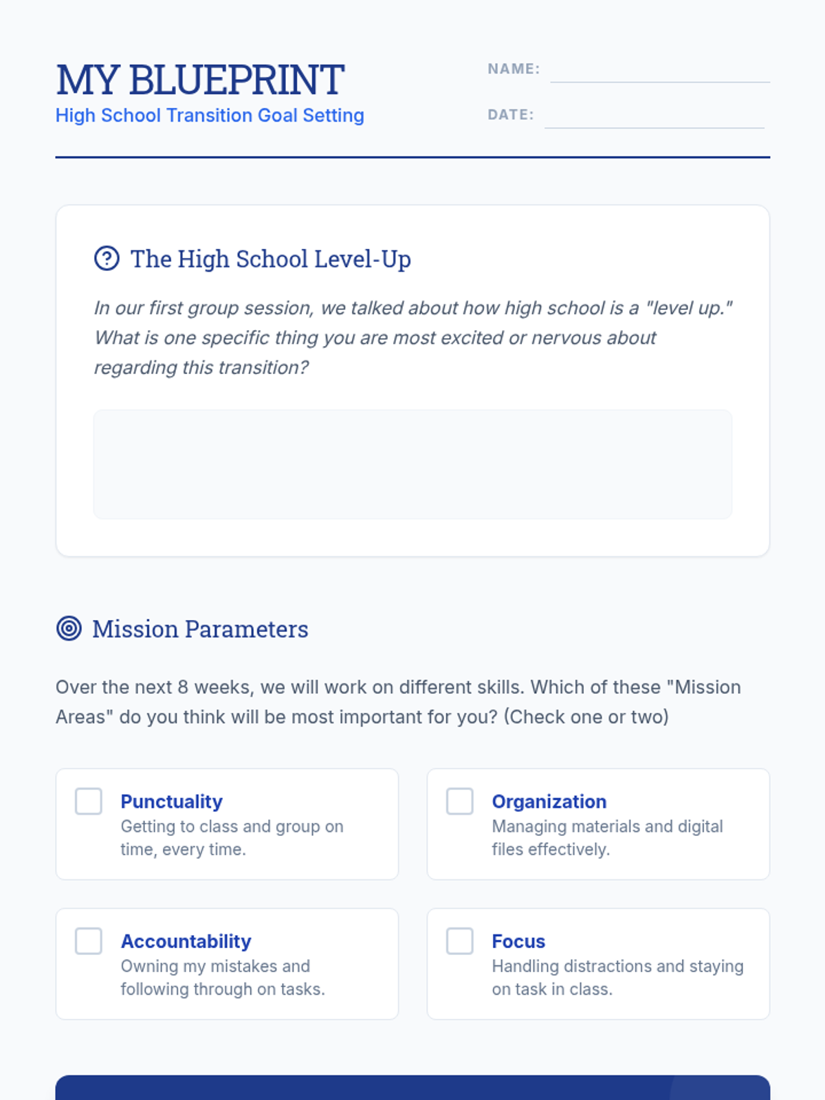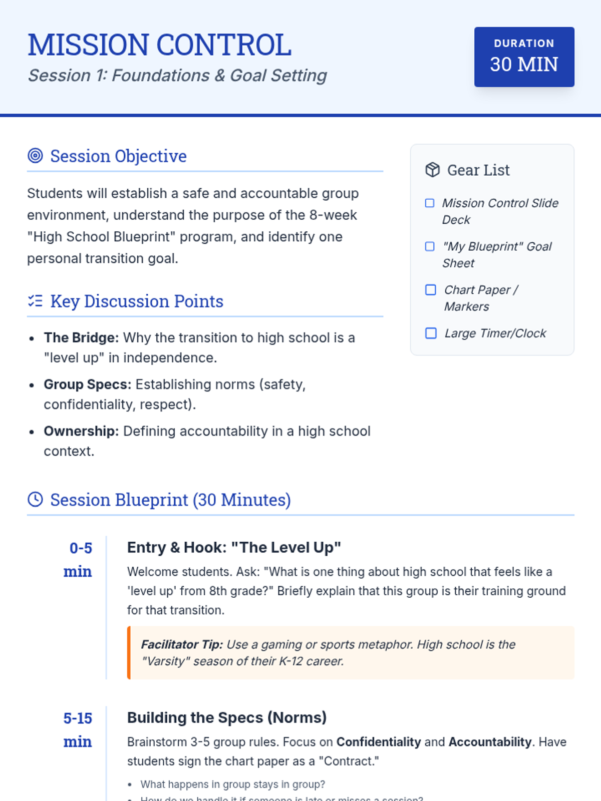 Establish group norms, define accountability, and set personal goals for the 8-week program.