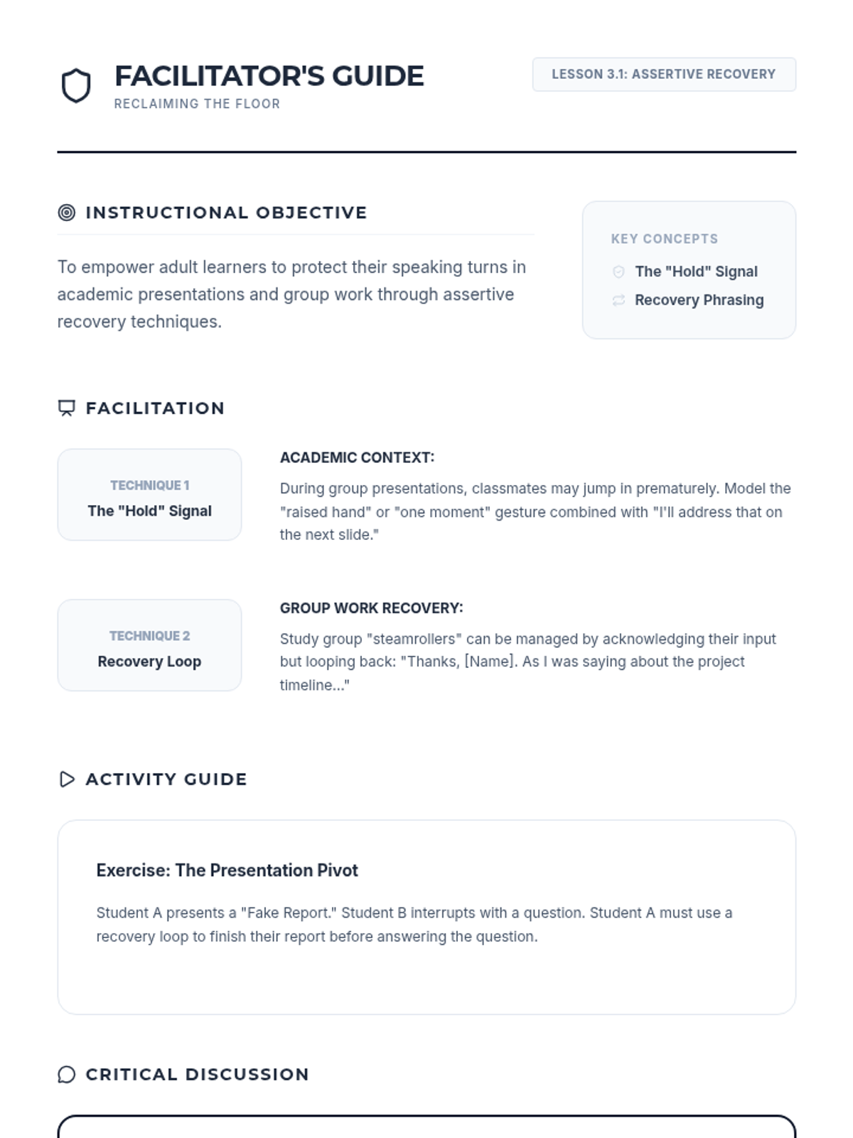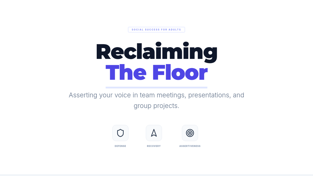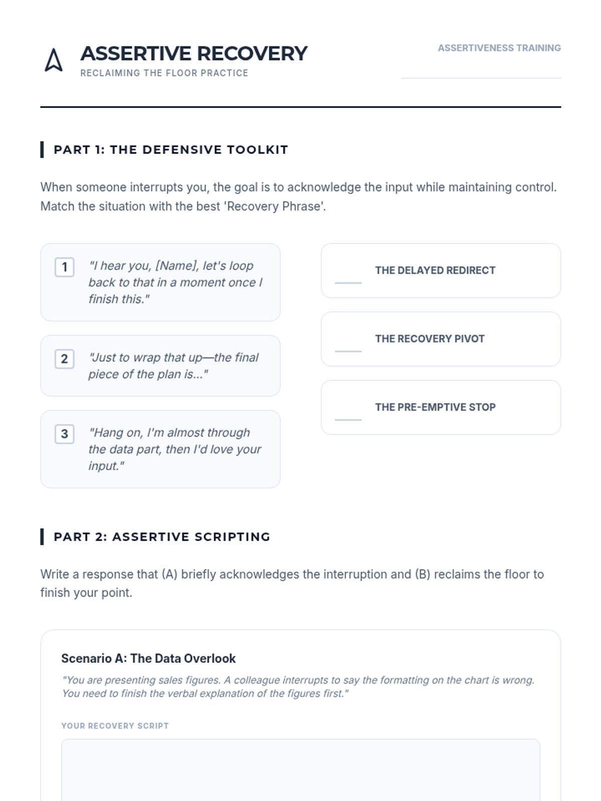 A lesson focused on assertive communication strategies for when others interrupt, including techniques to reclaim the floor and manage conversational 'steamrollers' in professional settings.