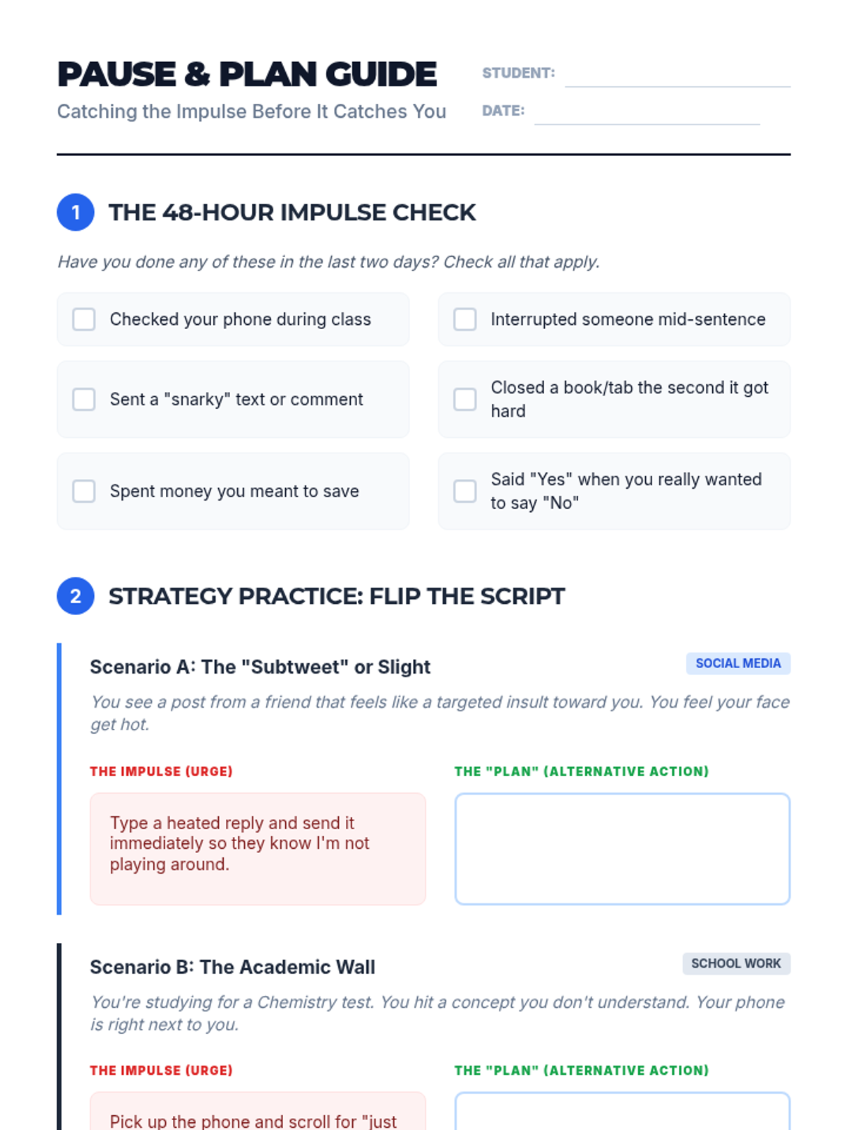 A 30-minute SEL lesson for 10th graders focused on identifying impulsive urges and developing strategies to choose thoughtful alternative behaviors. Students explore the 'gap' between stimulus and response to improve self-regulation in academic and social contexts.