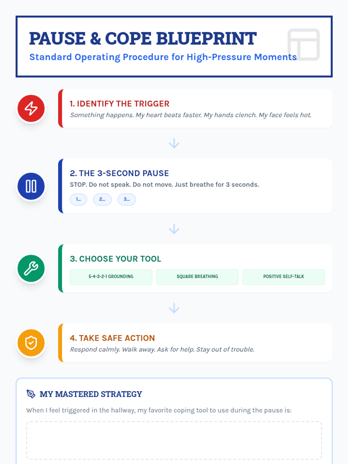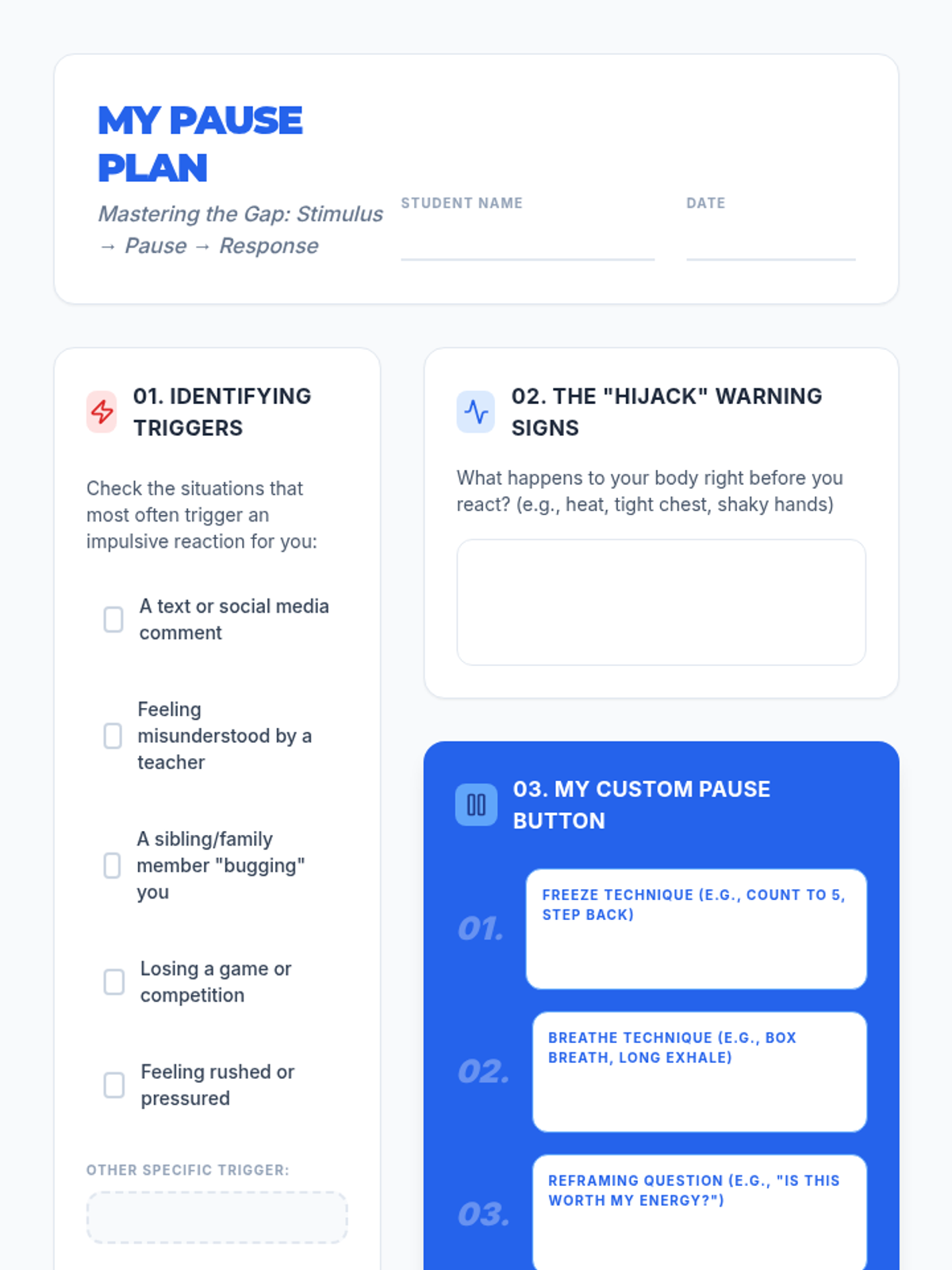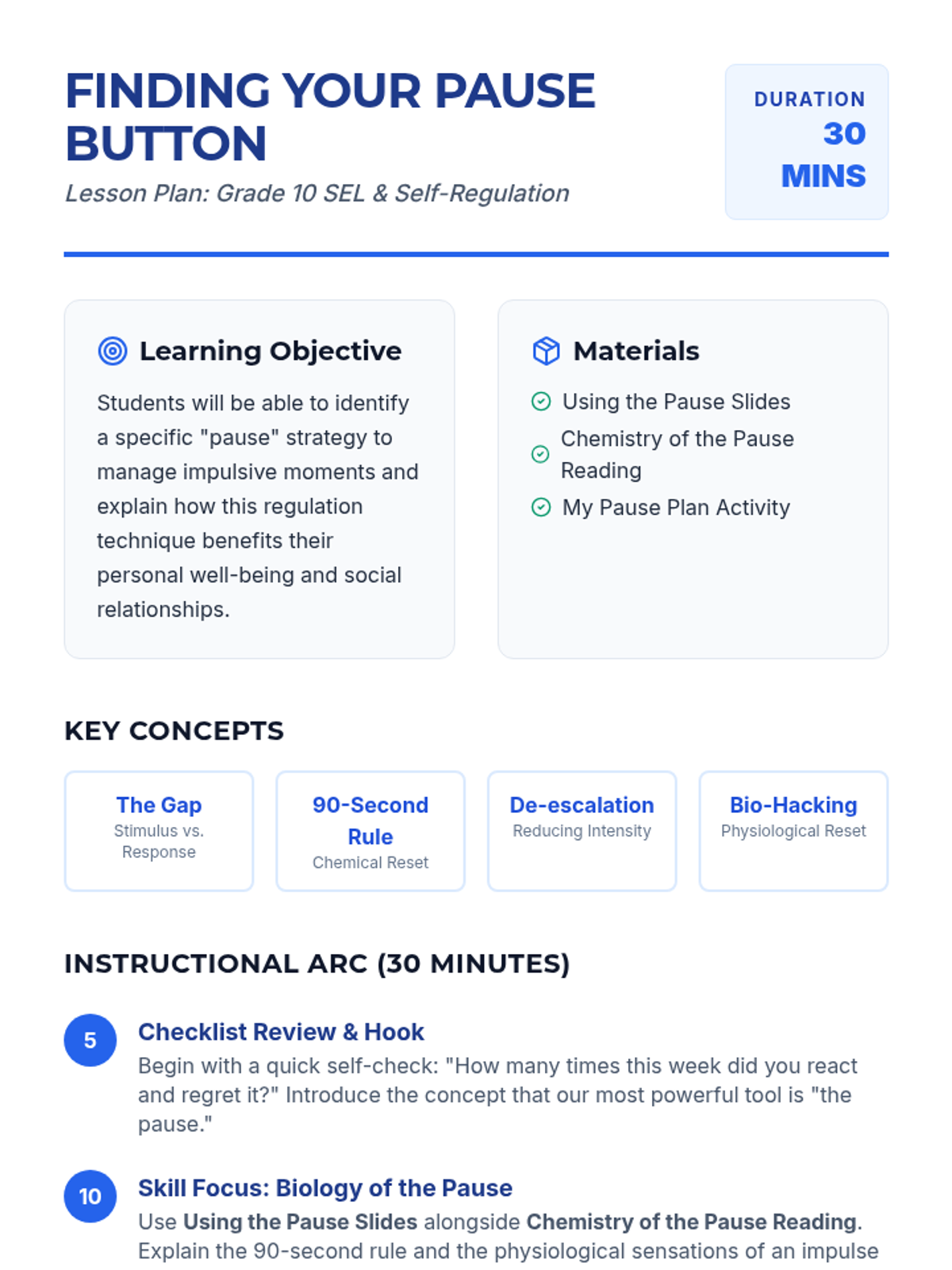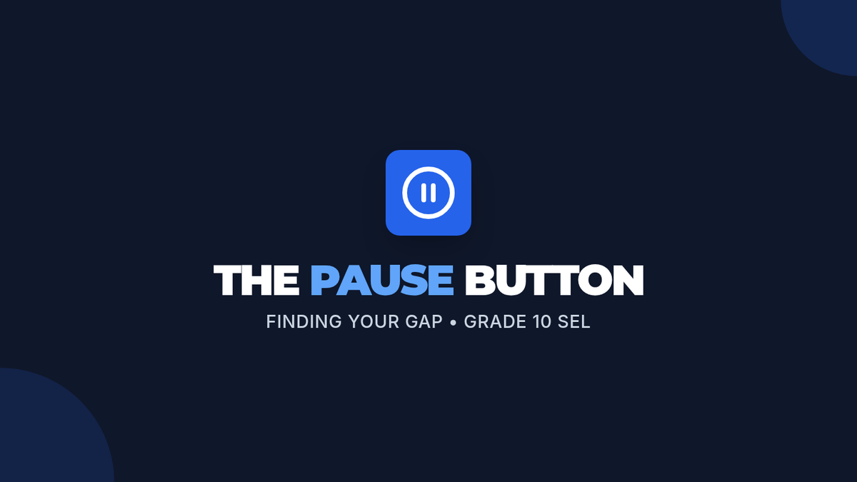 A 30-minute lesson for 10th graders on mastering the 'pause'—the critical gap between stimulus and response. Students will develop a personal de-escalation strategy to manage impulsive moments and improve social-emotional regulation.