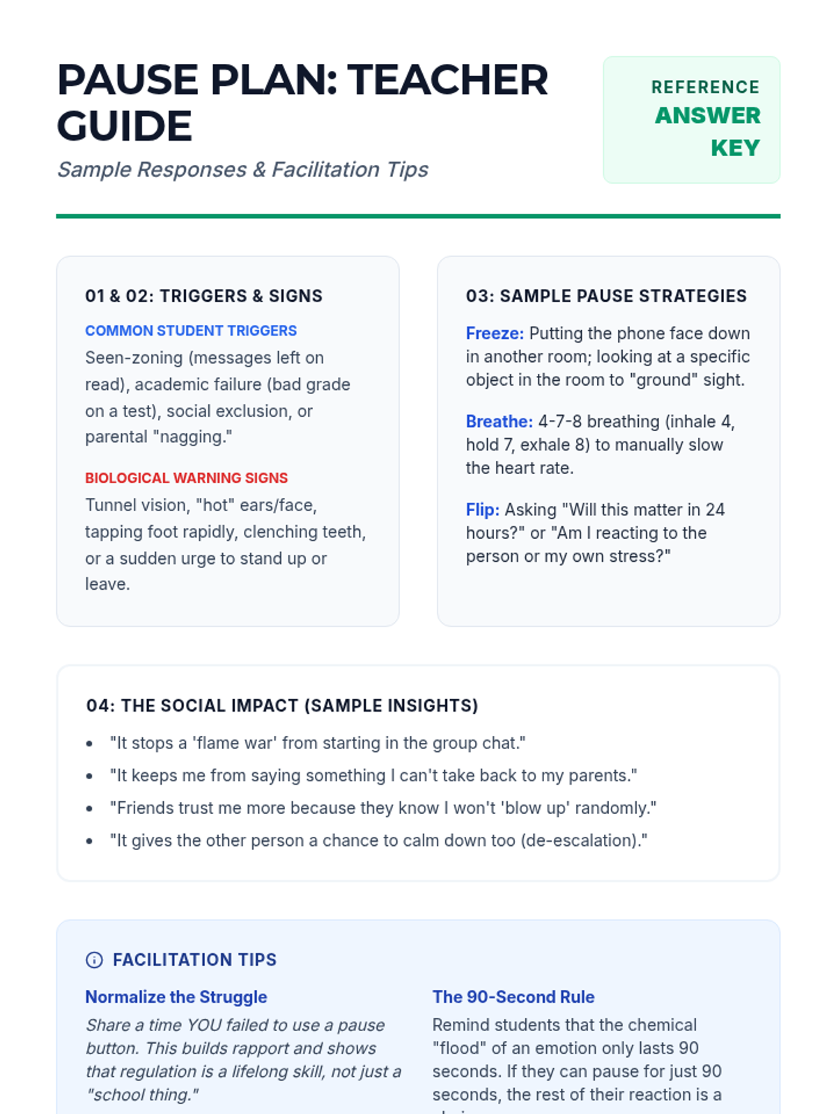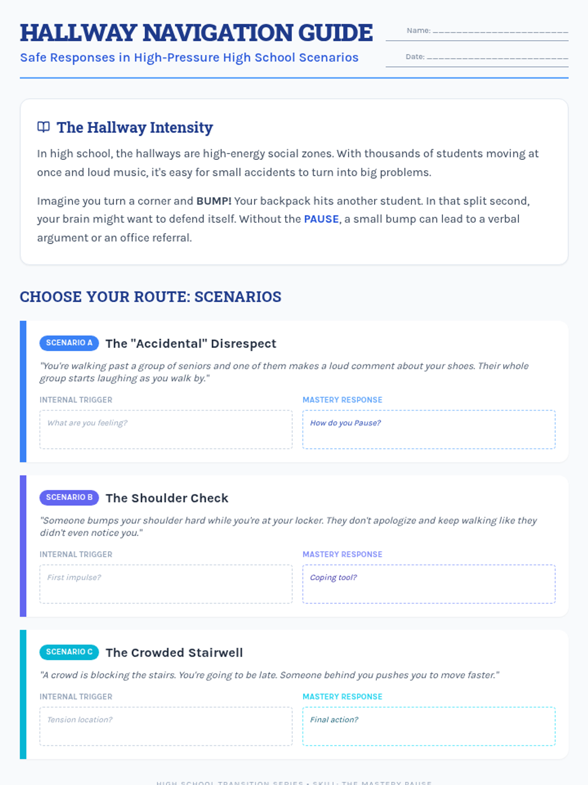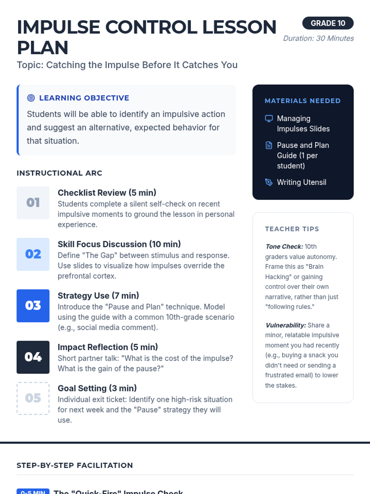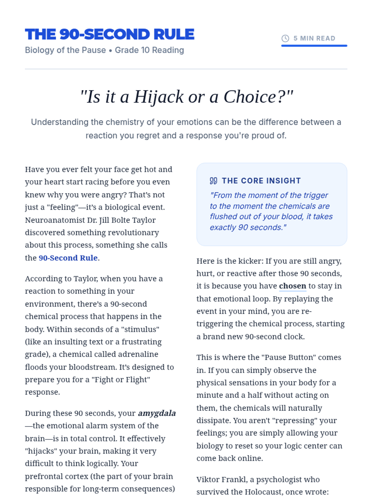 A 30-minute lesson for 10th graders on mastering the 'pause'—the critical gap between stimulus and response. Students will develop a personal de-escalation strategy to manage impulsive moments and improve social-emotional regulation.