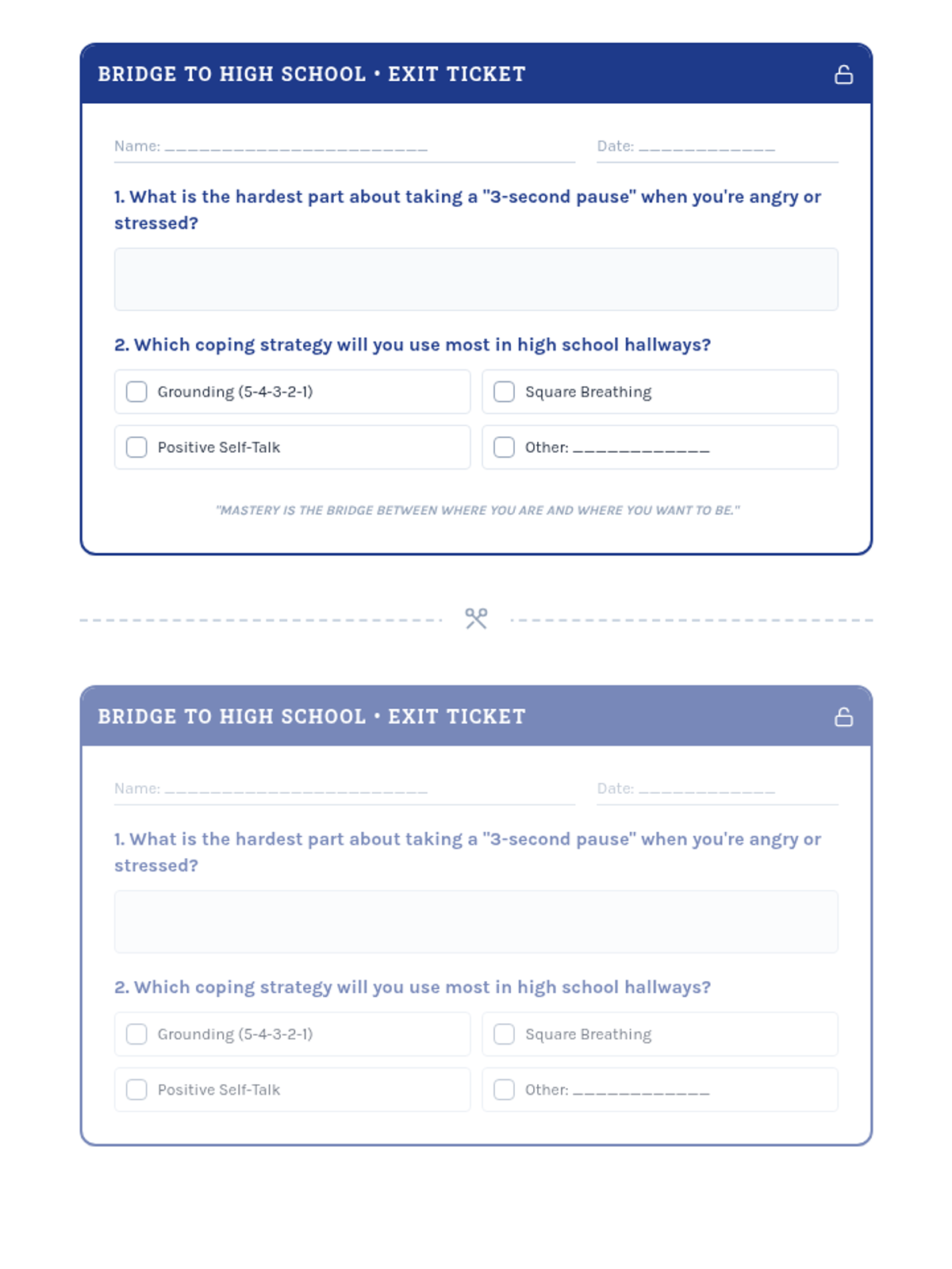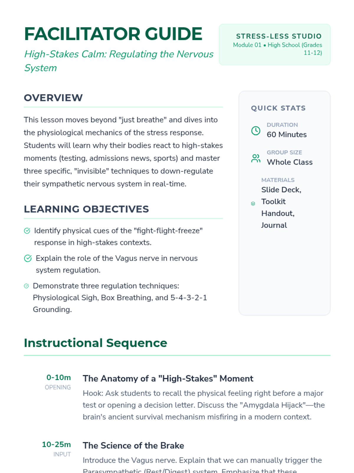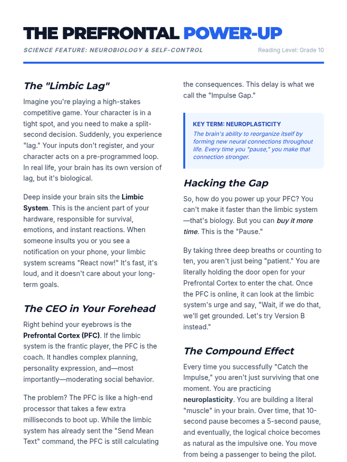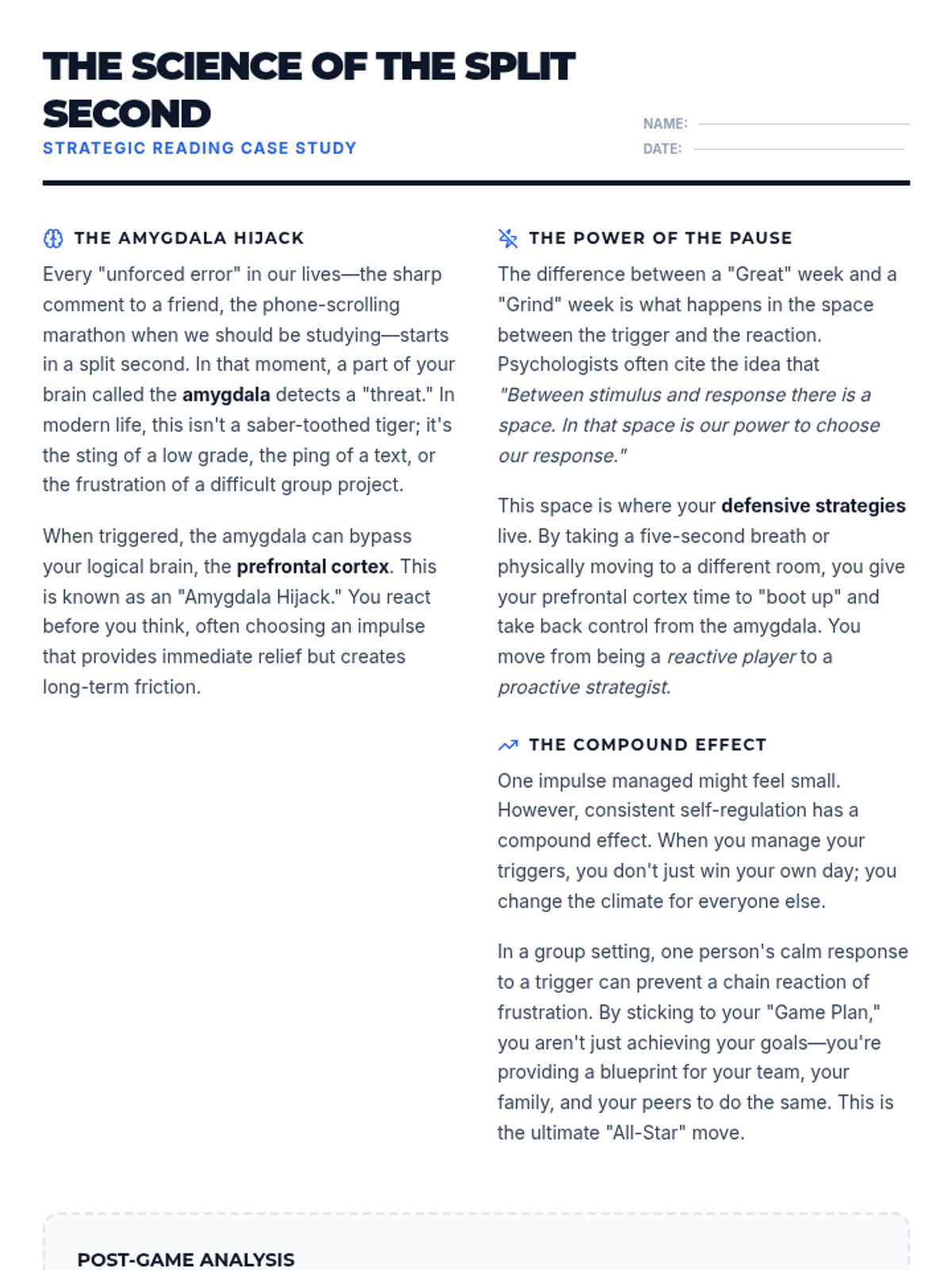 A 30-minute lesson for 10th graders on mastering the 'pause'—the critical gap between stimulus and response. Students will develop a personal de-escalation strategy to manage impulsive moments and improve social-emotional regulation.