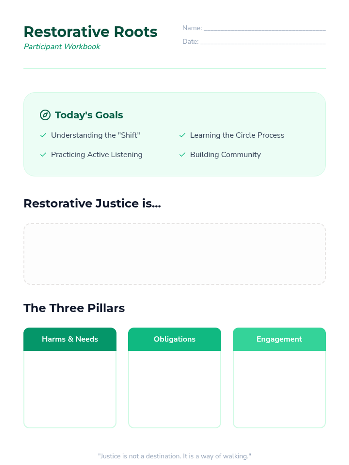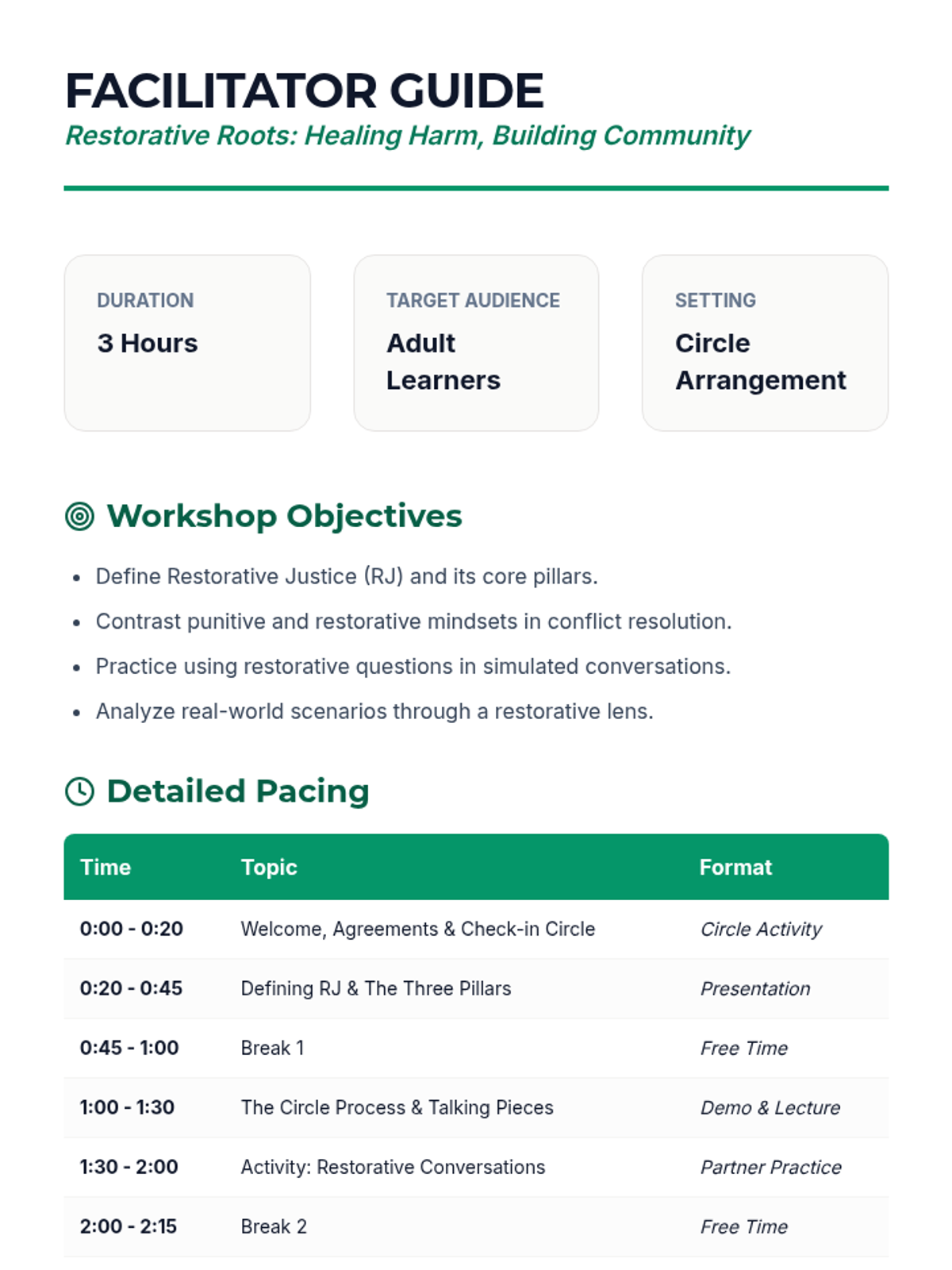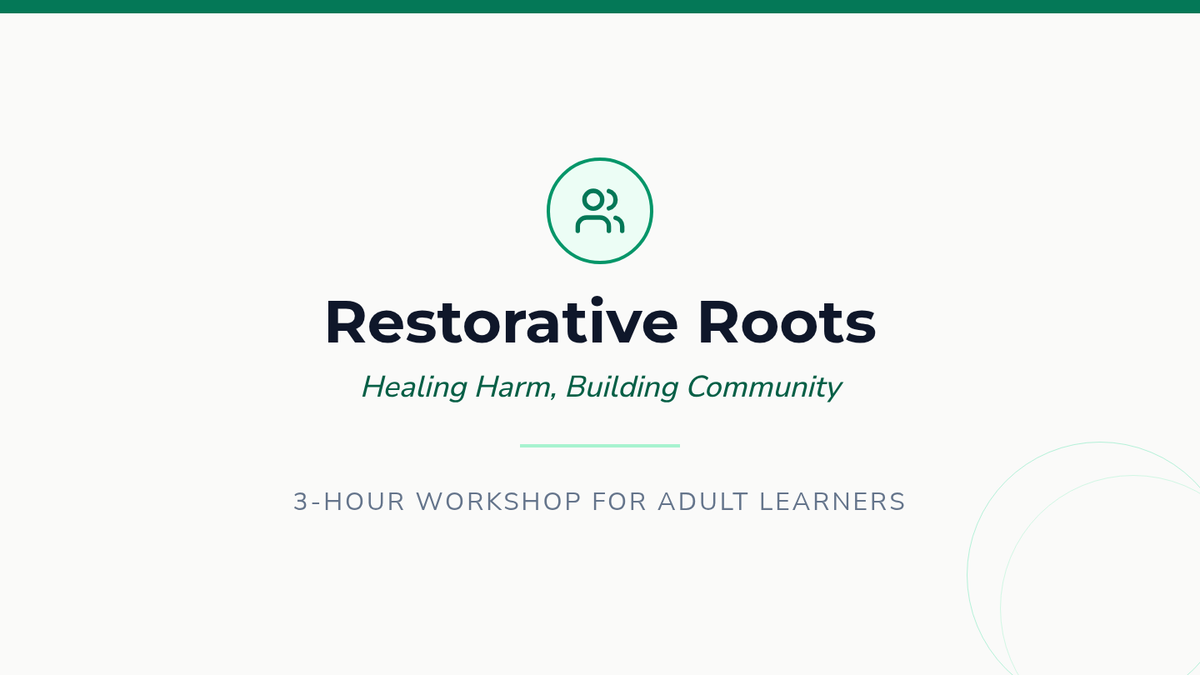 A comprehensive 3-hour workshop for adult learners introducing the principles, processes, and impact of restorative justice practices, focusing on shifting from punitive to restorative mindsets.