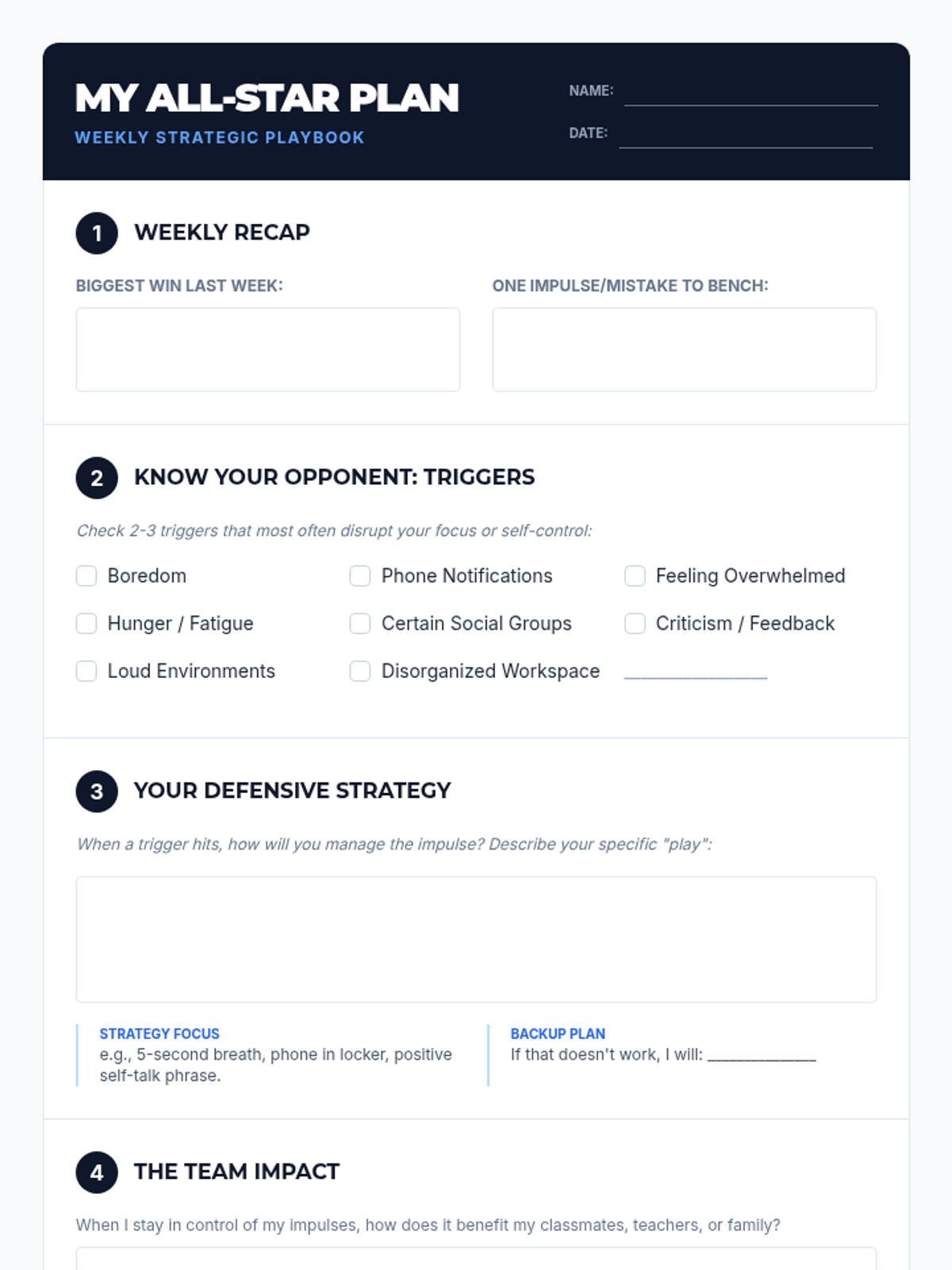 A 30-minute strategic planning session for 10th graders to integrate trigger identification, impulse management, and social awareness into a comprehensive weekly goal.