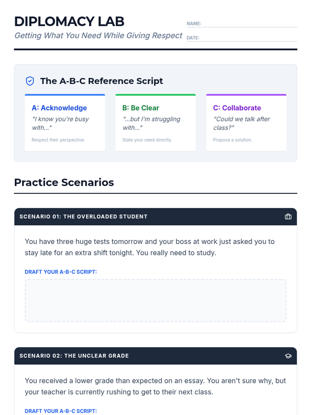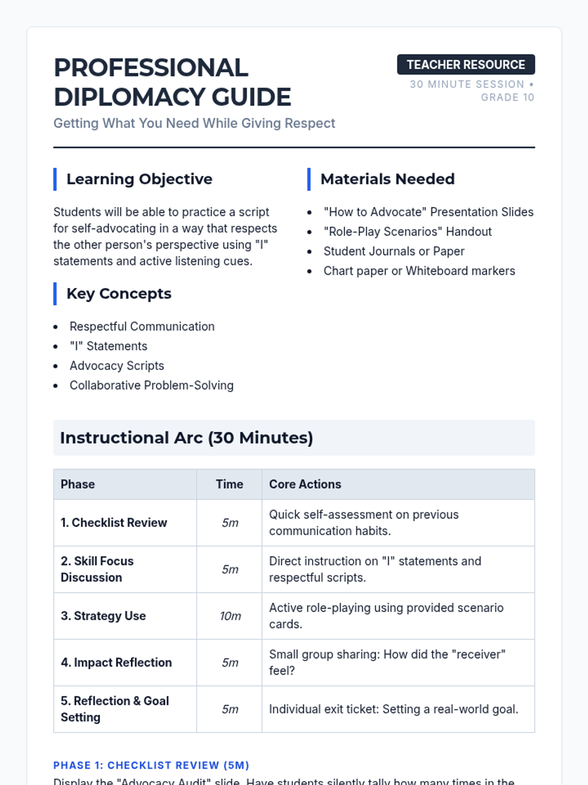 A 30-minute lesson for 10th graders focused on balancing self-advocacy with professional respect. Students will learn to use 'I' statements and structured scripts to communicate their needs effectively while maintaining positive relationships.