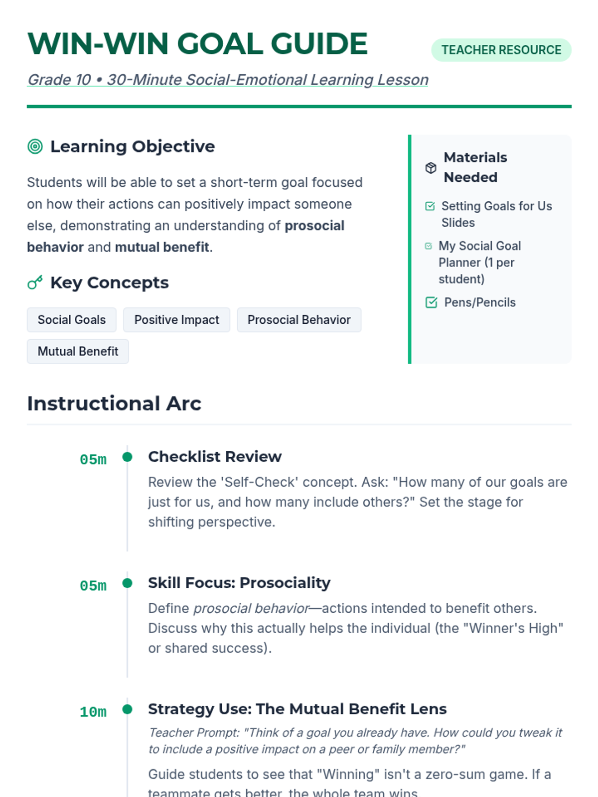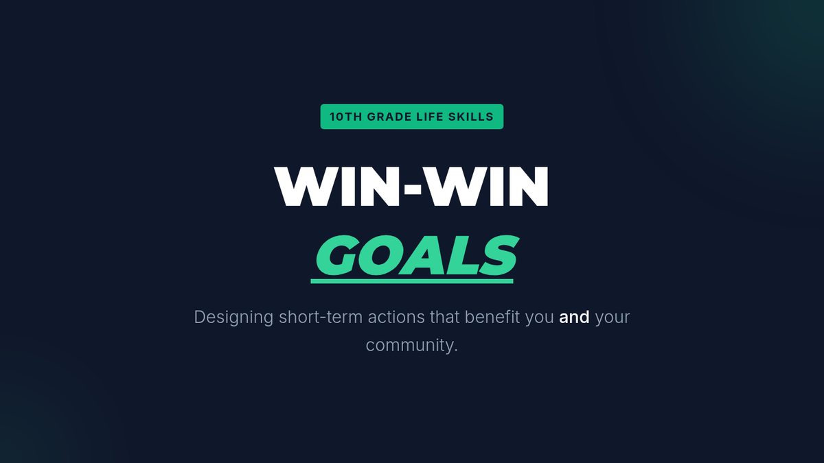 This 30-minute lesson for 10th graders focuses on setting 'prosocial' goals—actions that benefit both the individual and their community. Students will explore the concept of mutual benefit and create a concrete plan to positively impact someone else.