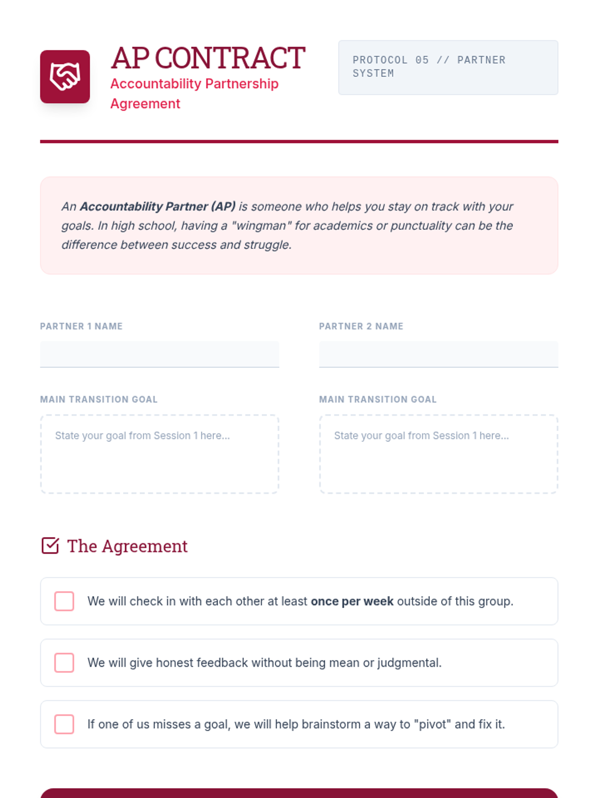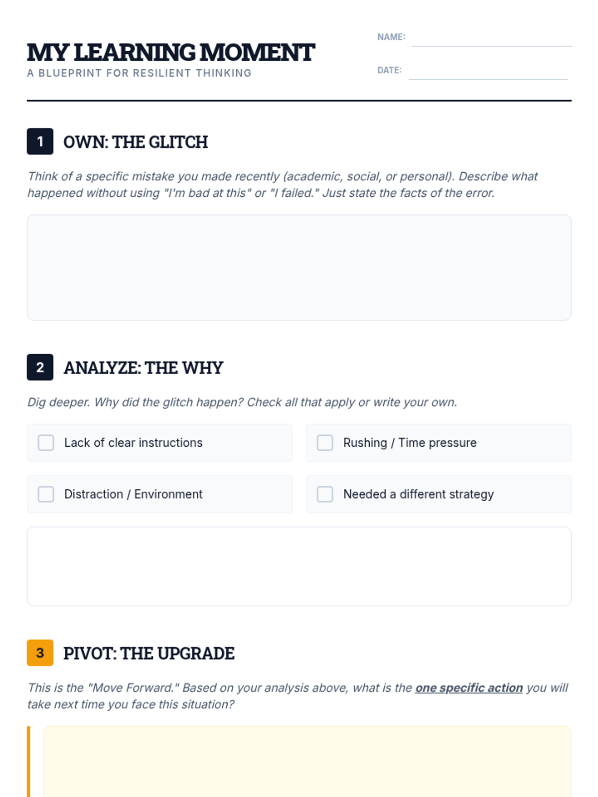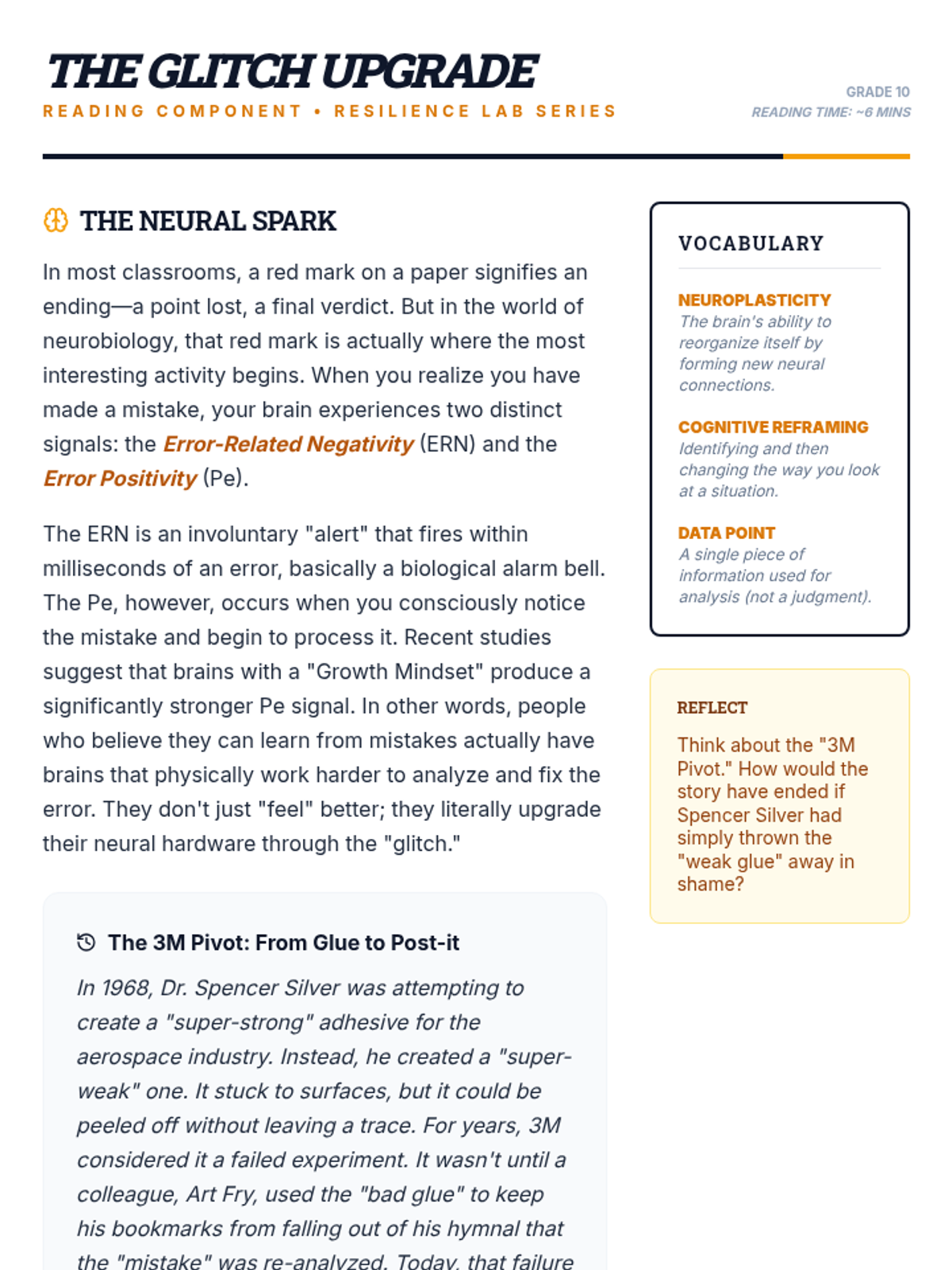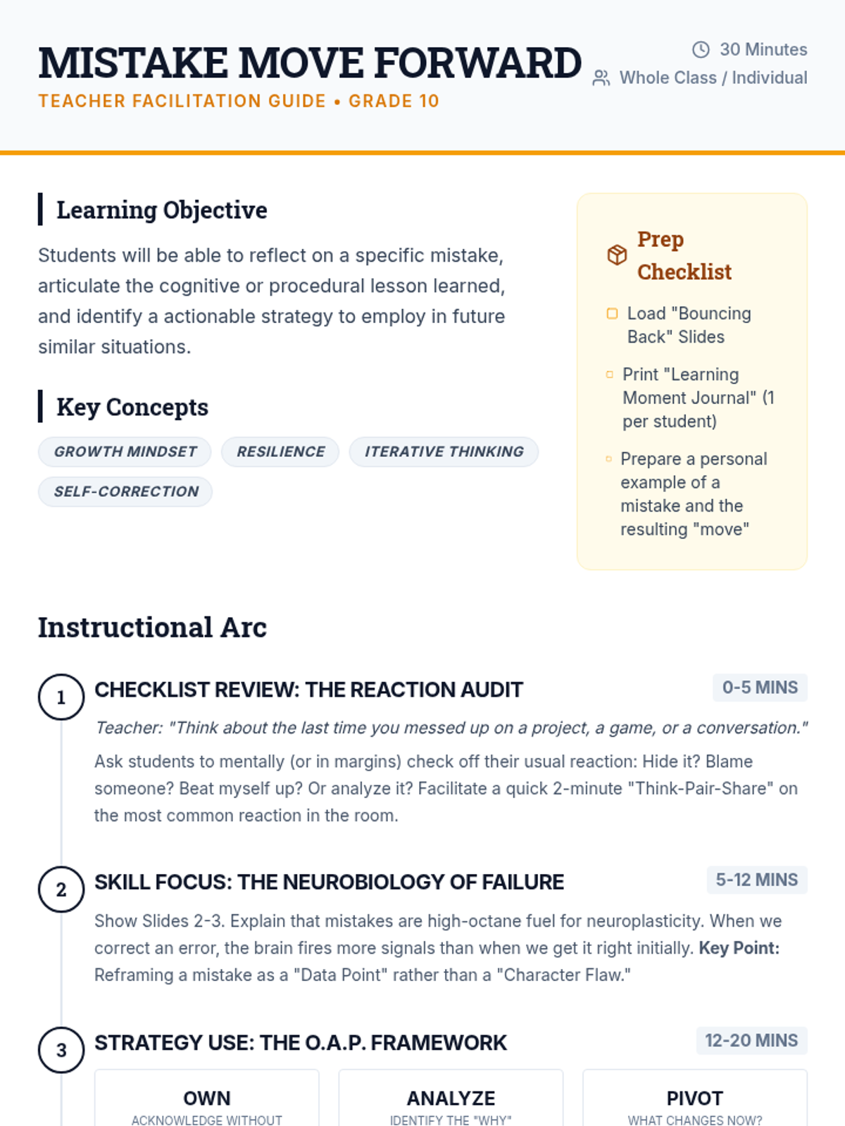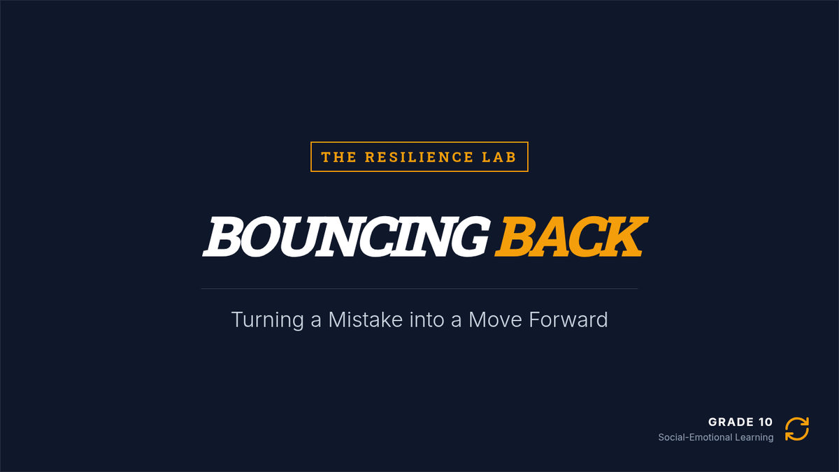A 30-minute social-emotional learning lesson for 10th graders focused on reframing mistakes as opportunities for growth and resilience. Students will analyze personal setbacks and develop a concrete 'pivot strategy' for future challenges.
