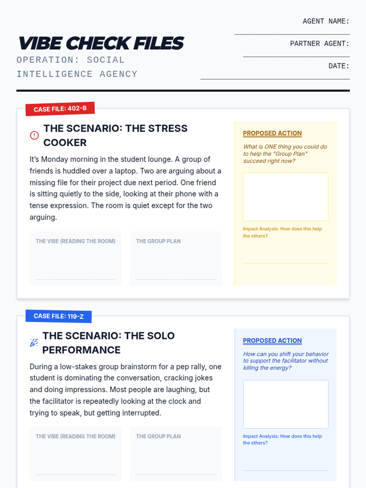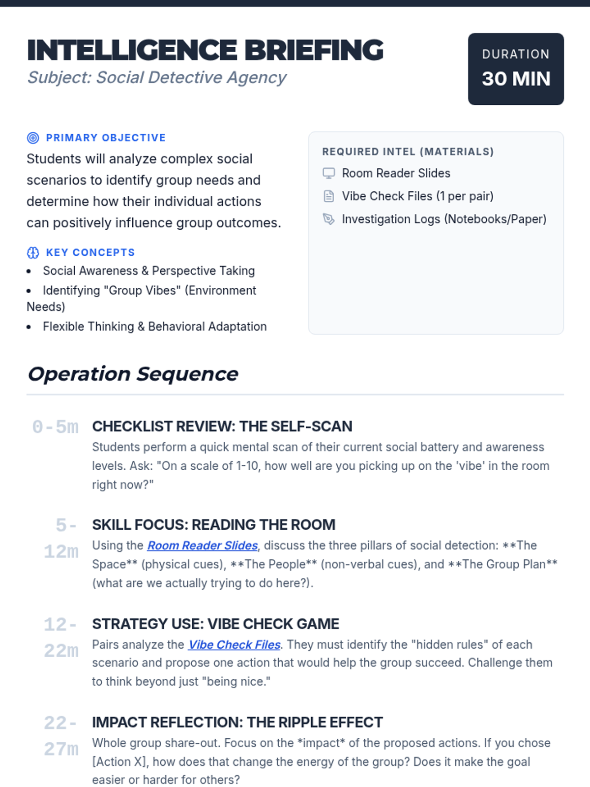 A high-school level lesson focused on developing social awareness and group cooperation skills through an investigative lens. Students learn to 'read the room' and adapt their behavior to support group goals.