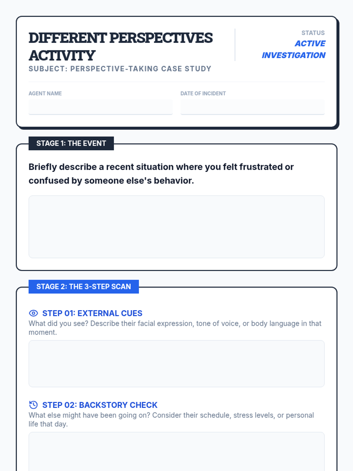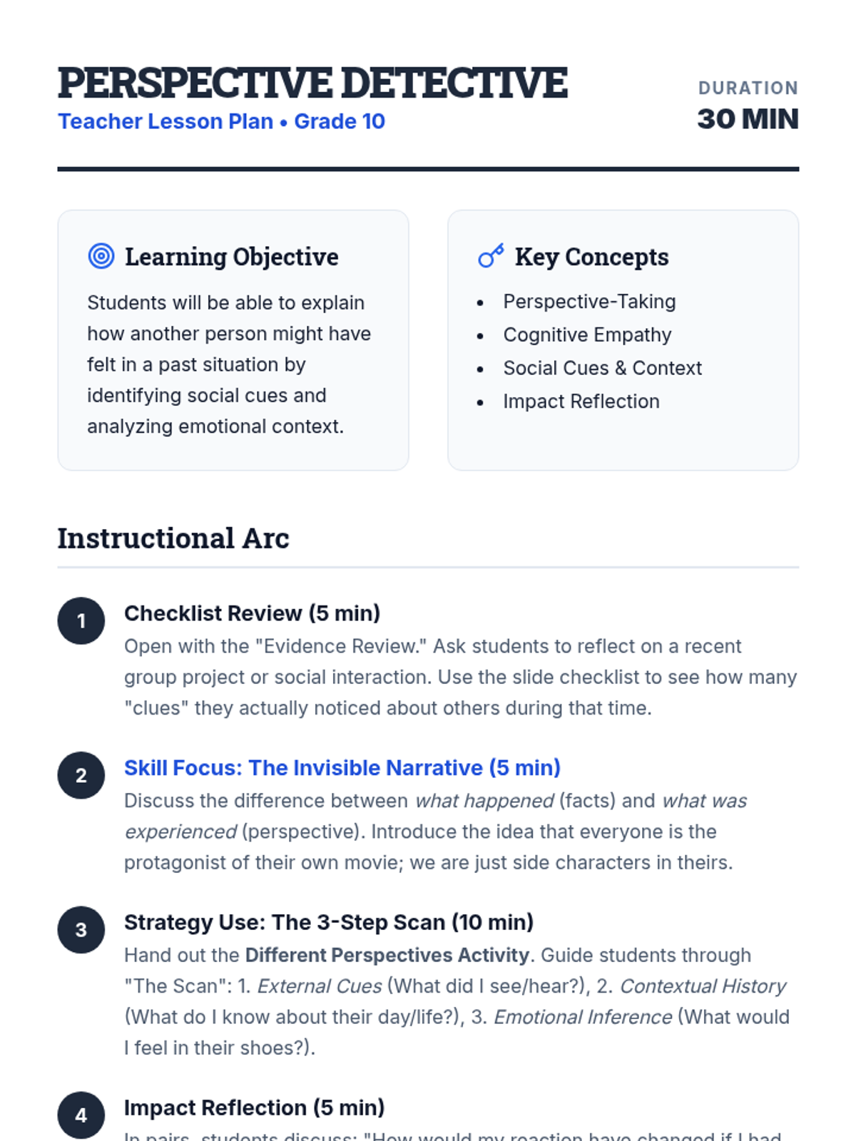 A 30-minute interactive lesson for 10th graders focused on developing perspective-taking and empathy through the 'Detective of Perspective' framework. Students analyze social cues and emotional context to better understand others' viewpoints in complex situations.