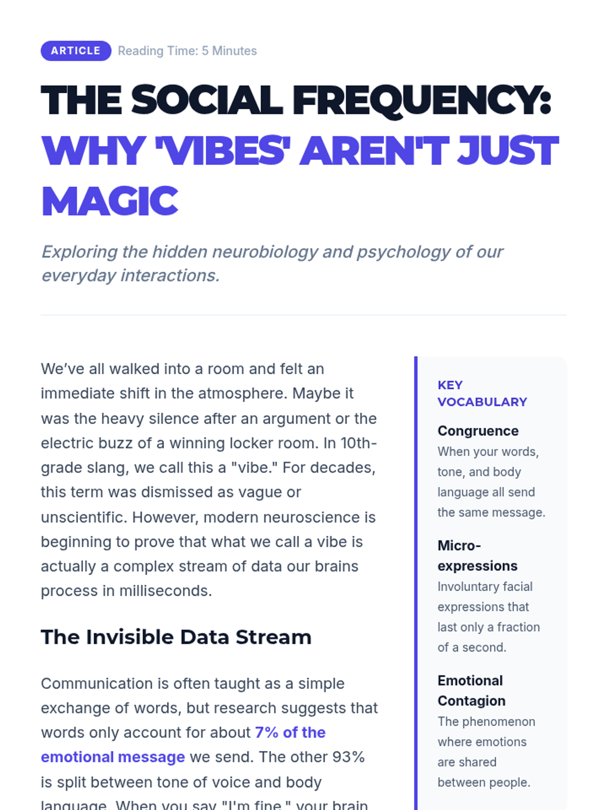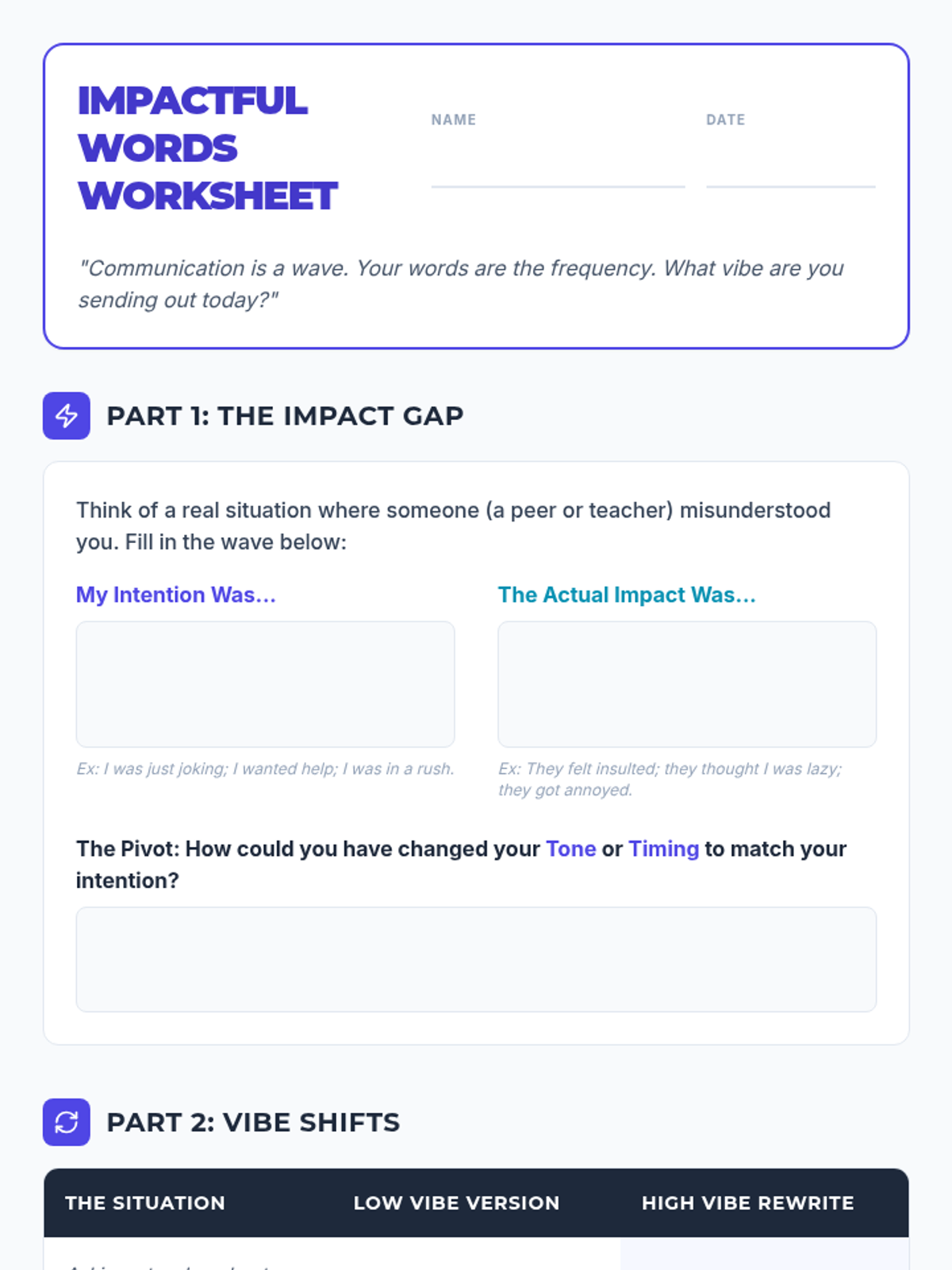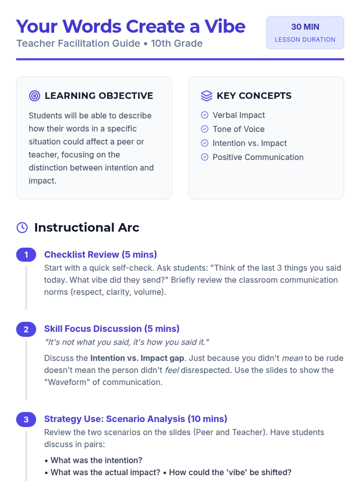 A 30-minute lesson for 10th graders focusing on the power of verbal communication, tone, and the 'vibe' created in social and professional interactions. Students explore the gap between intention and impact through scenario analysis.