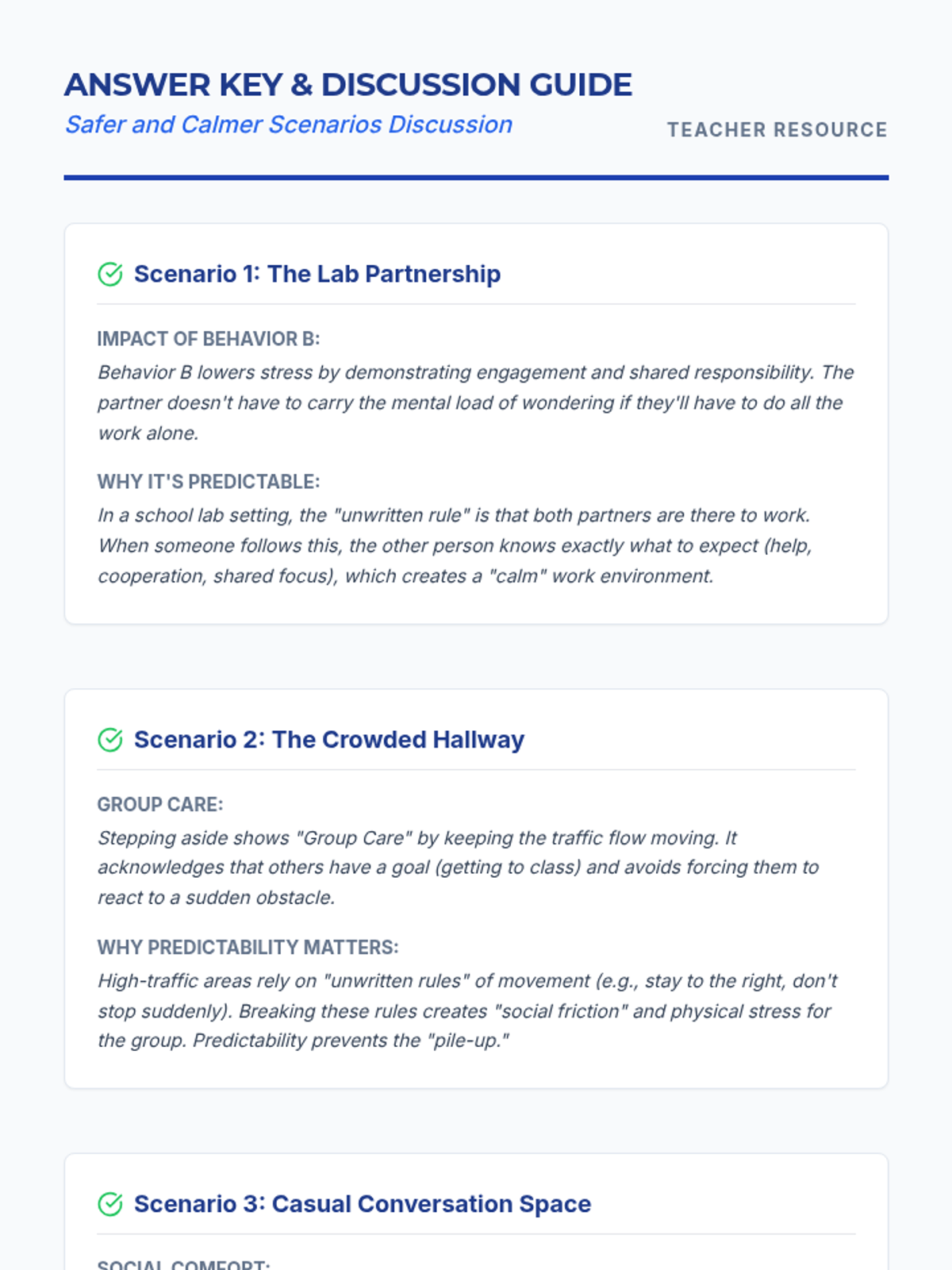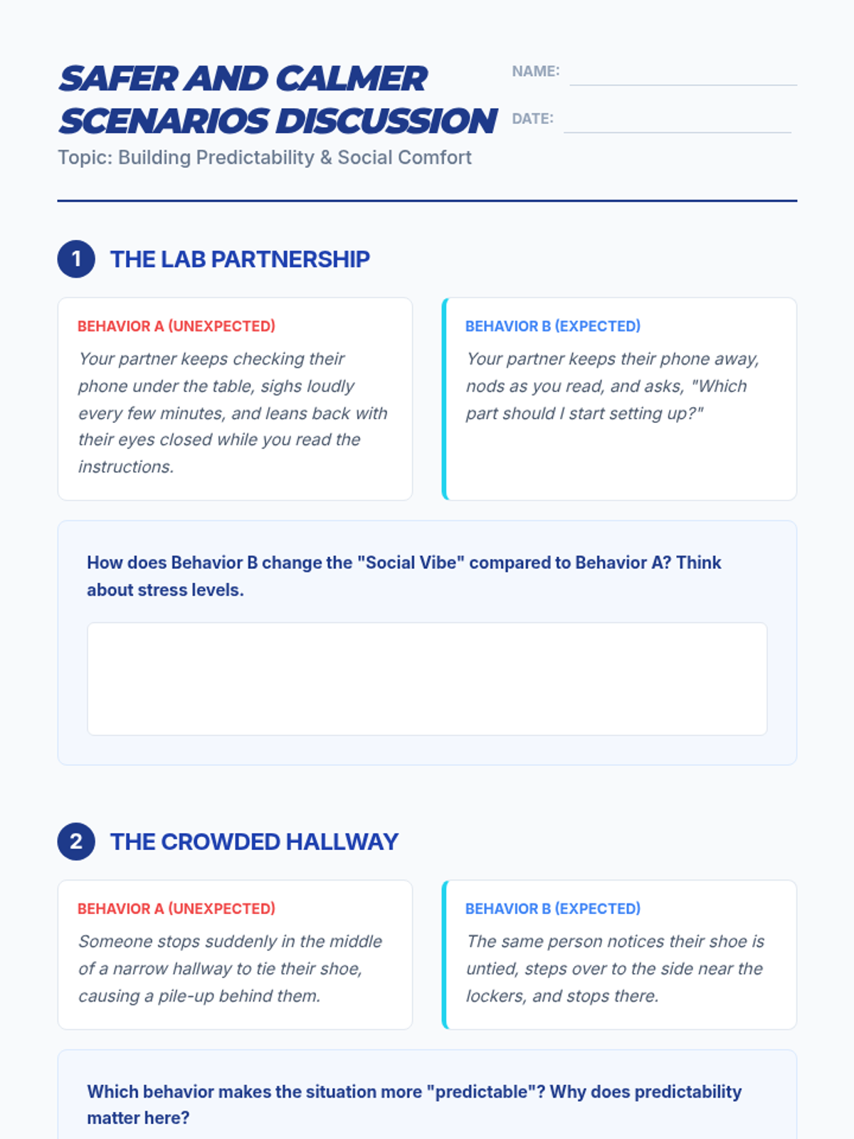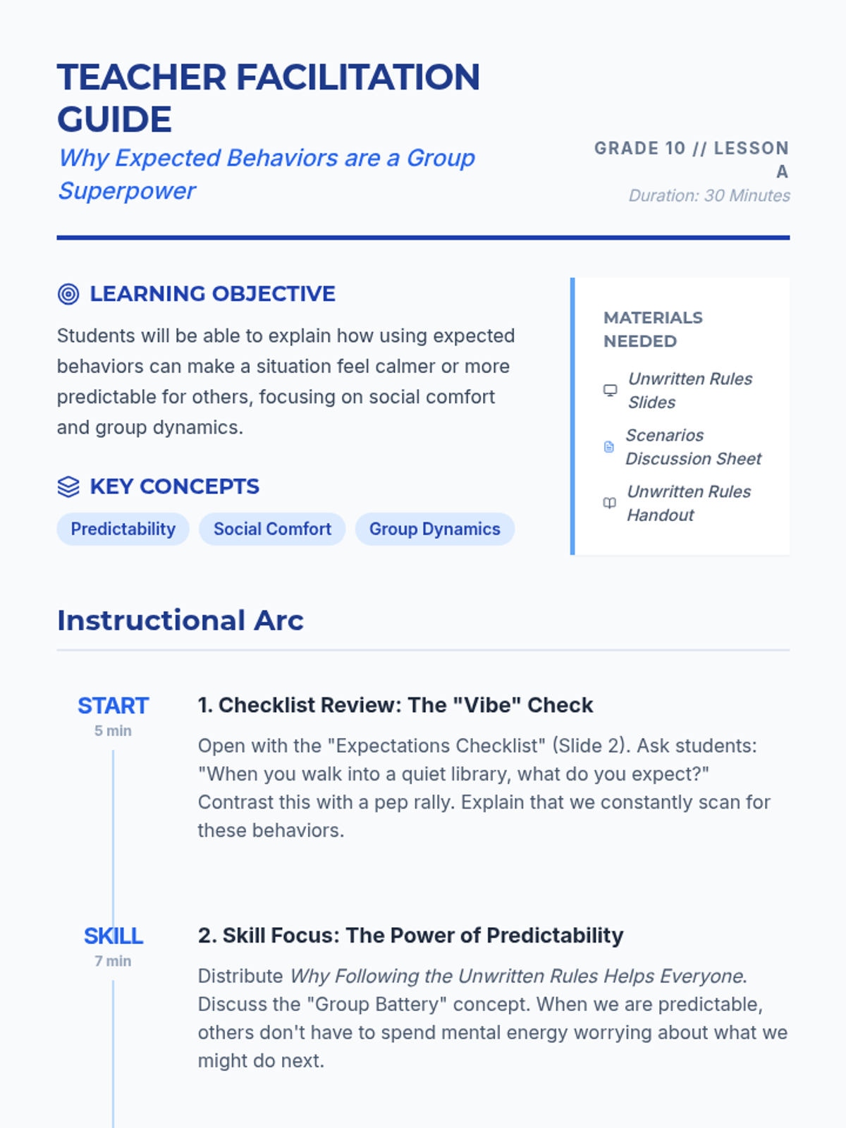 A 30-minute 10th-grade lesson exploring how expected behaviors act as a 'group superpower' by creating predictability and social comfort. Students analyze scenarios to understand the impact of their actions on group dynamics and individual stress levels.