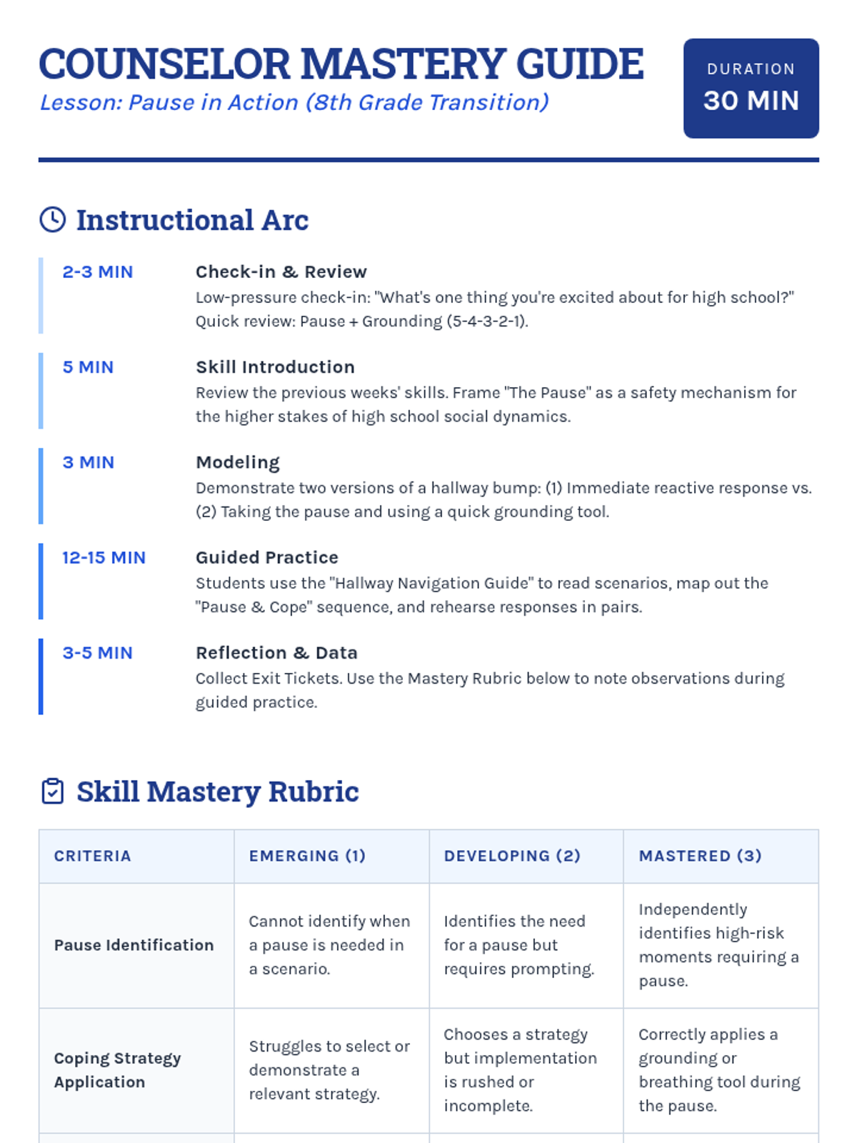 An 8th-grade guidance lesson focused on mastering the 'pause' technique and coping strategies to navigate the social and academic challenges of transitioning to high school.