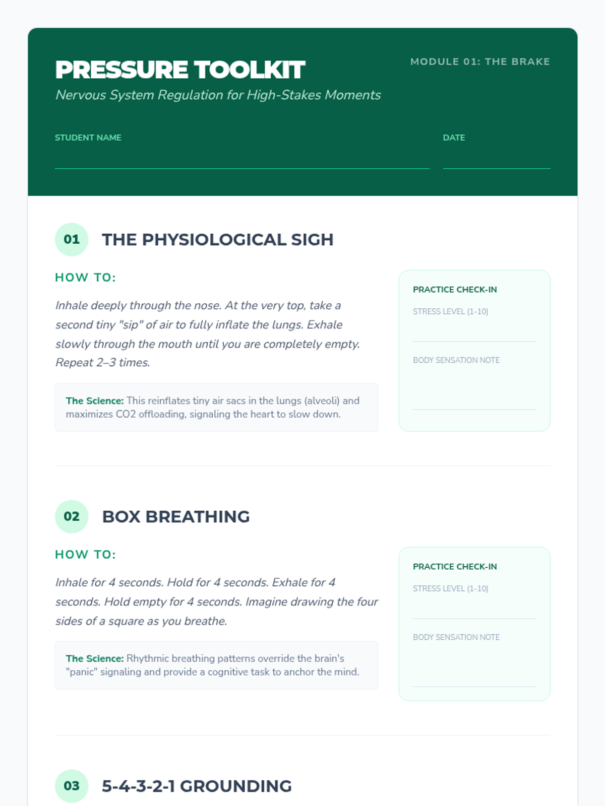 Students explore the science of the stress response and practice immediate techniques to regulate their nervous systems during high-pressure moments like exams or major life decisions.