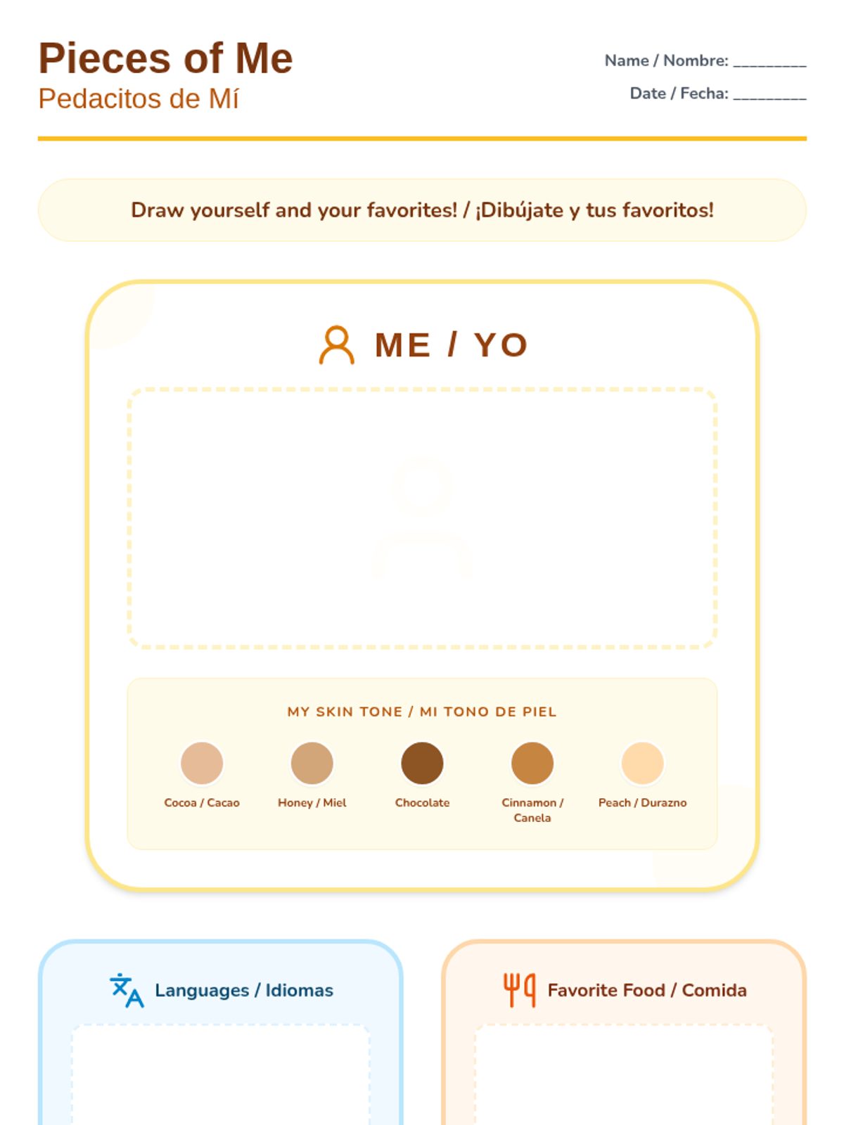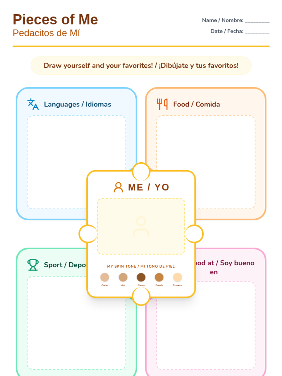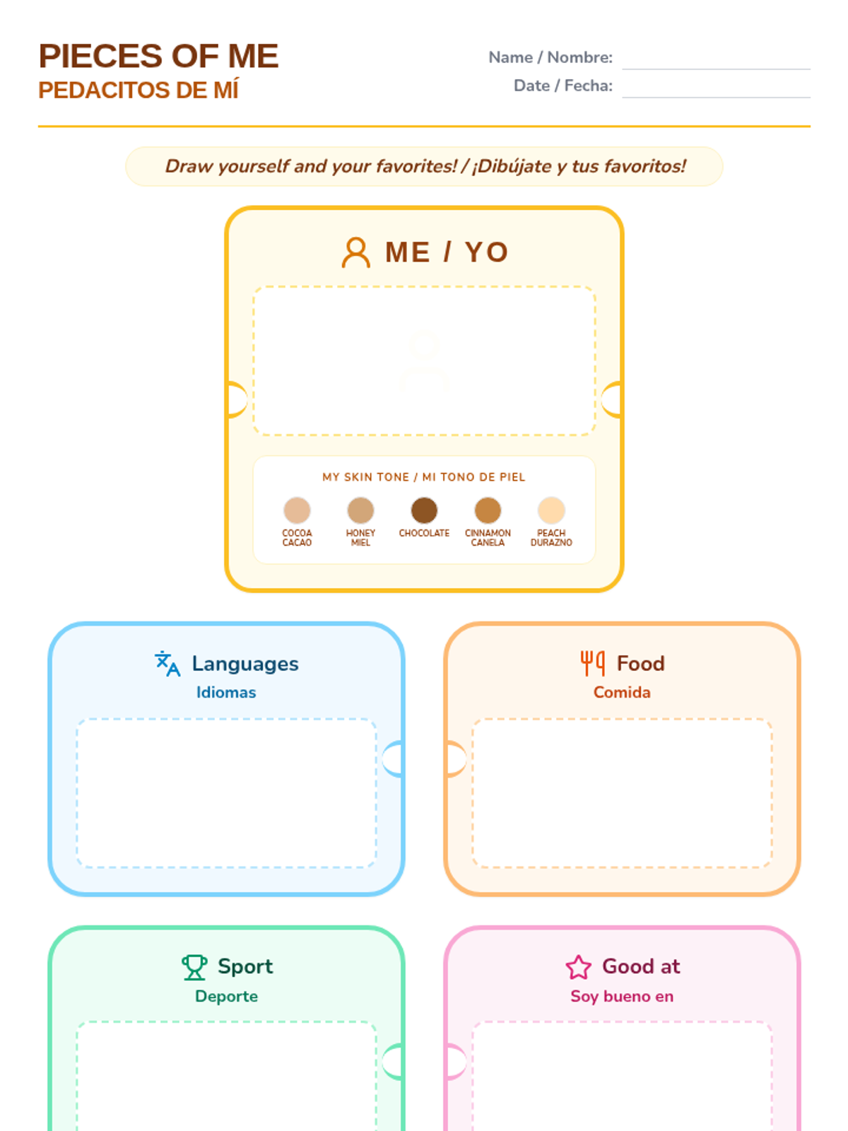 A bilingual kindergarten lesson exploring diversity and self-identity inspired by 'The Colors of Us' by Karen Katz. Students celebrate their unique skin tones and personal traits through the 'Pieces of Me' activity.