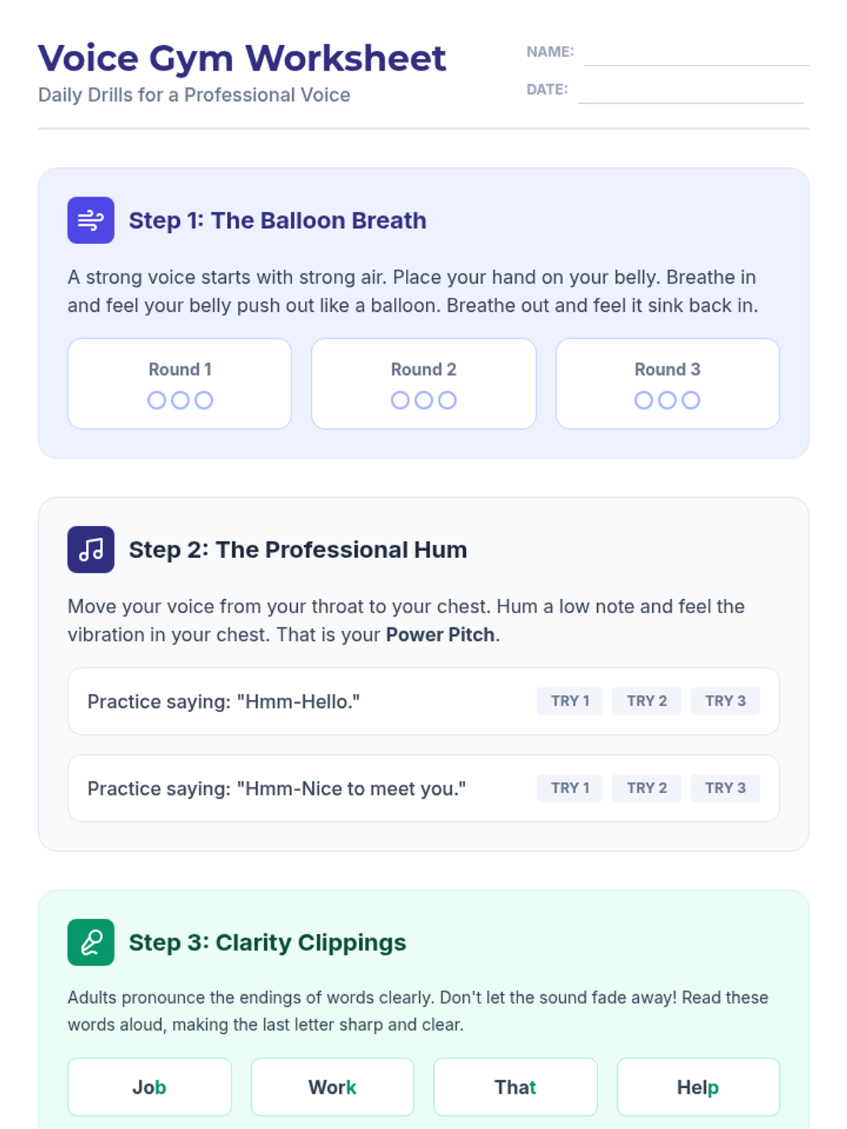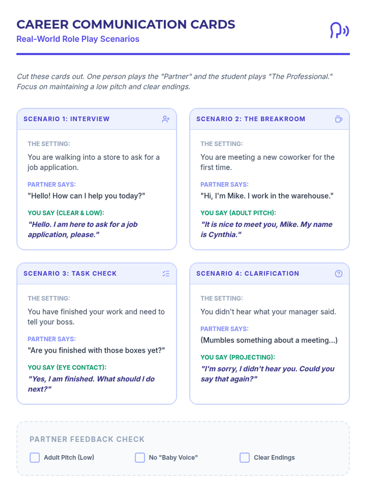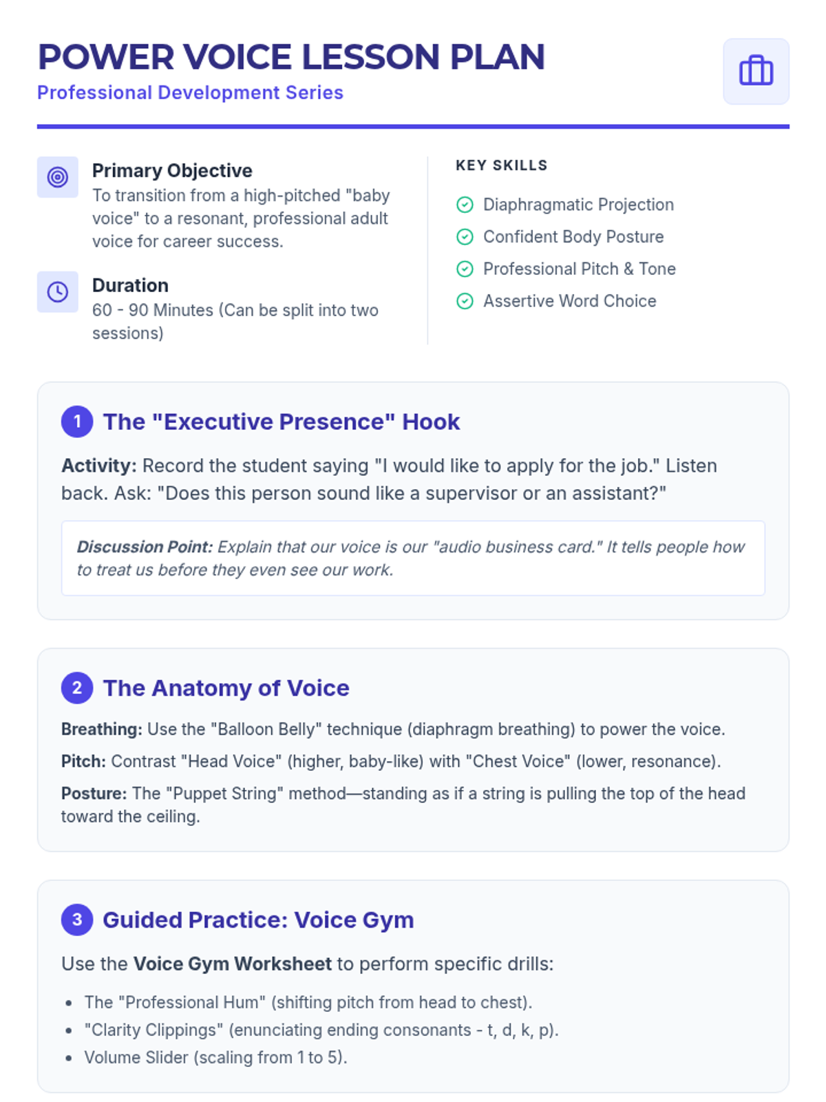 A comprehensive lesson designed to help adults with disabilities overcome anxiety-based 'baby voice' and develop a professional, confident vocal presence for employment and social settings.