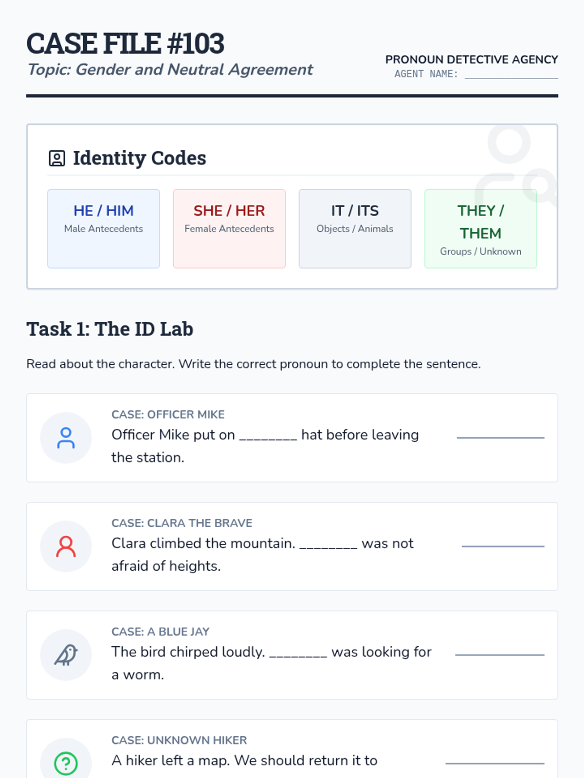 Students explore gendered and neutral pronouns, practicing how to select the right words to refer to individuals and groups accurately.