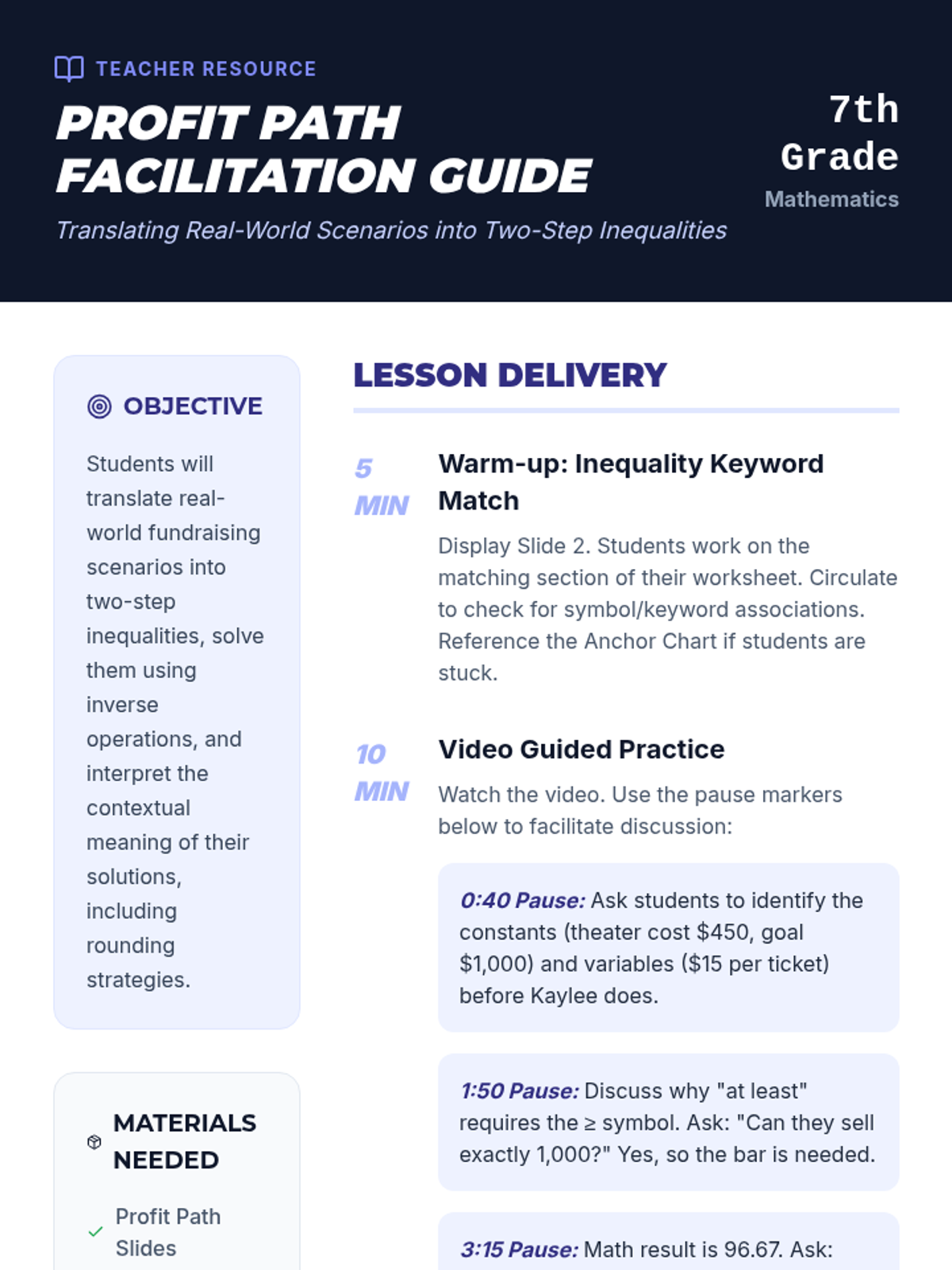 Students will learn to translate real-world fundraising scenarios into two-step inequalities, solve them using inverse operations, and interpret the contextual meaning of their solutions, including rounding strategies.