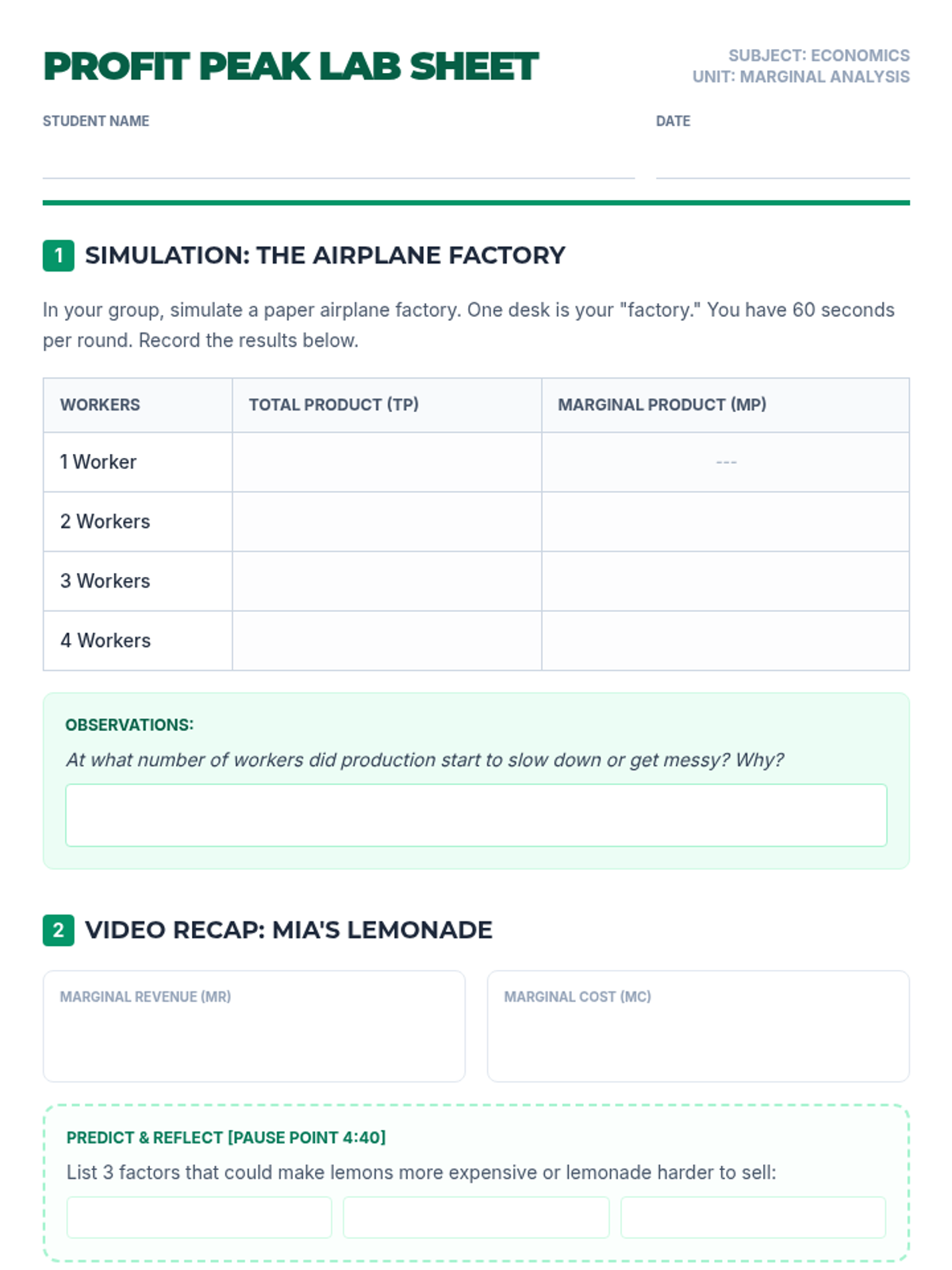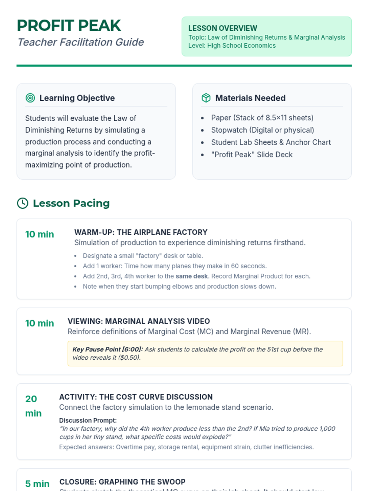 A hands-on high school economics lesson exploring the Law of Diminishing Returns and Marginal Analysis through a paper airplane factory simulation and video-based discussion.
