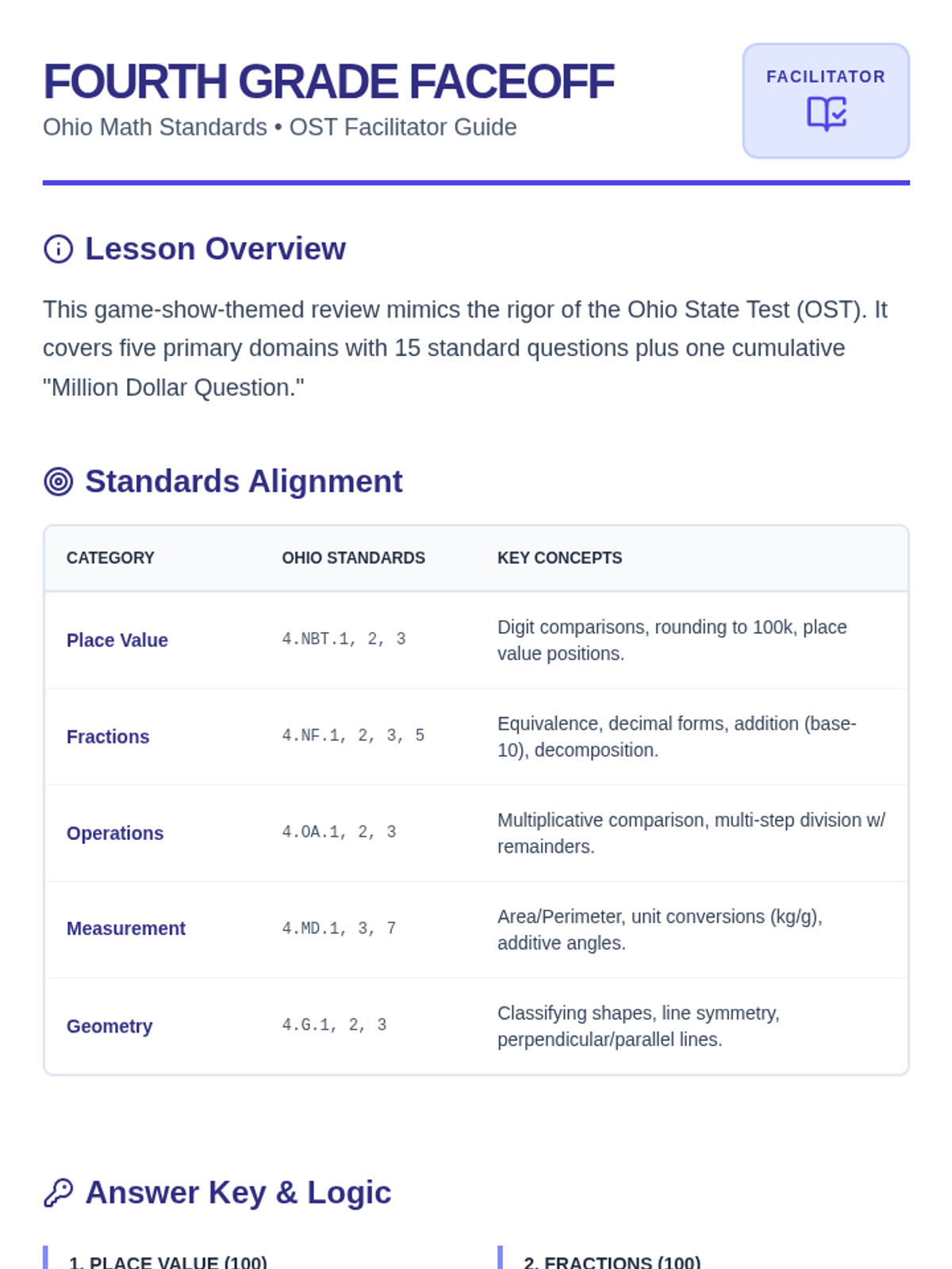 A high-energy, game-show-themed review session covering the full spectrum of 4th Grade Ohio Math Standards to prepare students for the OST.