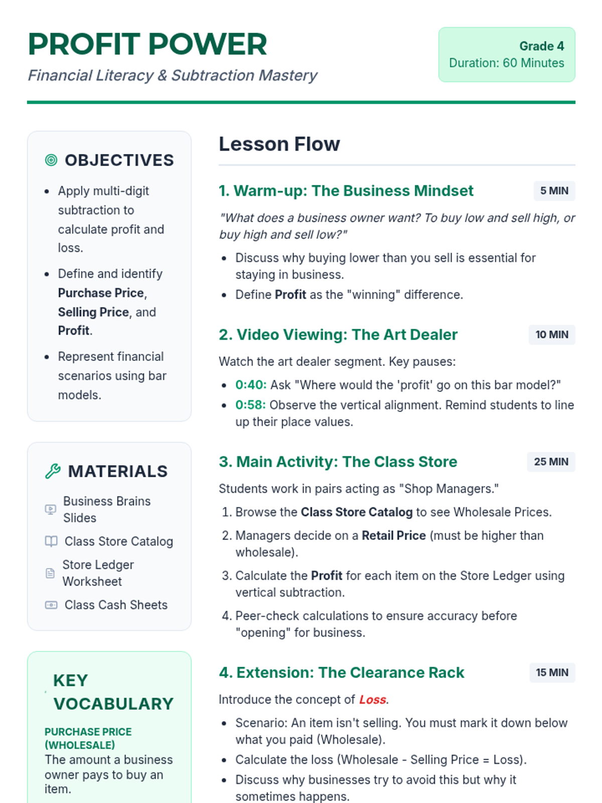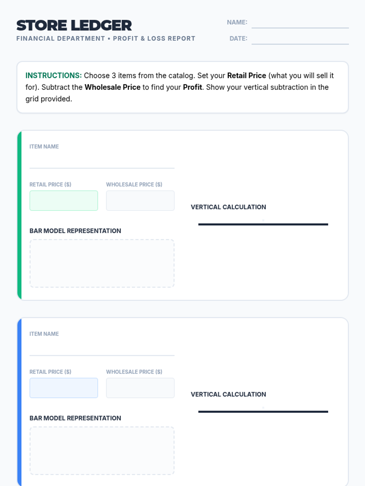 A financial literacy lesson where 4th-grade students use vertical subtraction to calculate profit and loss for a mock classroom store.