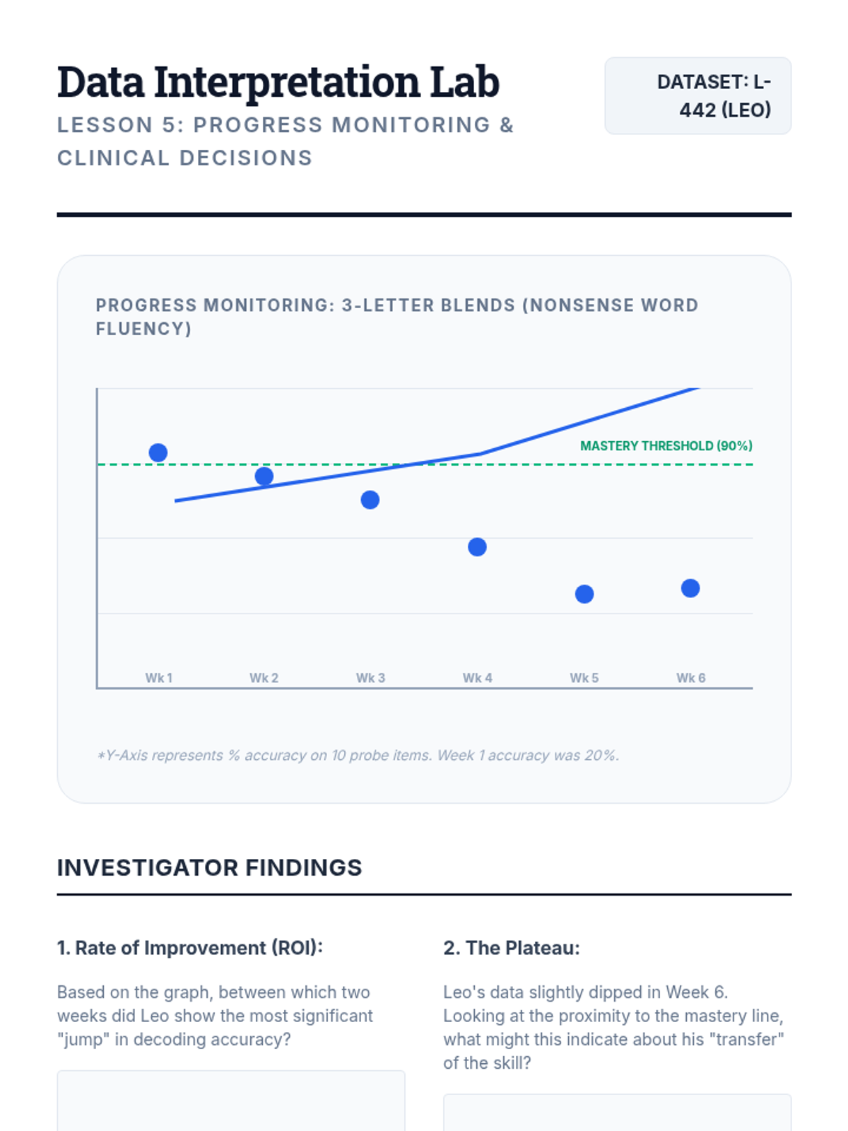 Students learn to measure growth over time using nonsense word fluency and spelling inventories to determine mastery of phonics patterns.