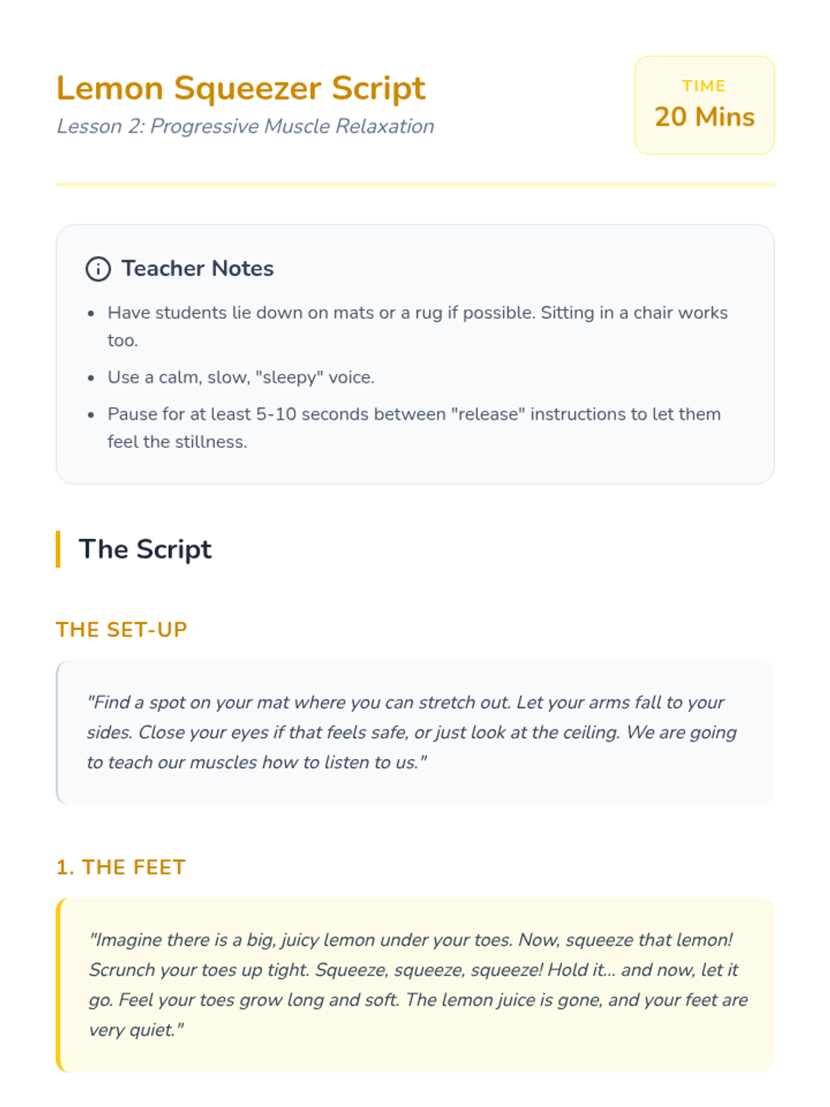 Guided by the teacher, students lie on mats and systematically squeeze and release specific muscle groups to learn voluntary tension release.