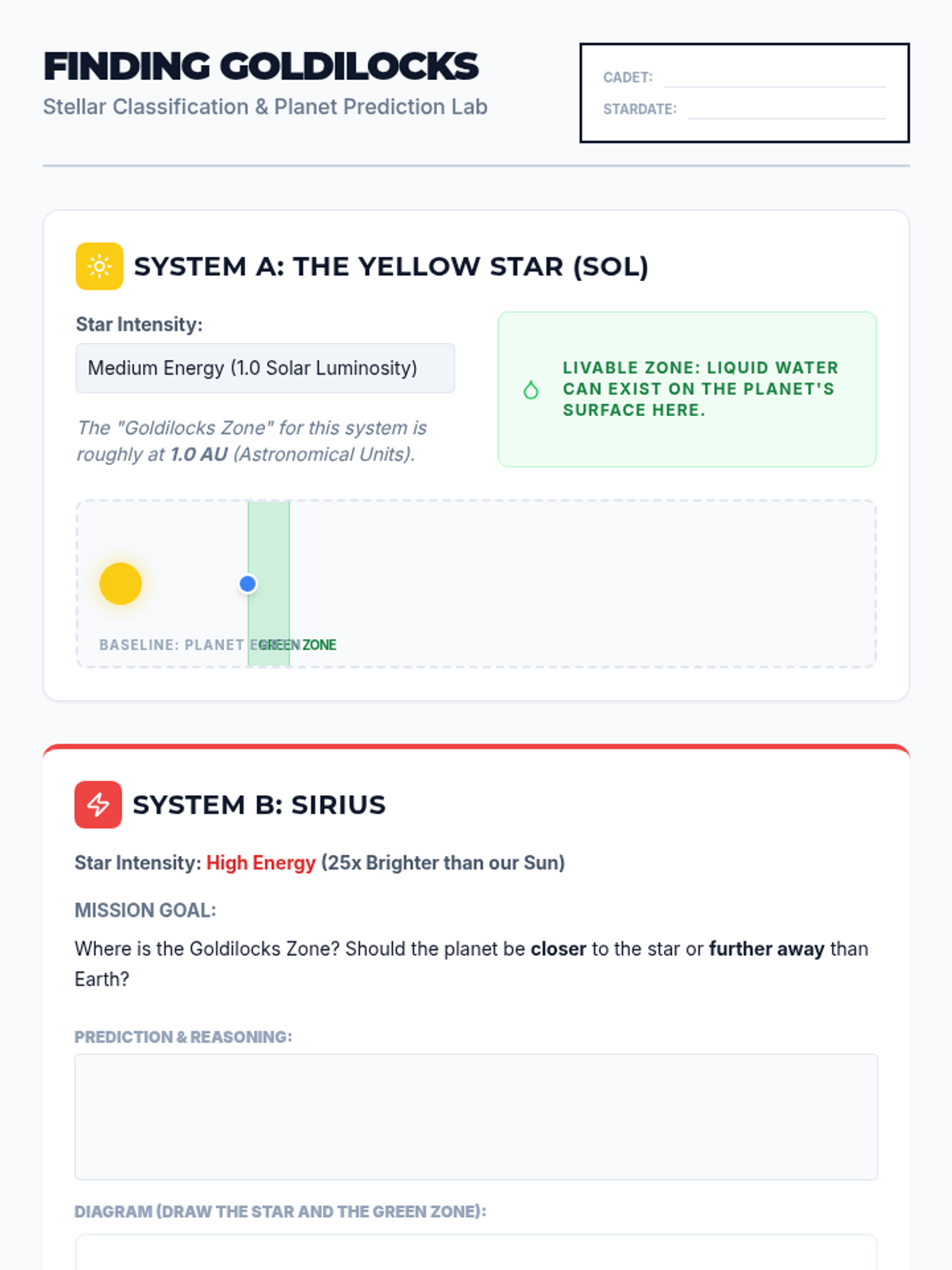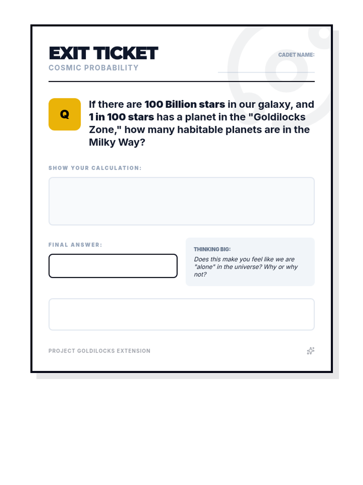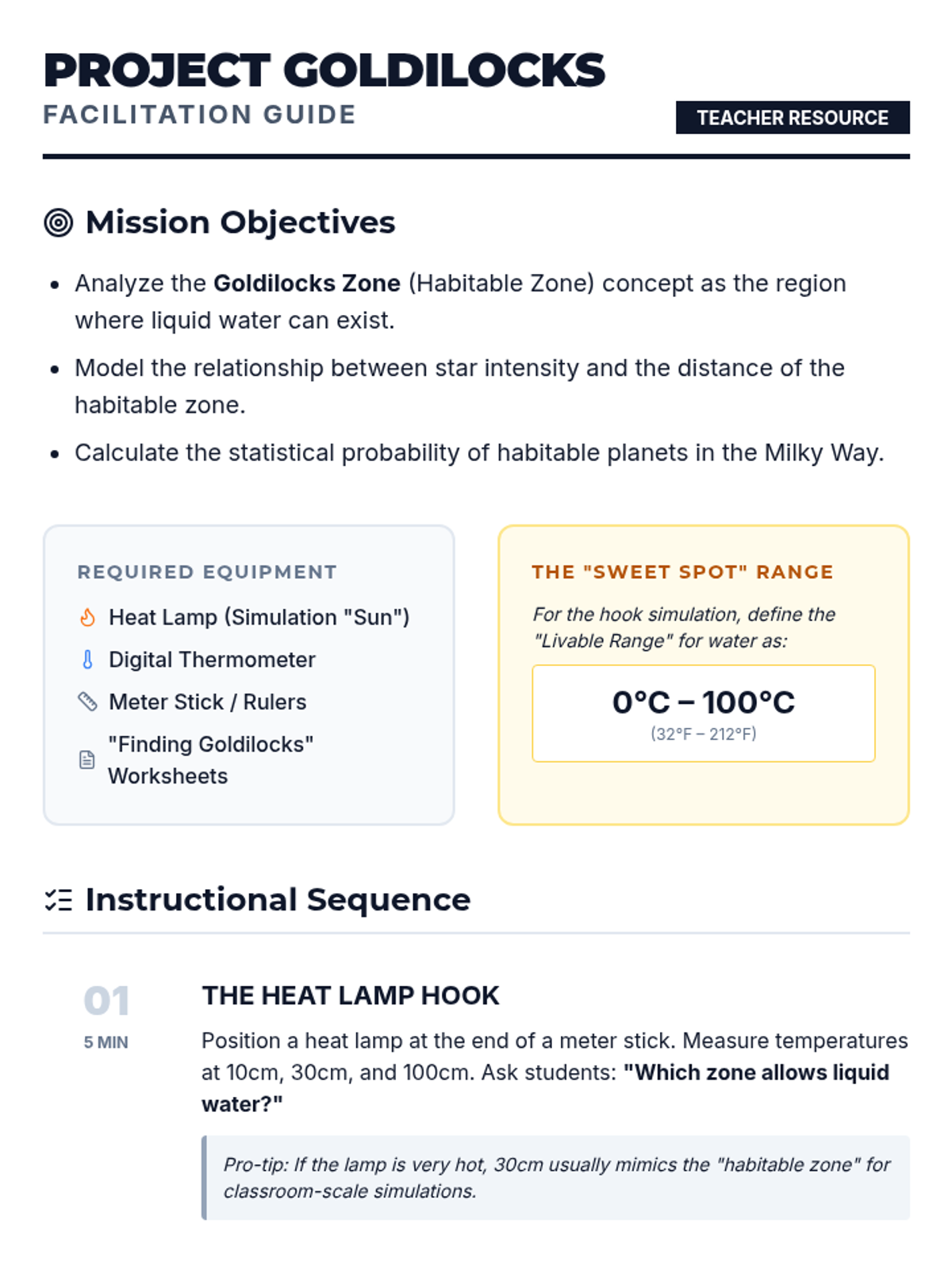 Students explore the Habitable Zone (Goldilocks Zone) by conducting a heat lamp simulation, watching a scientific overview, and predicting planetary locations for different star types. The lesson culminates in a statistical analysis of the probability of life in our galaxy.