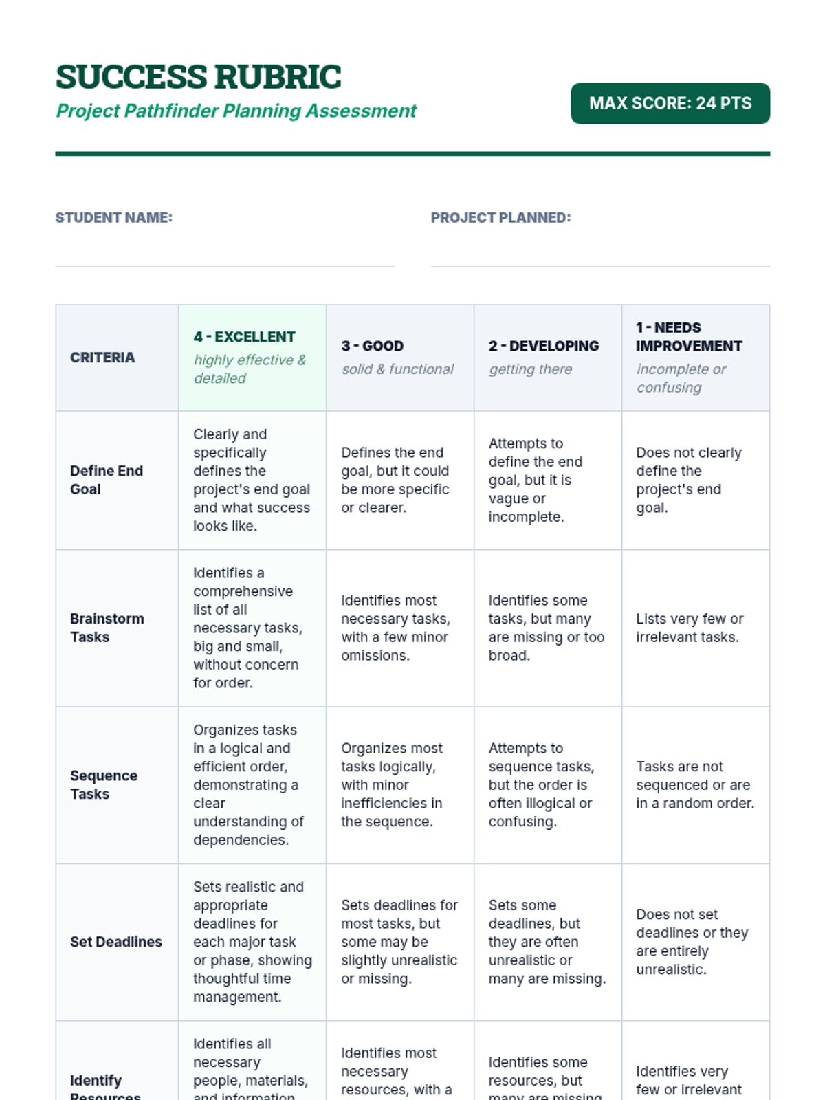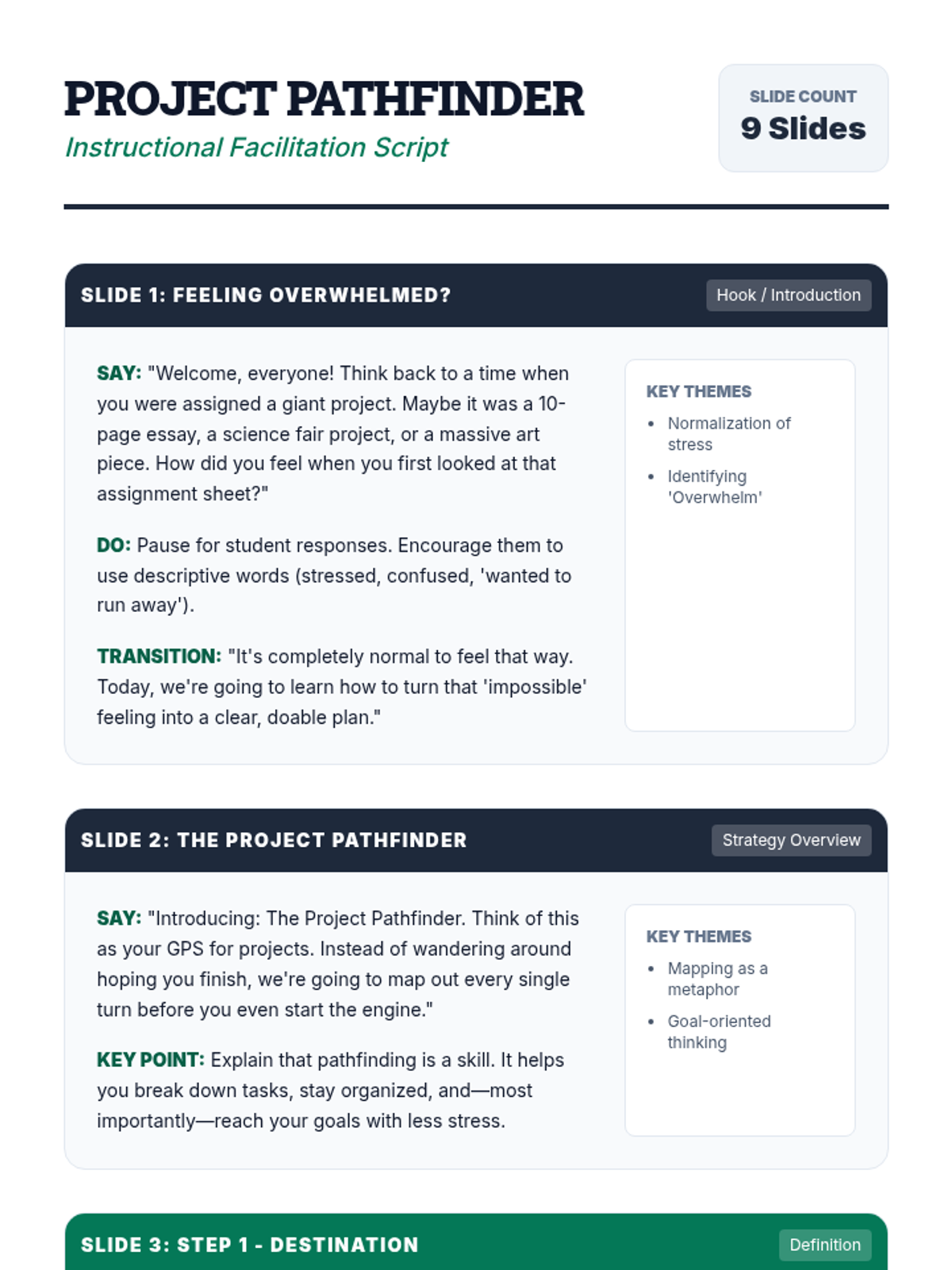 This lesson equips middle school students with the Project Pathfinder strategy, a 5-step framework to break down large, intimidating projects into manageable, sequenced tasks. Students will apply the strategy to a real project, creating a roadmap that includes goals, tasks, deadlines, and resources.