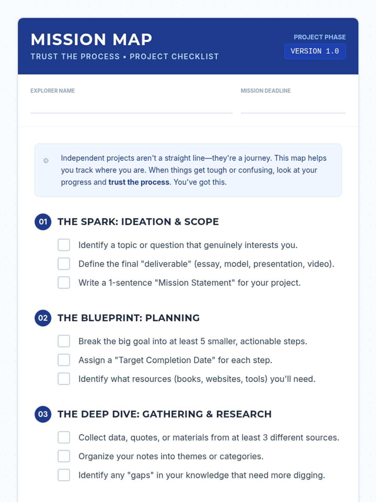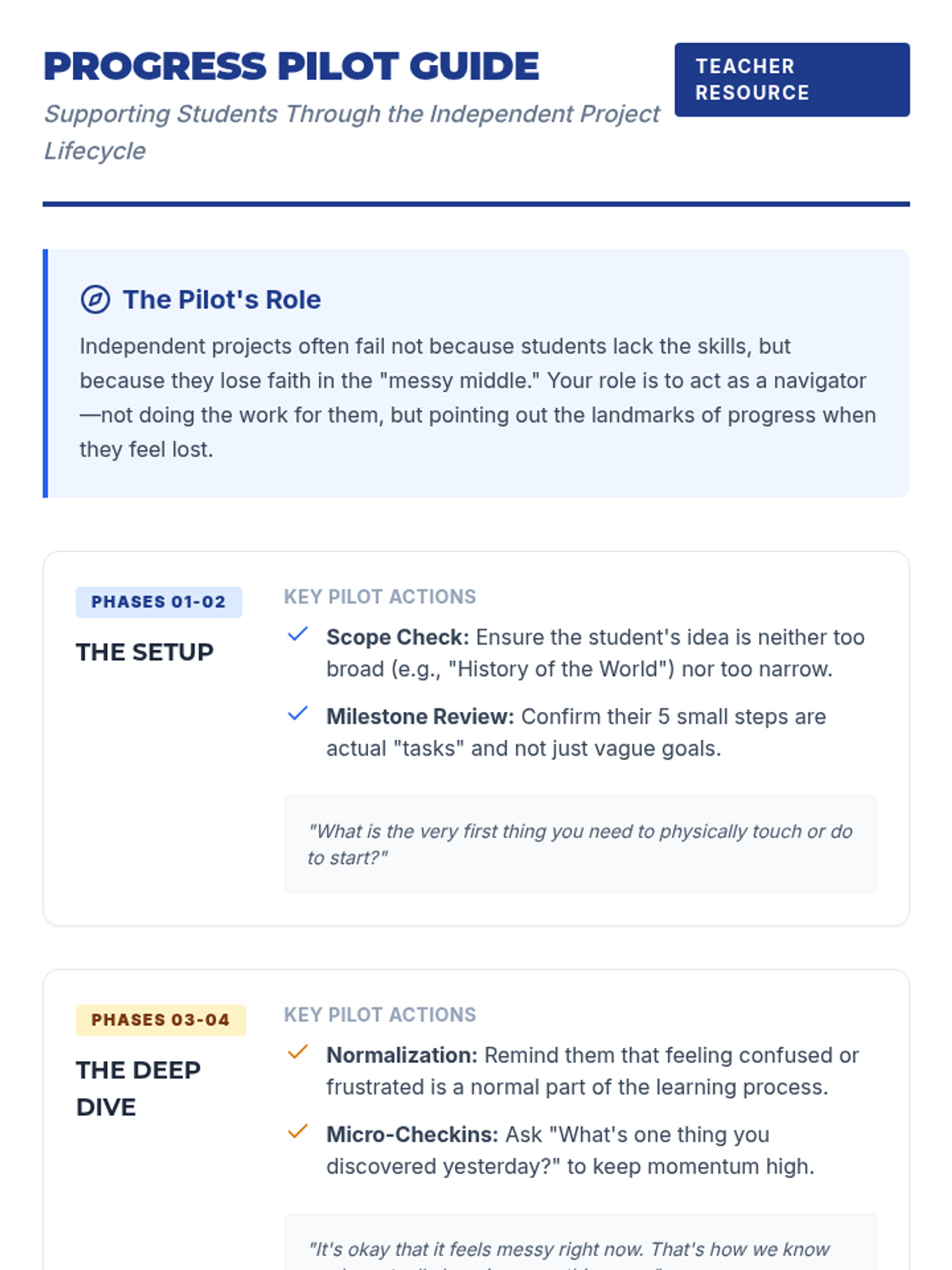 A comprehensive toolkit designed to help students navigate long-term, independent projects by breaking them down into manageable phases and maintaining momentum through the 'messy middle'.