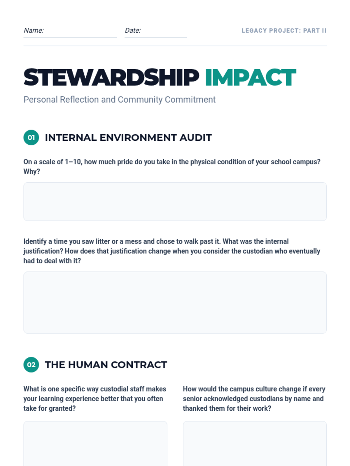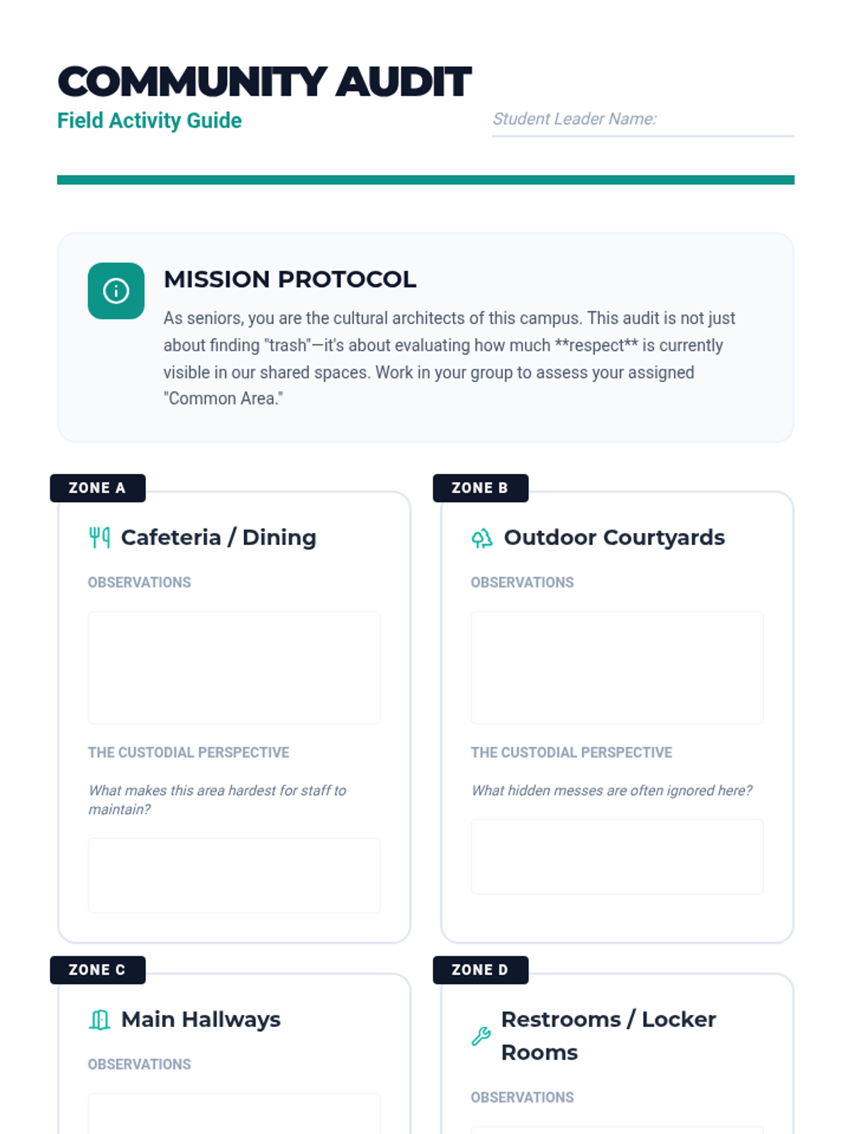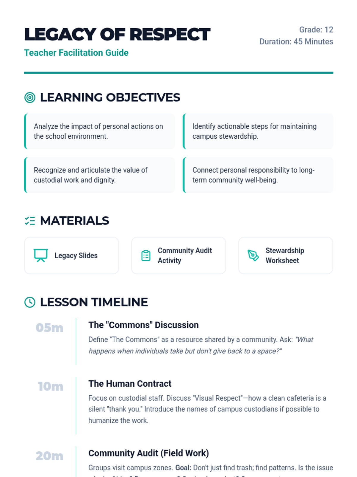 A comprehensive 45-minute lesson for 12th graders focusing on the intersection of campus cleanliness, community leadership, and respect for custodial staff. Students explore their role as stewards of shared spaces and leaders within the school community.