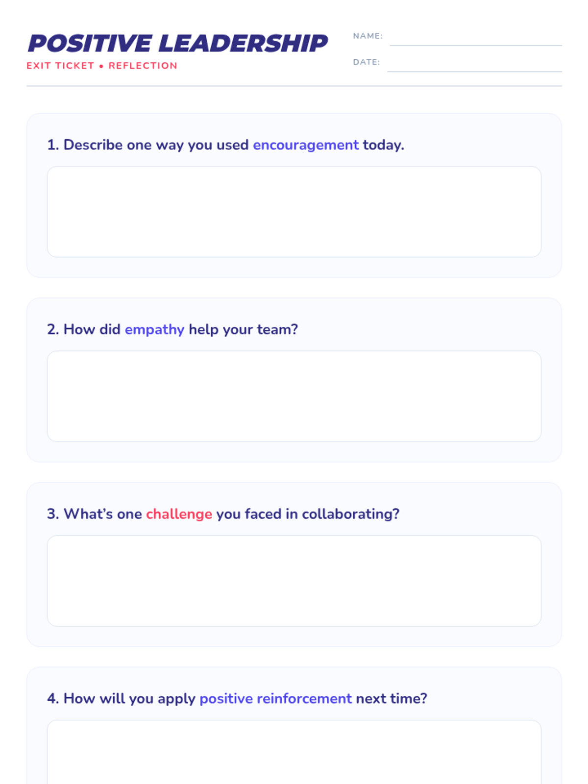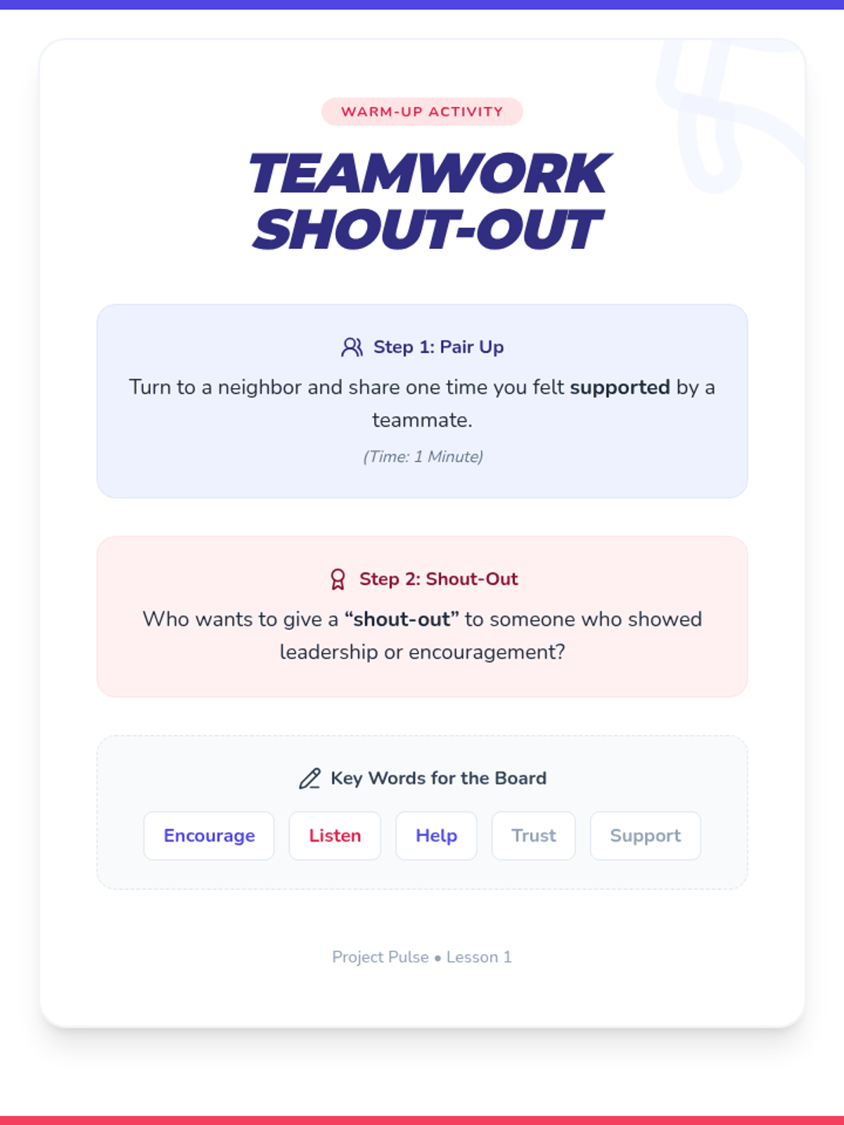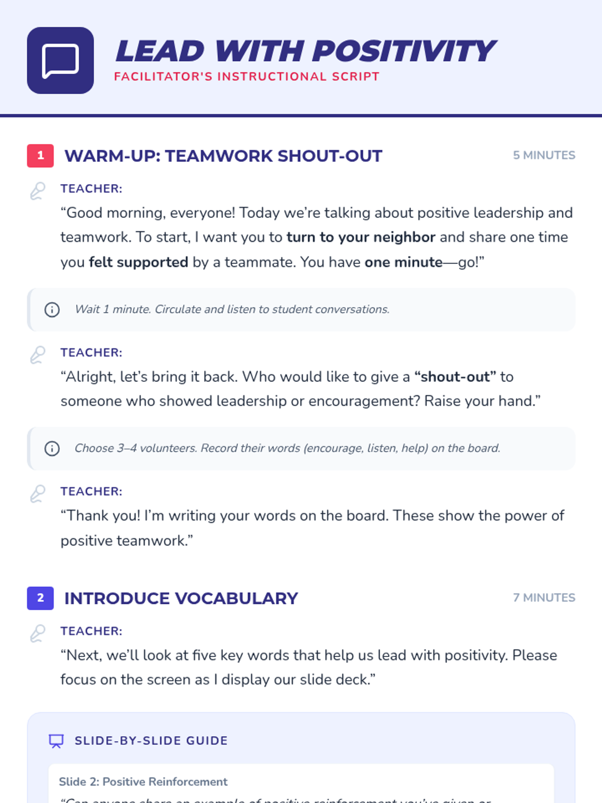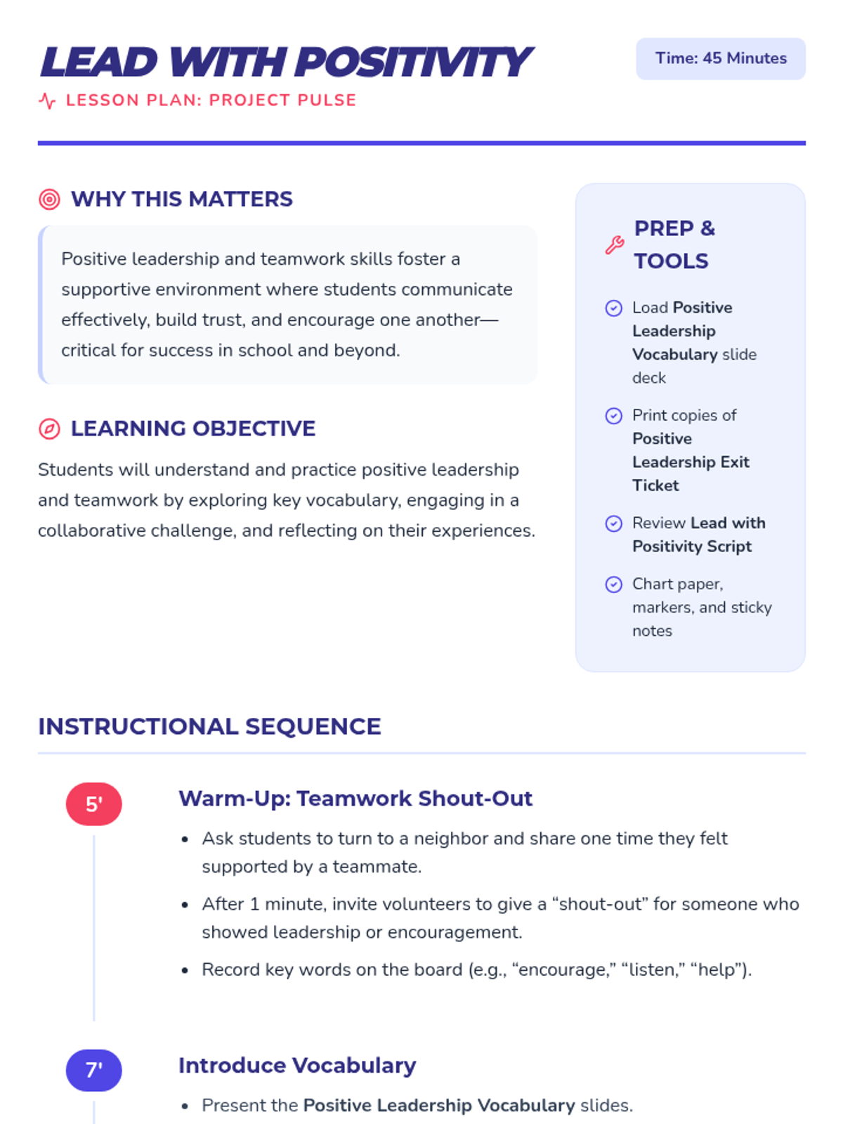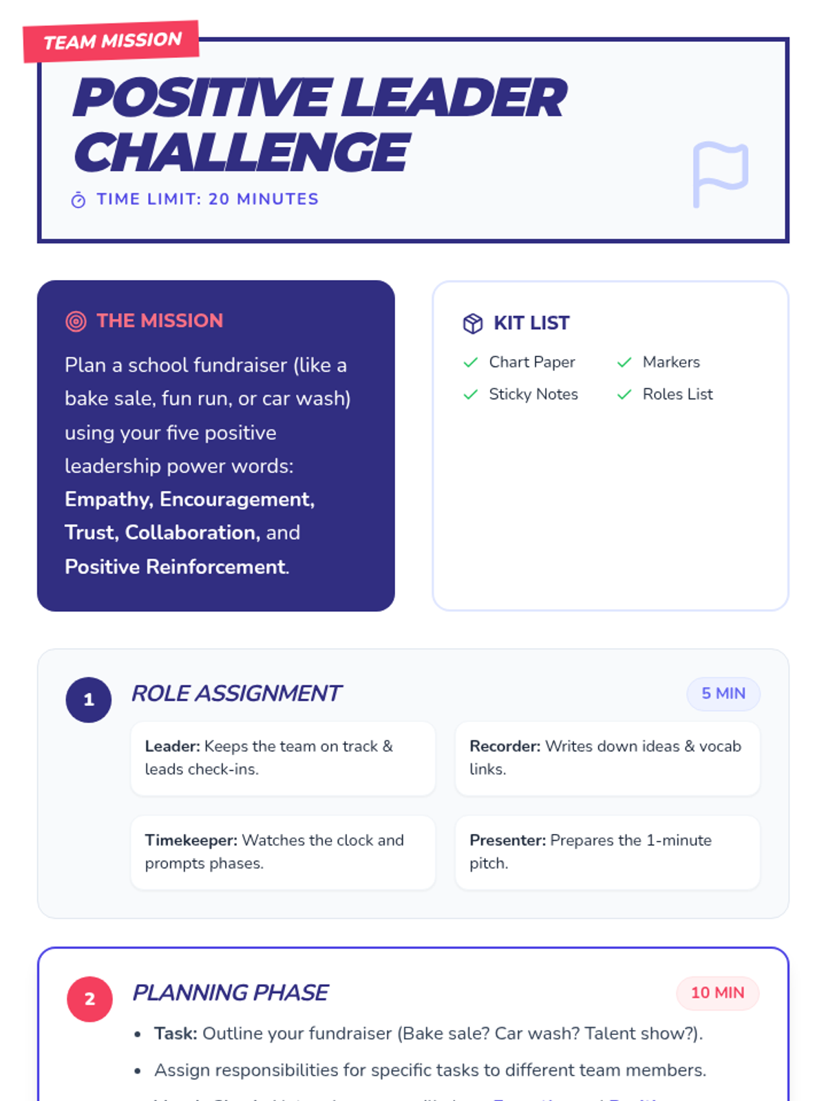 In this dynamic 45-minute session, students explore the power of positive leadership and teamwork through engaging discussions, activities, and reflection. This lesson builds essential skills like communication, trust-building, and encouragement to create supportive team environments.