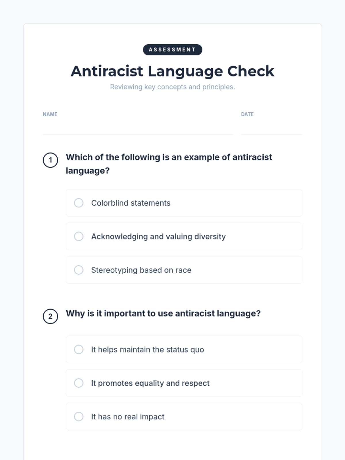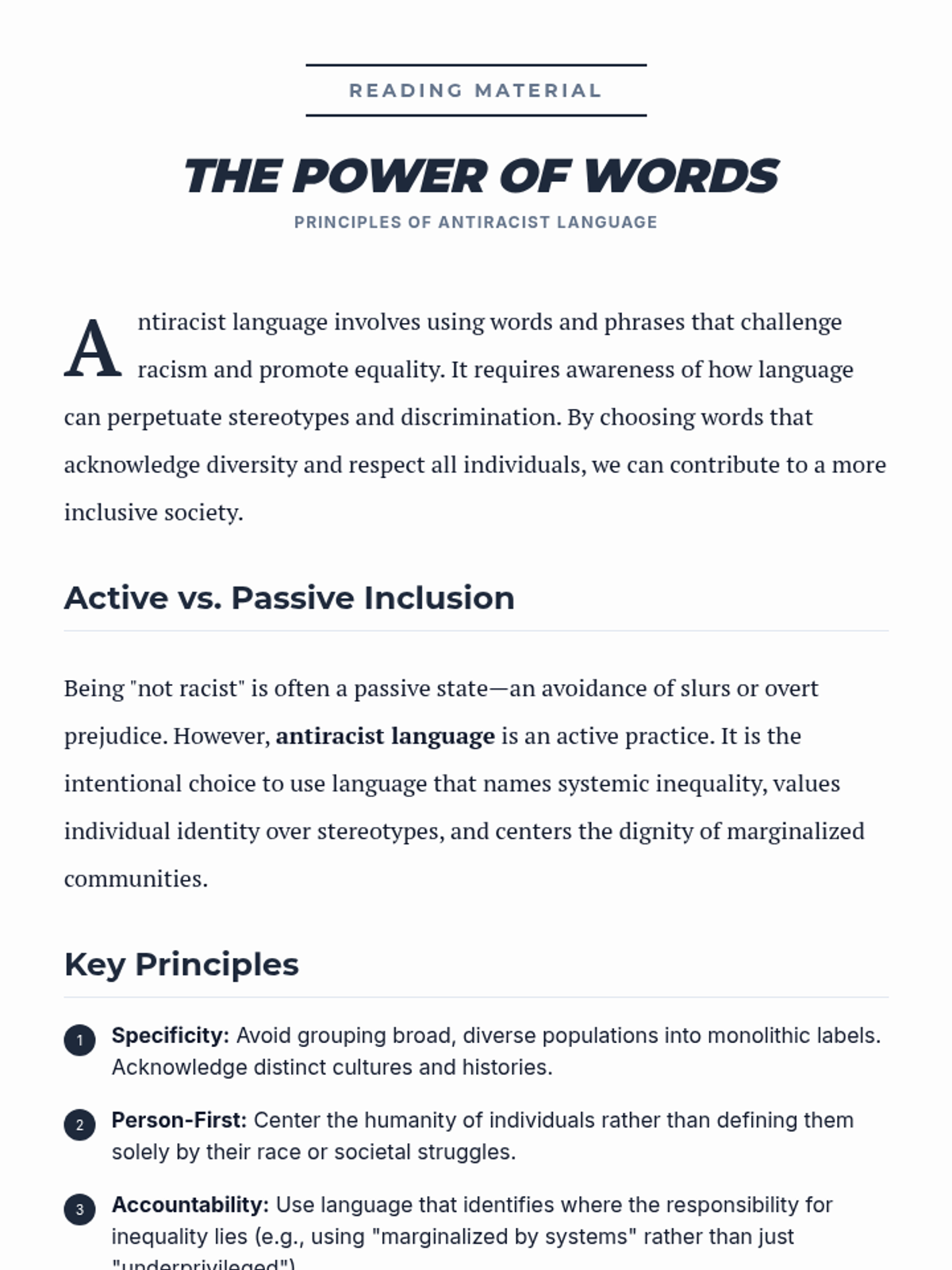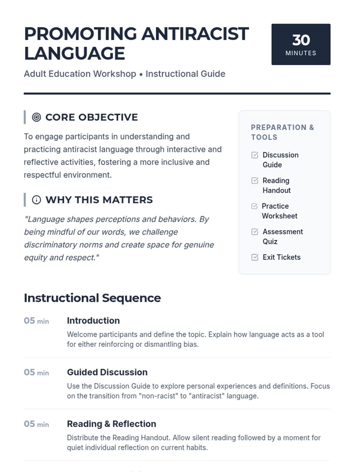This 30-minute interactive lesson for adults focuses on understanding and practicing antiracist language. Participants explore the impact of words on perceptions and learn concrete strategies for fostering inclusive, respectful communication in daily interactions.