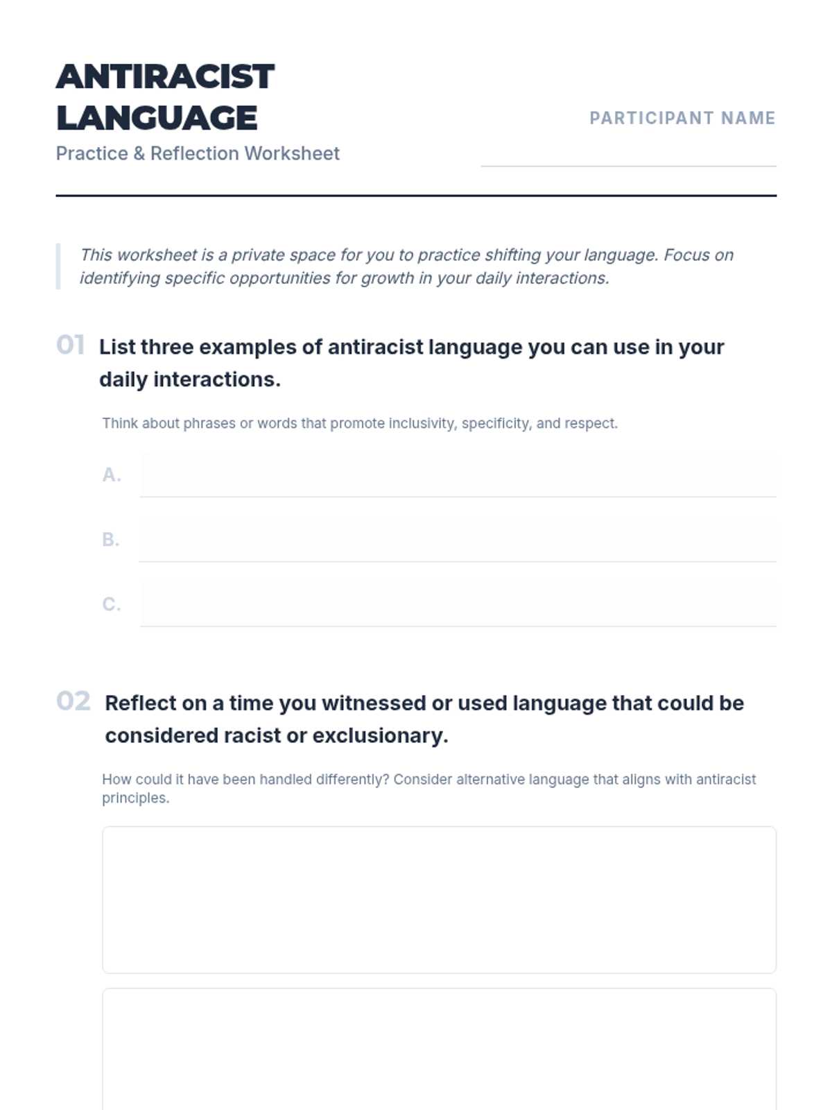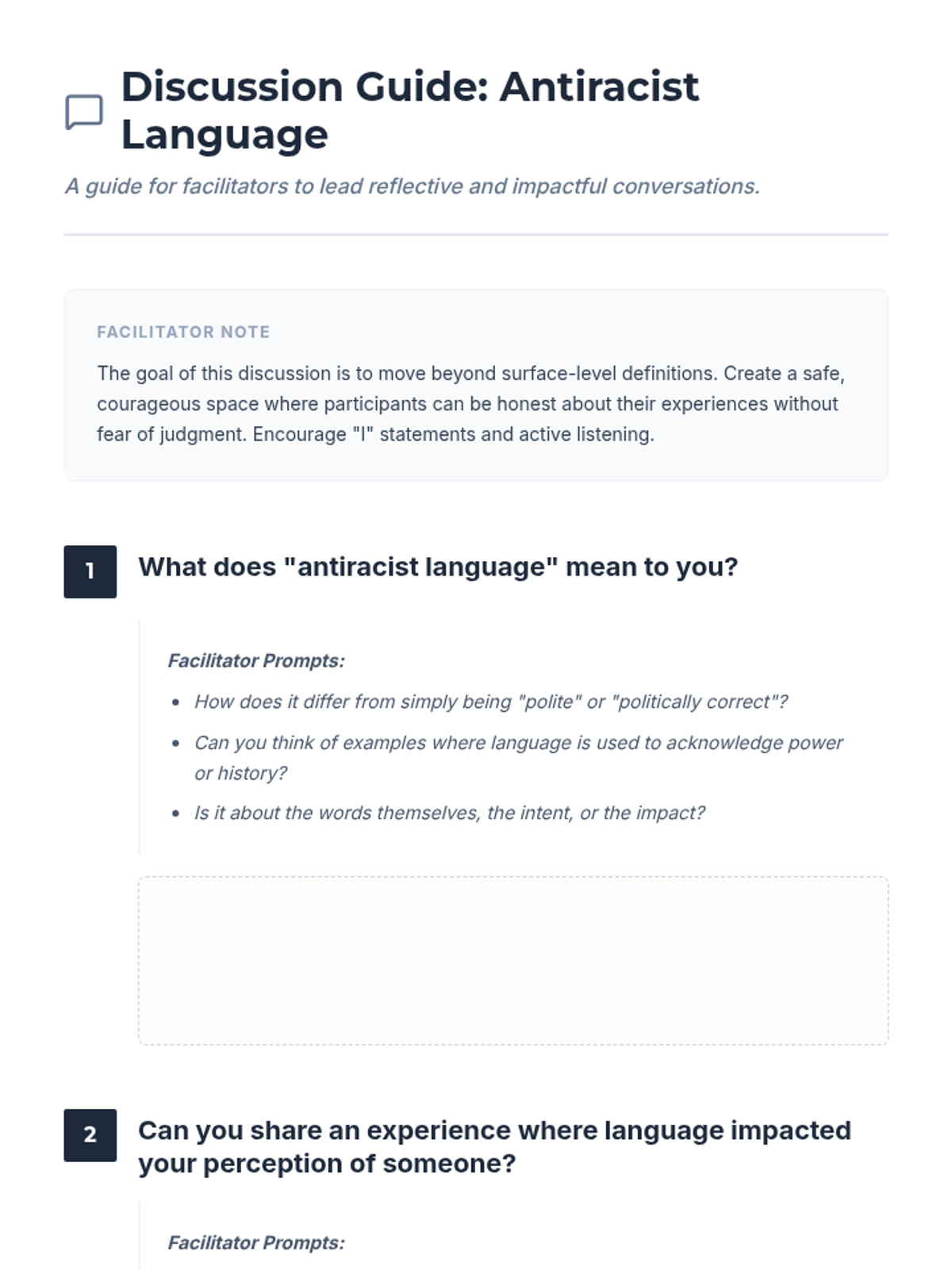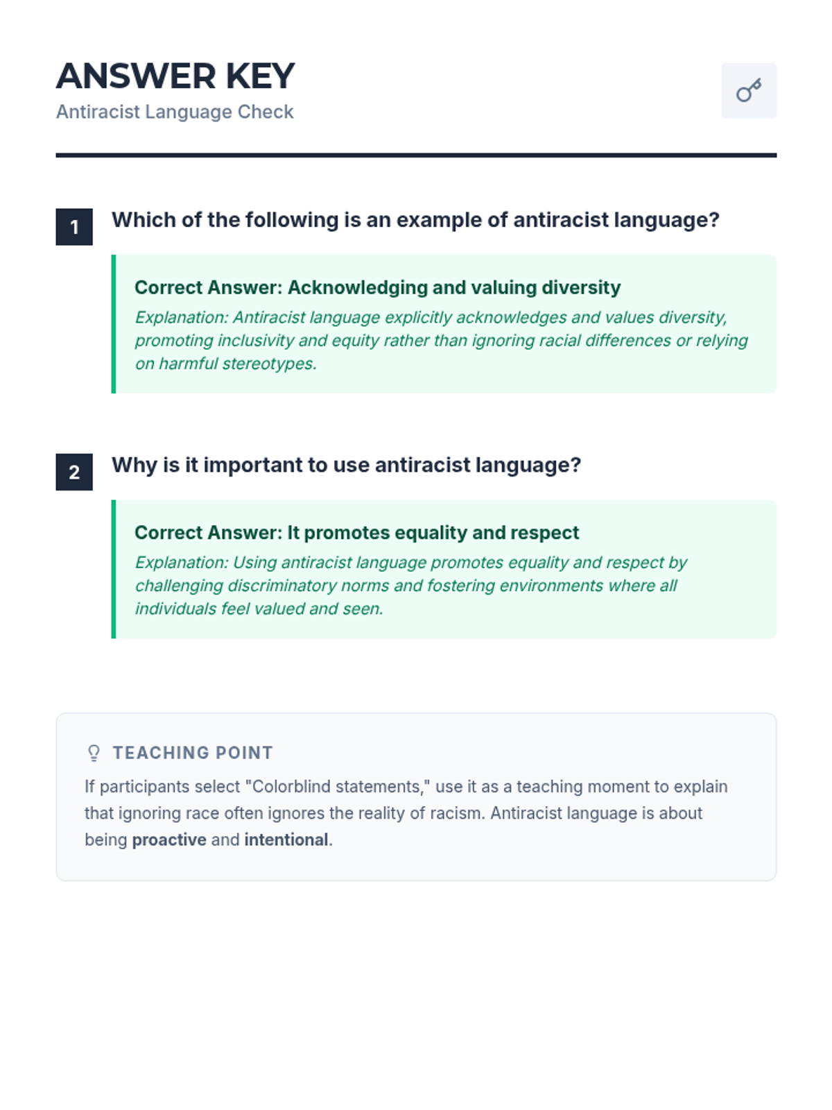 This 30-minute interactive lesson for adults focuses on understanding and practicing antiracist language. Participants explore the impact of words on perceptions and learn concrete strategies for fostering inclusive, respectful communication in daily interactions.
