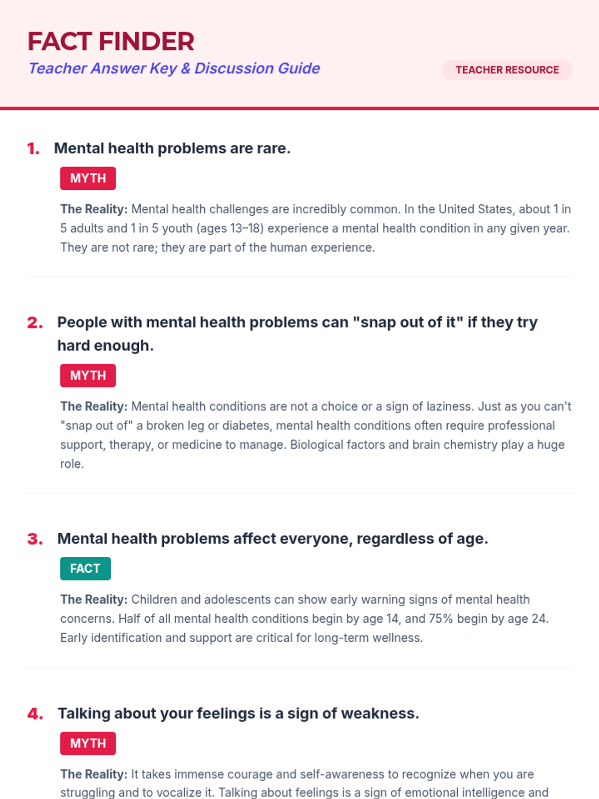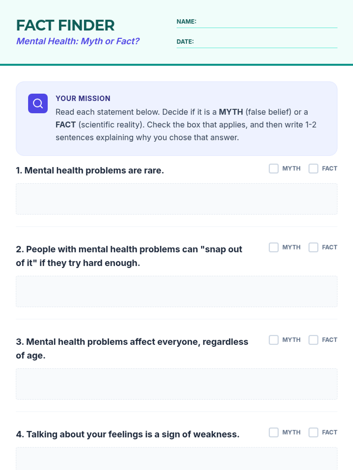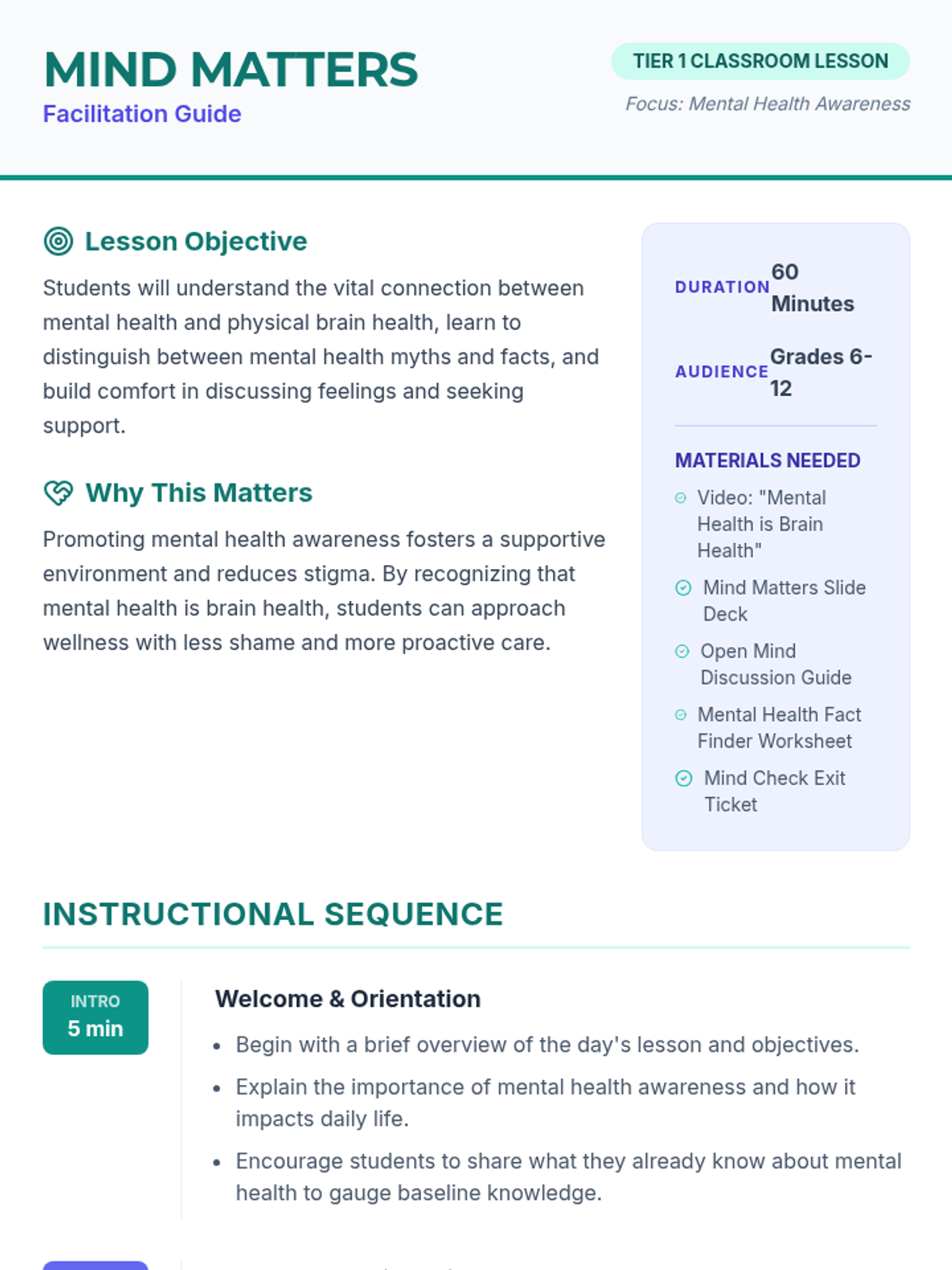 This lesson explores the vital connection between mental health and brain health, aims to dismantle common stigmas and myths, and encourages students to seek support. Through interactive discussions and myth-busting activities, students will build a foundation for proactive mental wellness.