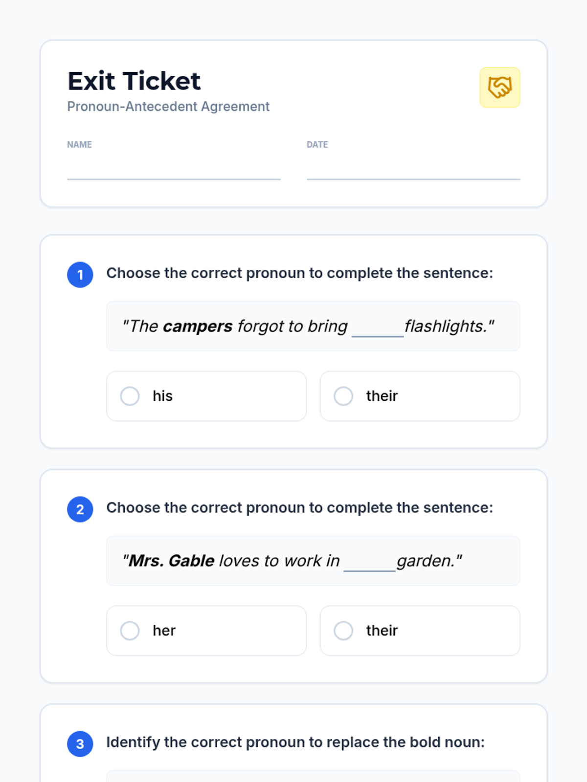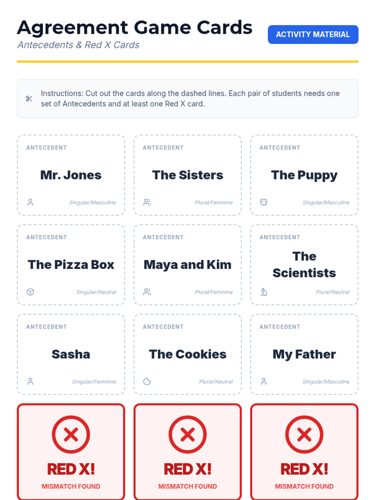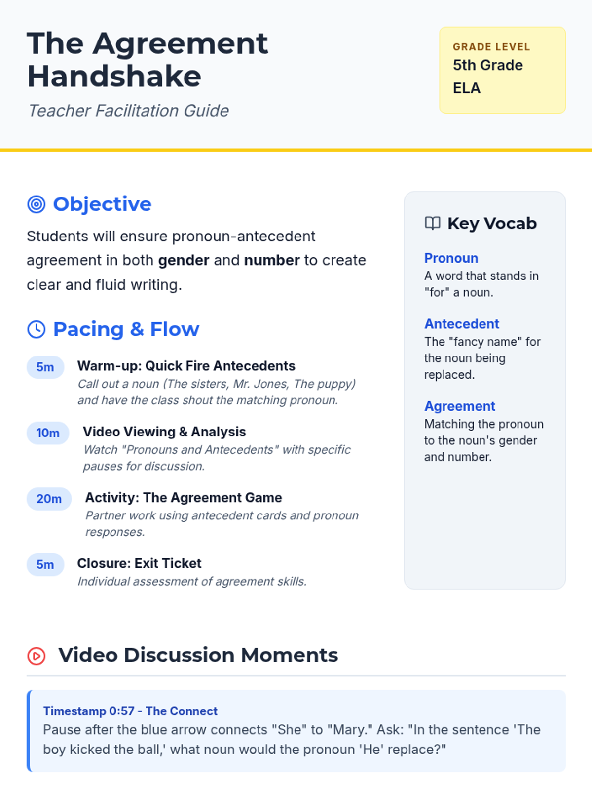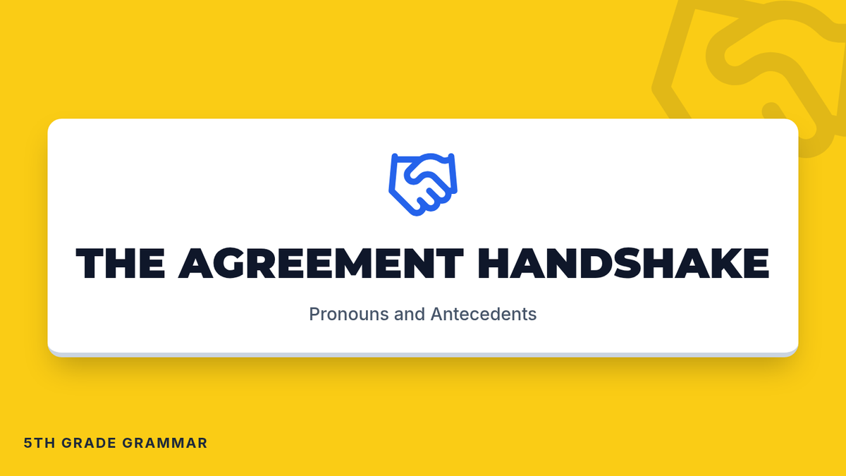 A 5th-grade grammar lesson focusing on pronoun-antecedent agreement in gender and number, featuring a hands-on 'Agreement Game' and interactive video analysis.