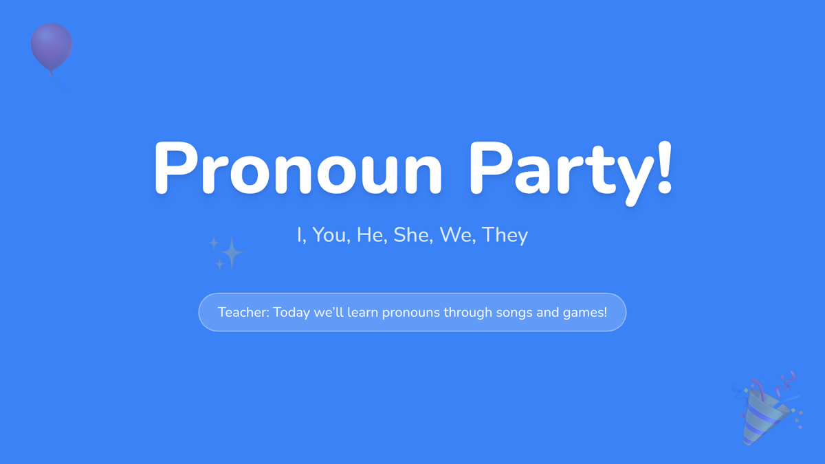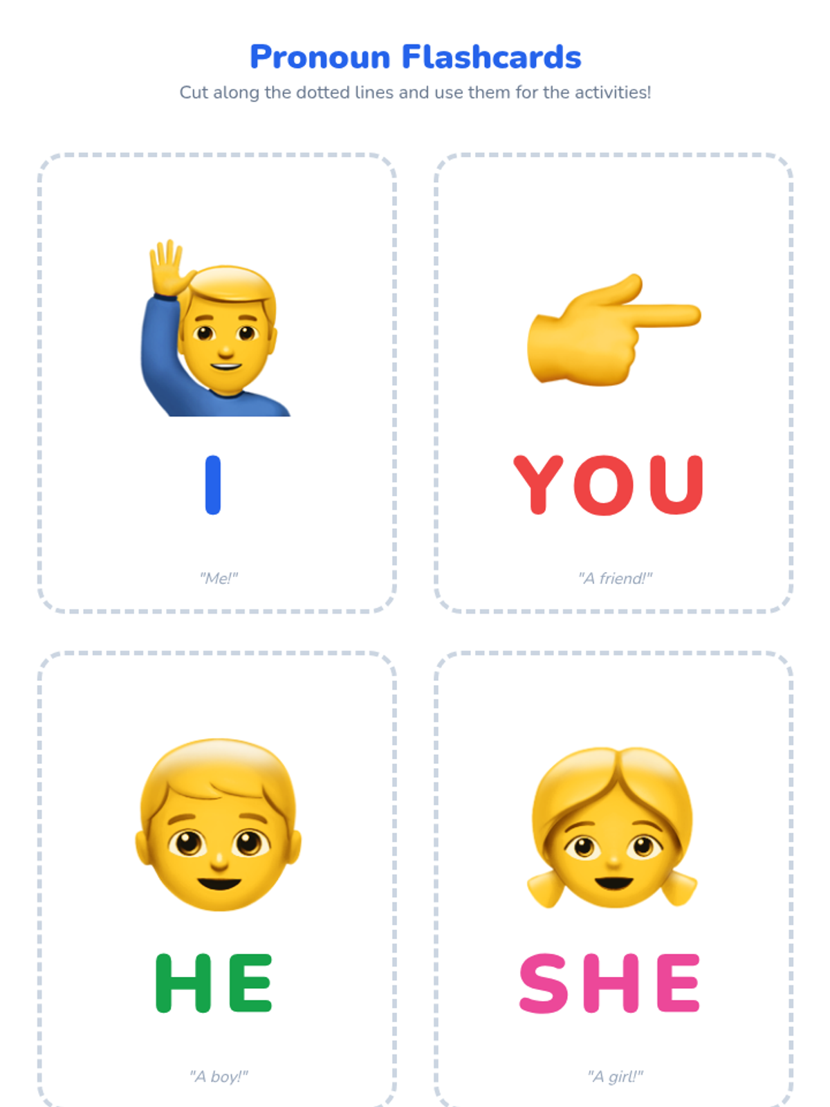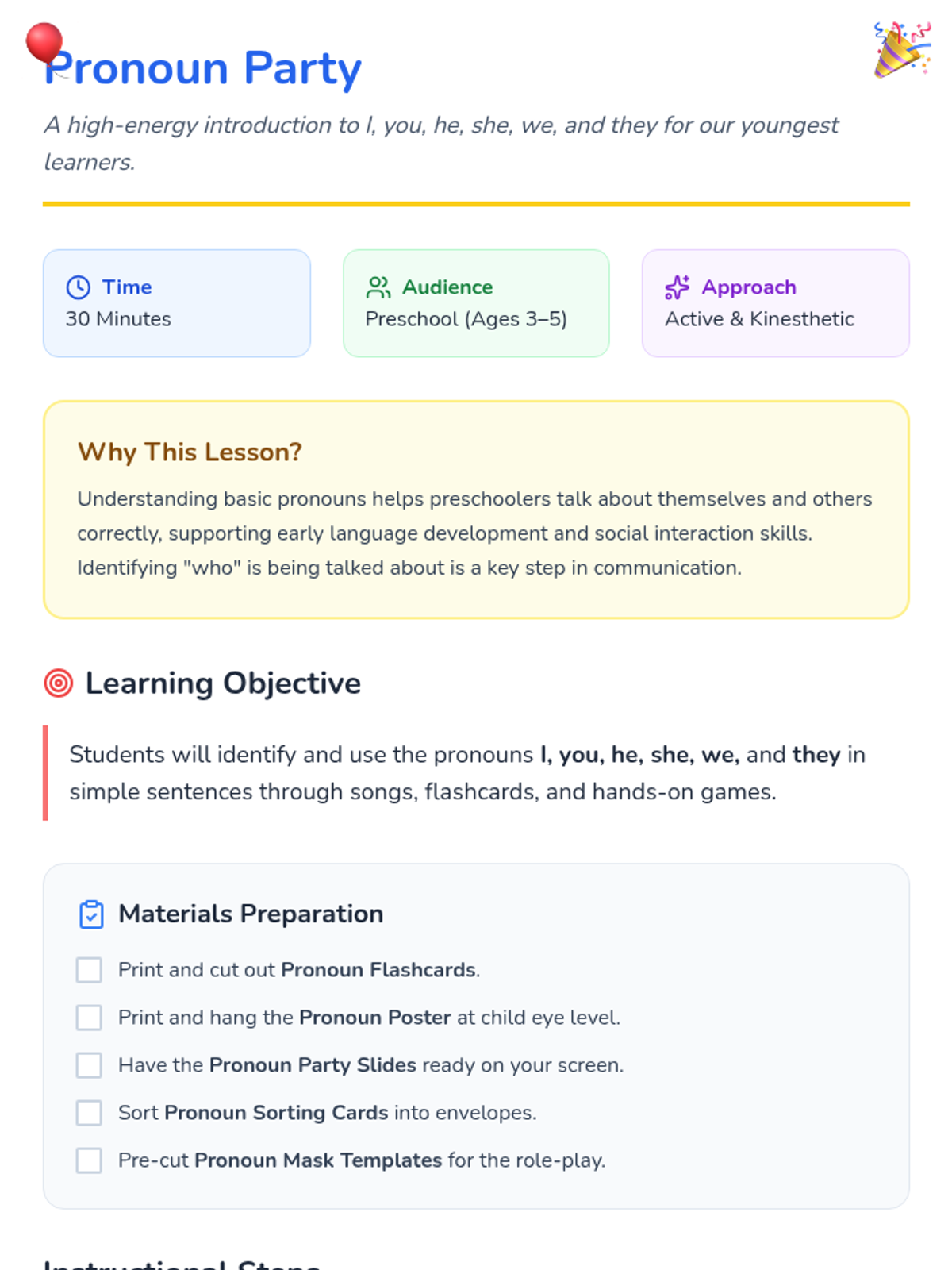 A fun, interactive 30-minute lesson to teach preschoolers essential pronouns (I, you, he, she, we, they) through songs, games, and hands-on activities.