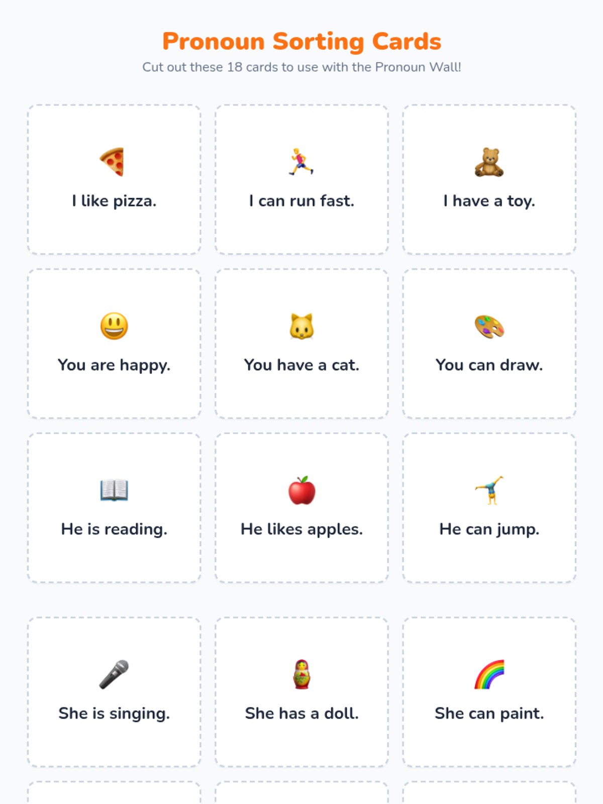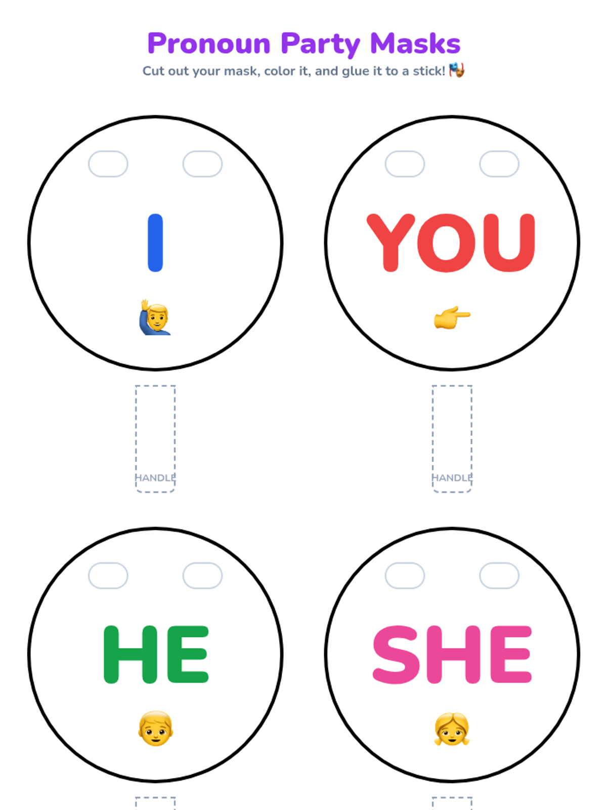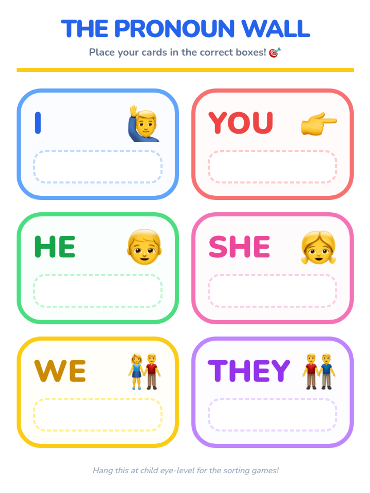 A fun, interactive 30-minute lesson to teach preschoolers essential pronouns (I, you, he, she, we, they) through songs, games, and hands-on activities.