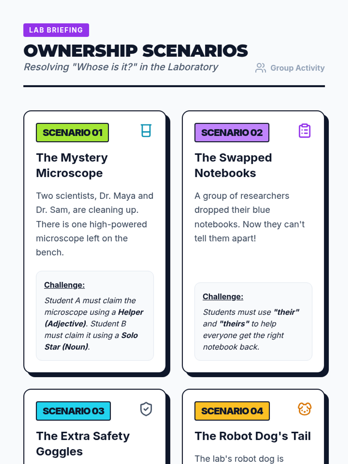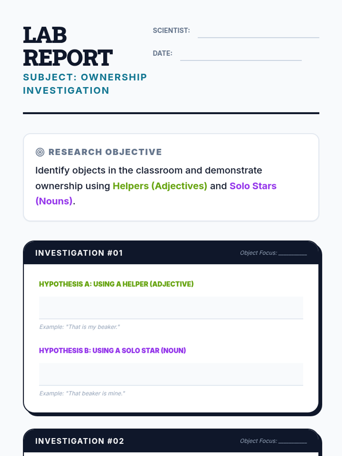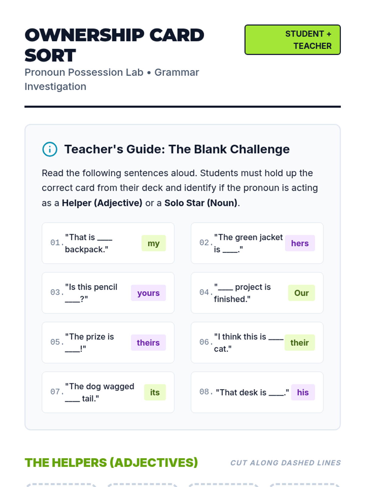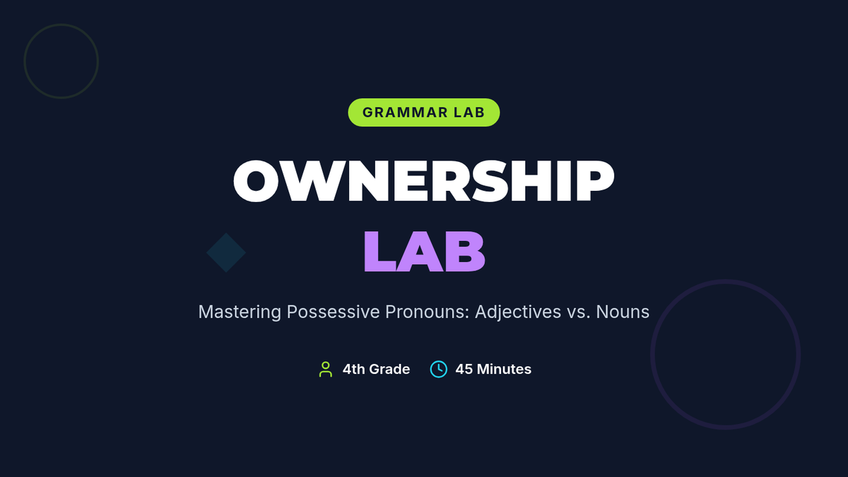 Students learn to distinguish between possessive pronouns acting as adjectives and those acting as nouns through a Khan Academy video, interactive card sorting, and classroom-based writing.